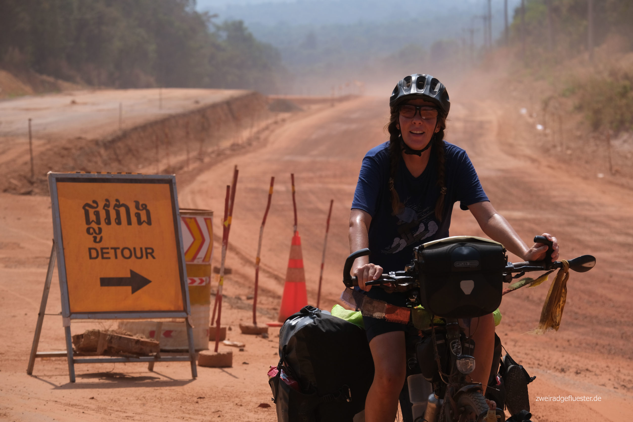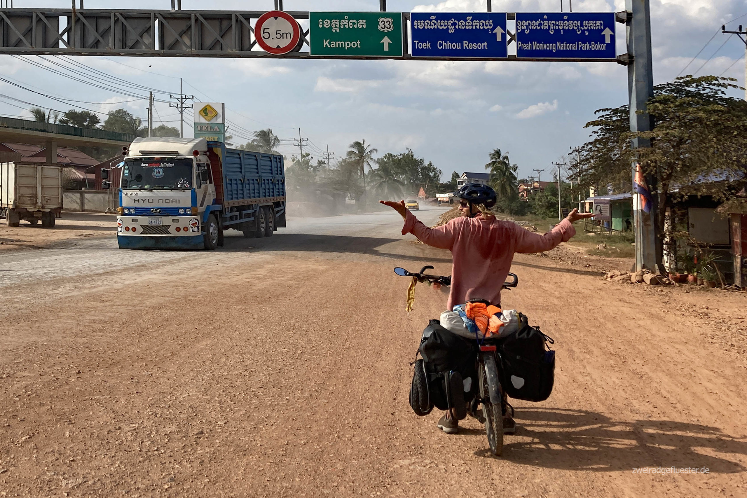 Wir strampeln den Highway 3 aus der Stadt hinaus. Leichter Rückenwind lässt uns auf der gut asphaltierten Straße mit Seitenstreifen nur so fliegen. Doch wir wissen, von Erzählungen, was uns auf dem zweiten Teil der Strecke von Kampot nach Prey Nob erwartet. Zum ersten Mal auf unserer Reise stülpen wir uns freiwillig eine Maske beim Radeln über. Der Highway verwandelt sich in eine staubige Buckelpiste. Wenn die LKW an uns vorbei tuckern, machen sie das glücklicherweise sehr gemächlich, aber was anderes gibt der Untergrund auch nicht her. Trotzdem versinken wir immer wieder in einer dichten Staubwolke. Manchmal sind die LKW dabei sogar so langsam, dass wir zum Überholmanöver ansetzen müssen.