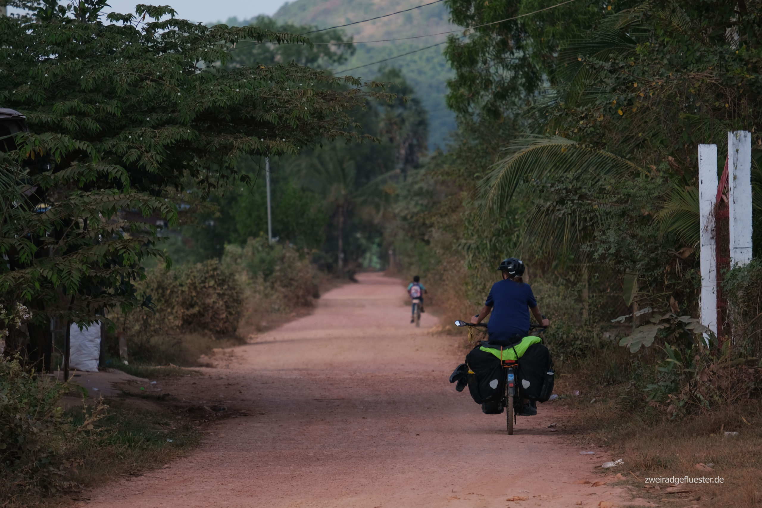 Die ersten Kilometer gleiten wir mit Rückenwind über den glatten Asphalt der leeren Straßen. Wir passieren die Stadt Kep, die uns allerdings eher wie eine Geisterstadt vorkommt. Vielleicht haben wir uns aber auch einfach an den vietnamesischen Trubel gewöhnt und müssen nun die Bezeichnung „Stadt“ erstmal wieder neu ausloten.