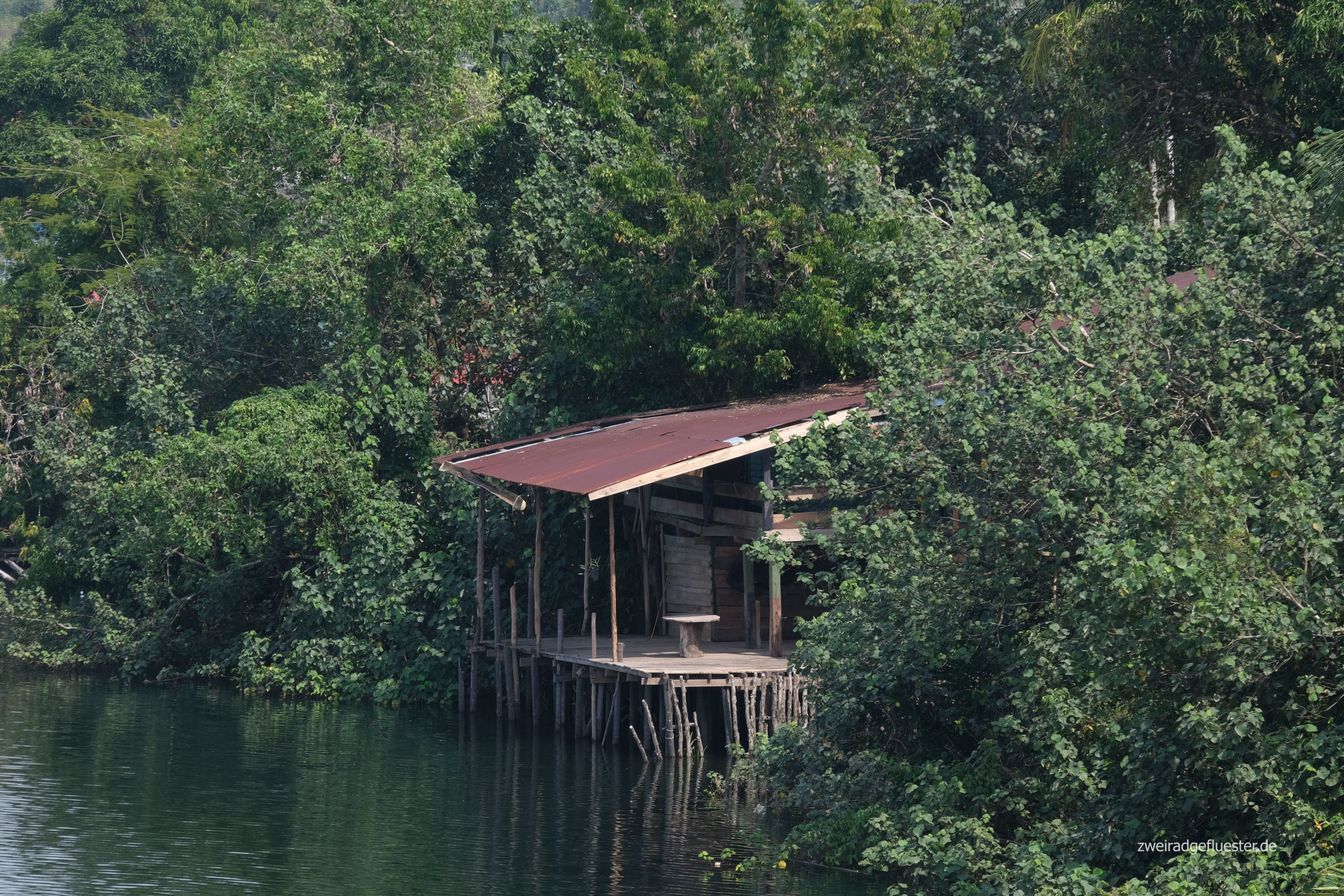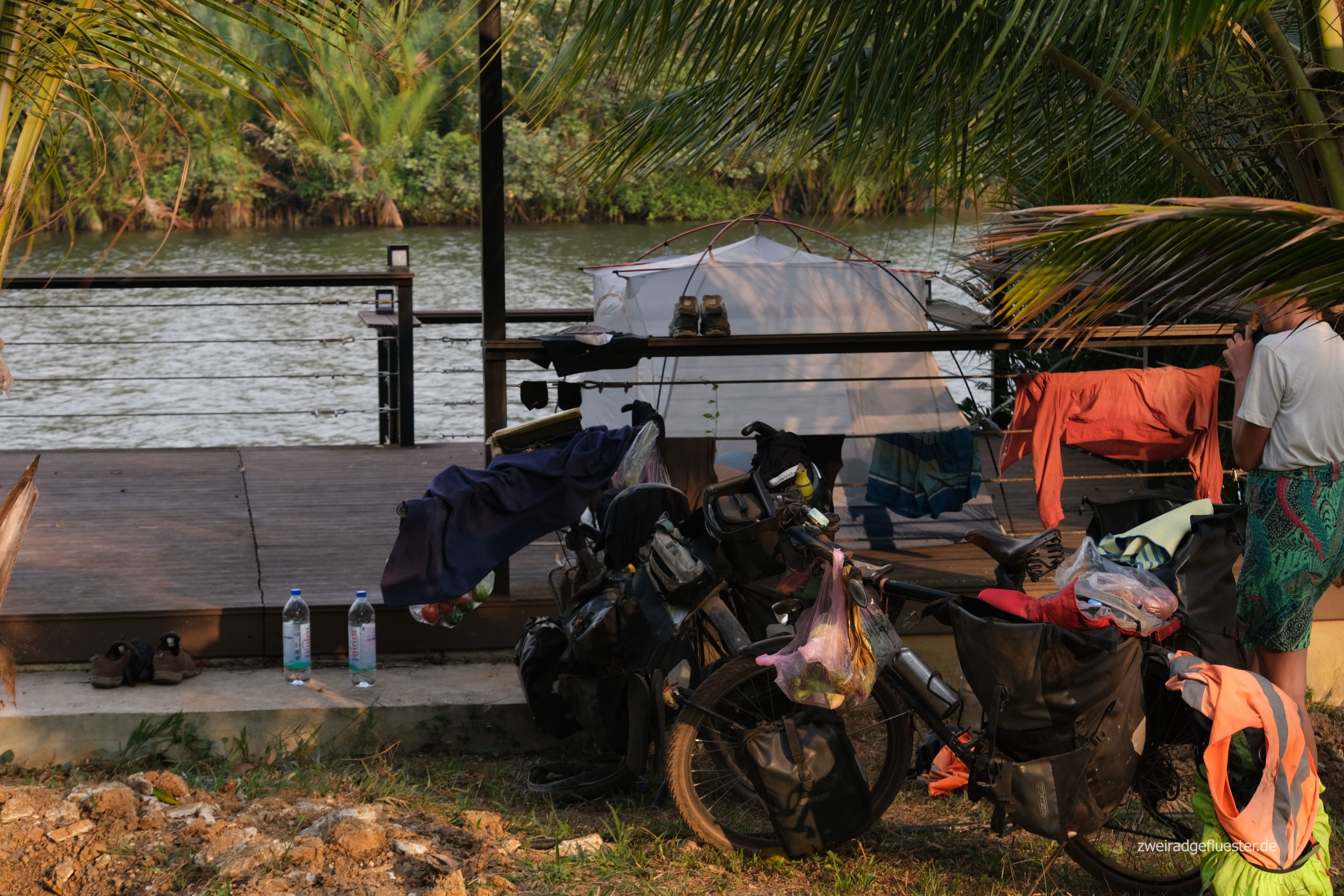 Heute biegen wir irgendwann auf eine kleine Schotterpiste ab, um einen Schlafplatz zu finden. Leider ist das Flussufer nicht so leicht zugänglich und häufig als Privatgelände abgezäunt. Wir fragen bei einem Homestay nach, ob wir unser Zelt aufstellen dürfen. Allerdings ist uns der Preis zu hoch. Wir suchen weiter. Letztlich landen wir auf einem Bootssteg bei einer netten Familie, die zwar auch irgendeine Art des Campings anbietet, aber was genau, dass konnten wir aufgrund der Sprachbarriere nicht herausbekommen.