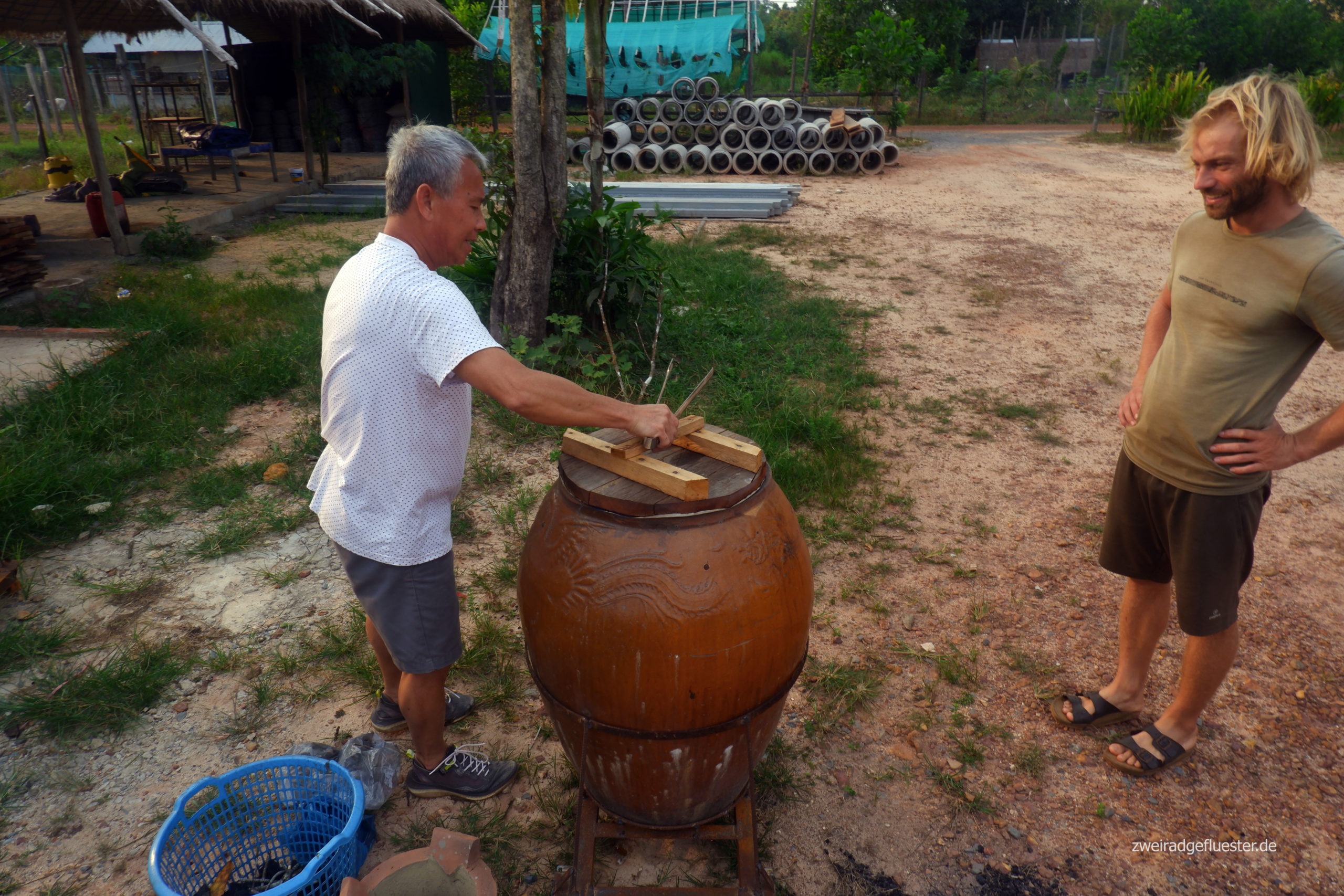 Zurück auf der Farm beginnt dann das große Schlemmen. Die Ente wird in einen traditionellen Steinkrug gehangen und auf Holzkohle, wie in einer Art Ofen, zubereitet. Zum Abendessen finden wir uns dann an einem reichlich gedeckten Tisch wieder und können unser Glück kaum fassen. Es landen, wie wir es bereits auch aus Vietnam kennen, alle Köstlichkeiten auf dem Tisch und jeder kann sich daran bedienen. Es wird alles durcheinandergegessen, egal ob Ente, Auster oder Garnele. Wer trinken möchte, stößt traditionell vorher jedes Mal mit den anderen an. Ein echtes, kambodschanisches Festmahl!
