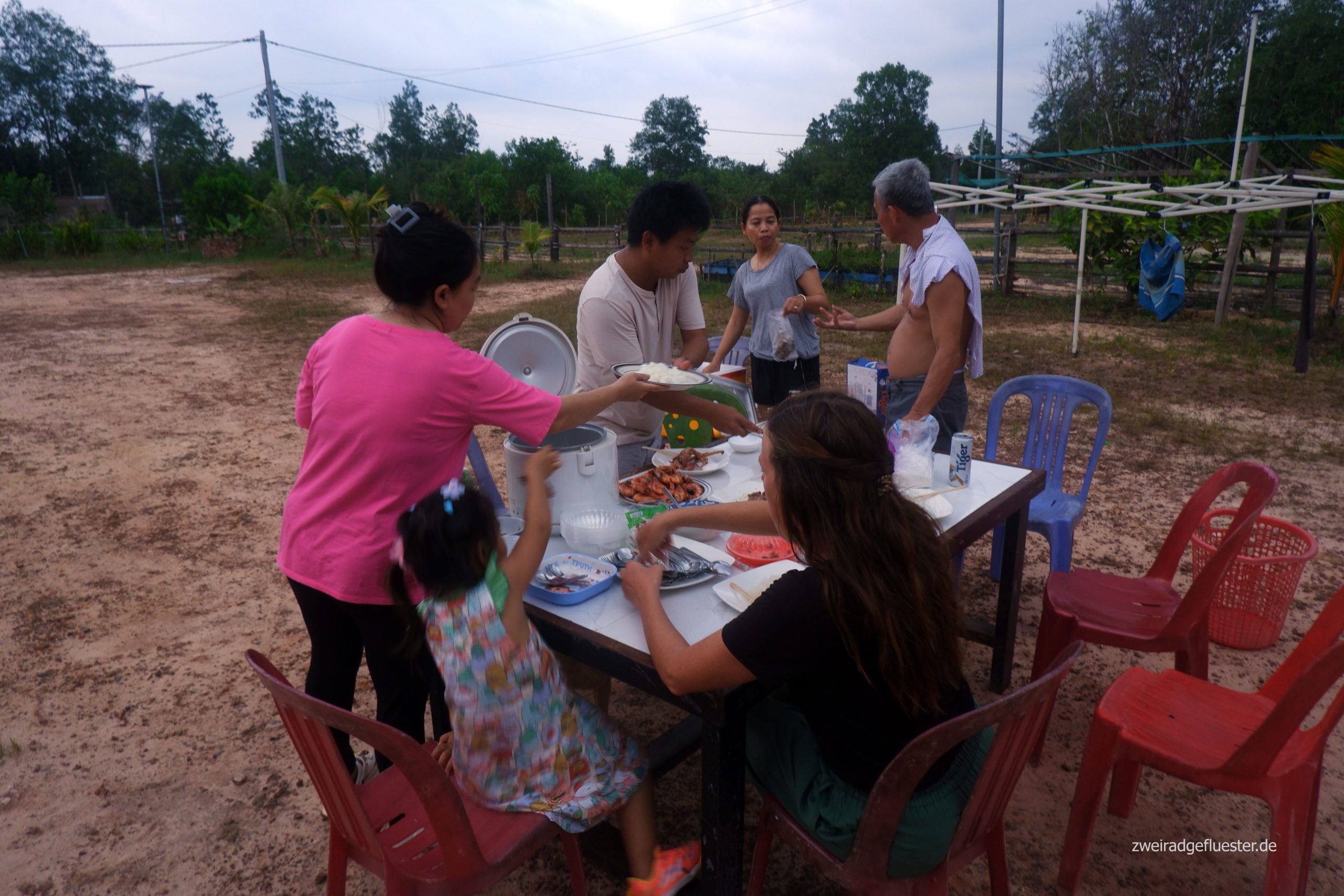 Wir fallen satt, zufrieden und absolut beseelt von dieser überragenden Gastfreundschaft ins Bett! Uns klingen nur noch Kennys Worte vom Mittagessen in den Ohren, dass man in Kambodscha zur Familie gehört, sobald man zum Essen eingeladen wurde, und genauso fühlten wir uns heute den ganzen Tag. Als Bestandteil der Familie.