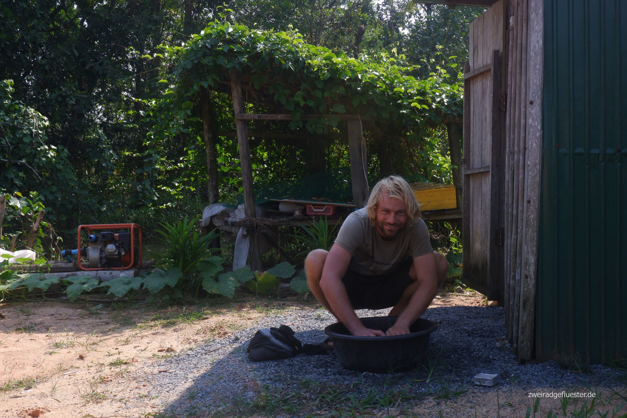 Als wir Koh Kong erreichen, ist es stockdunkel und wir sind einfach nur fertig! Wir genießen die Dusche und schauen dem abfließenden, roten Wasser zu. Ein letztes Mal den rot-braunen, kambodschanischen Staub von der Haut waschen.