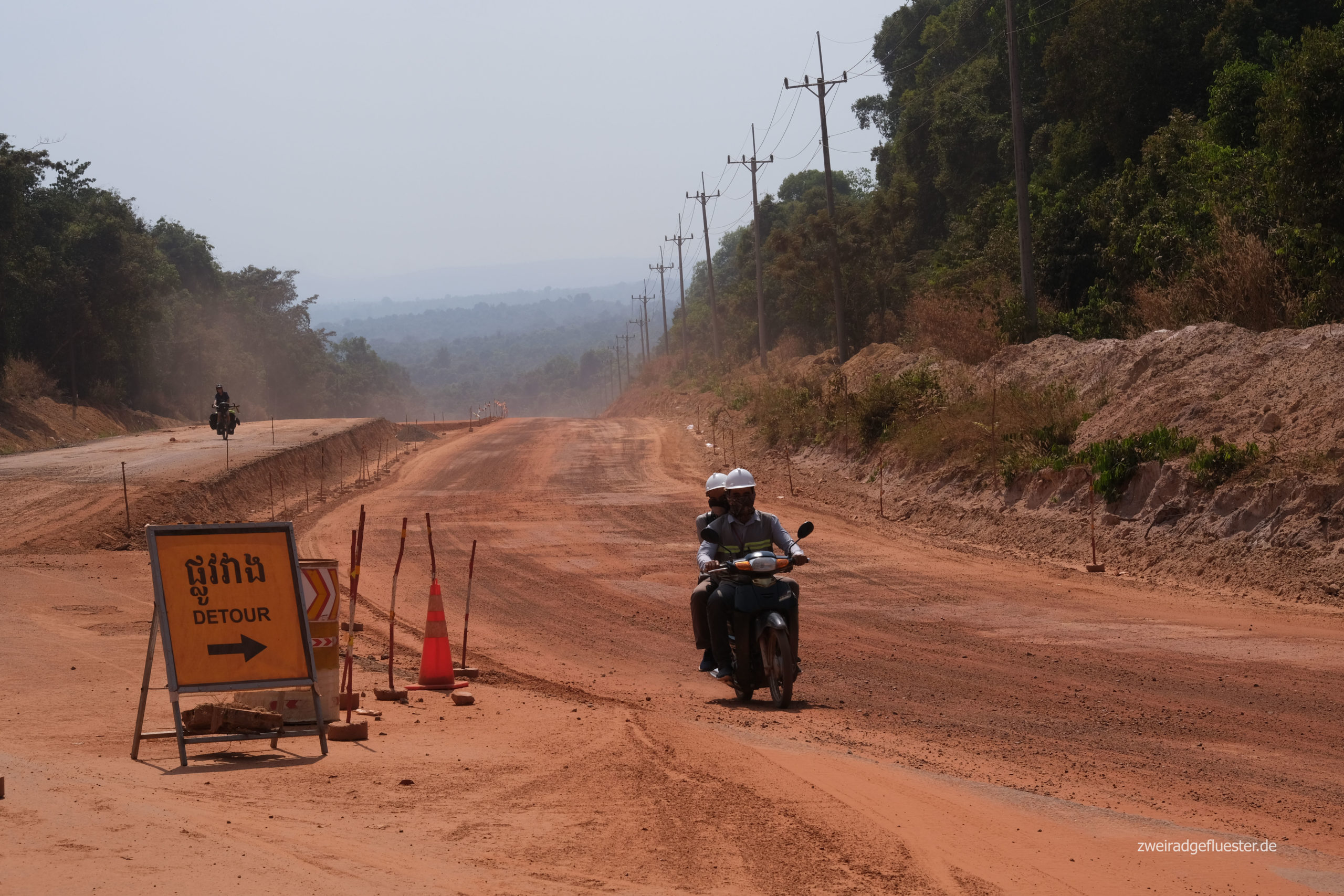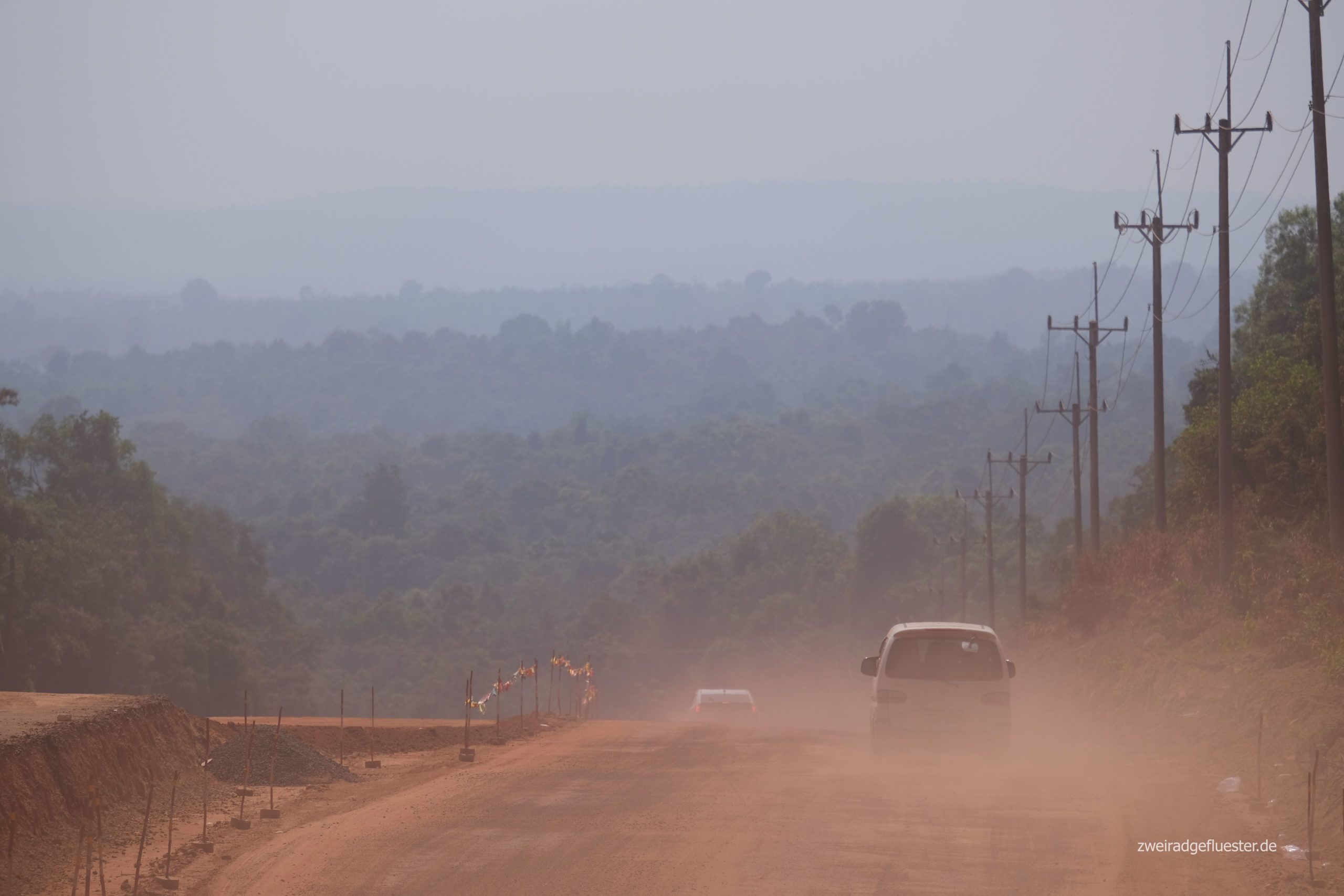 Später häufen sich allerdings die Baustellen auf unserer Strecke! Die prasselnde Sonne von oben und der aufgewirbelte Staub von unten werden auch hier zu unseren ständigen Begleitern. Die Geräusche vom Vormittag weichen dem Lärm von Baufahrzeugen, LKW und Motorrädern. Der rote Staub ist überall und er bedeckt die erste Baumreihe neben der Straße mit einer dicken Schicht, der Wald hat seine Frische verloren.