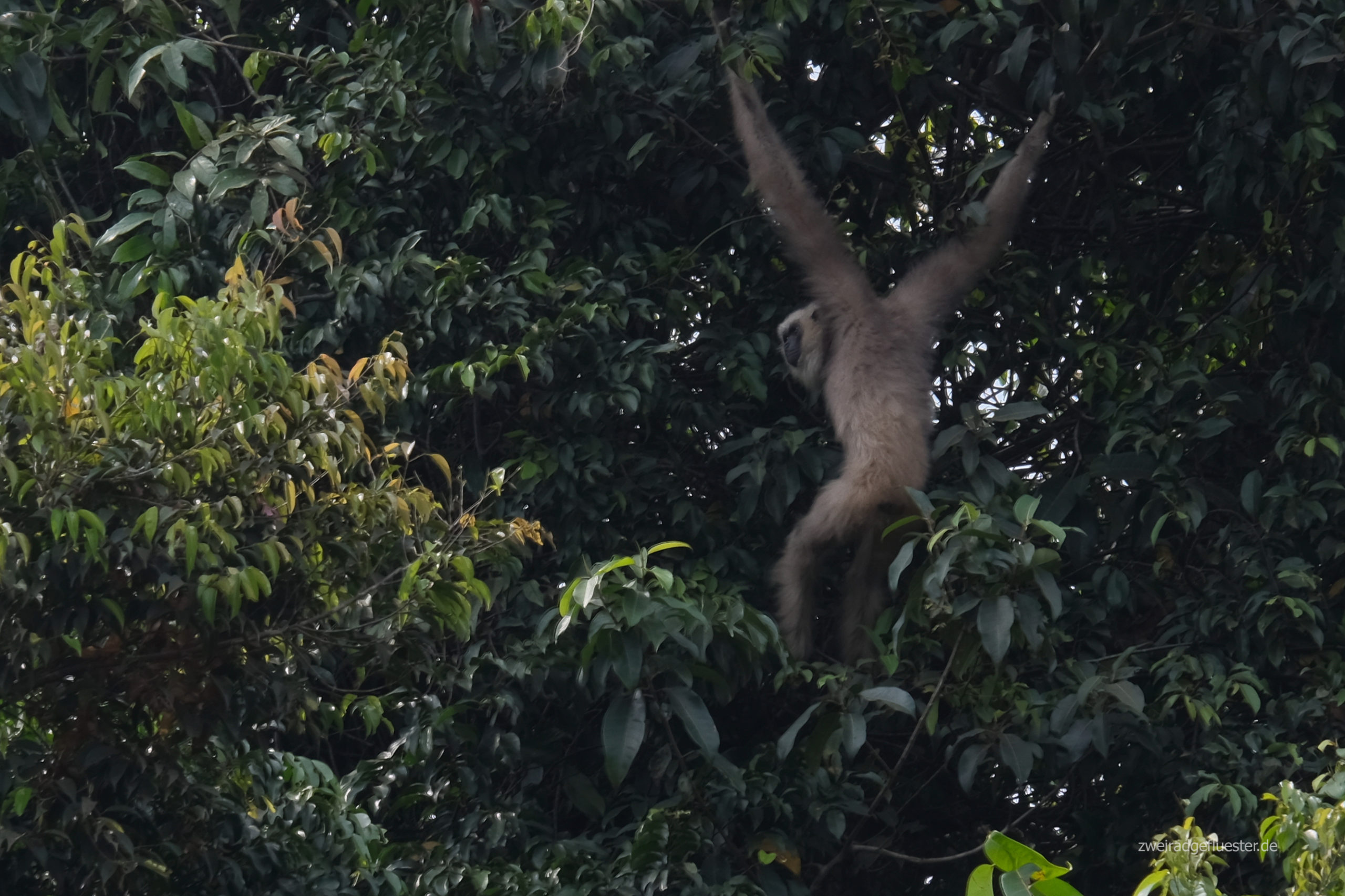 Plötzlich entdecken wir menschenähnliche Gestalten in den Baumwipfeln. Wir trauen unseren Augen zunächst kaum. Doch dann schwingen sich die Menschenaffen auch schon an ihren langen Armen akrobatisch hangelnd durch die Baumkrone, um sich vor uns zu verstecken. Wir haben tatsächlich Gibbons in freier Wildbahn entdeckt. Wir können unser Glück kaum fassen!