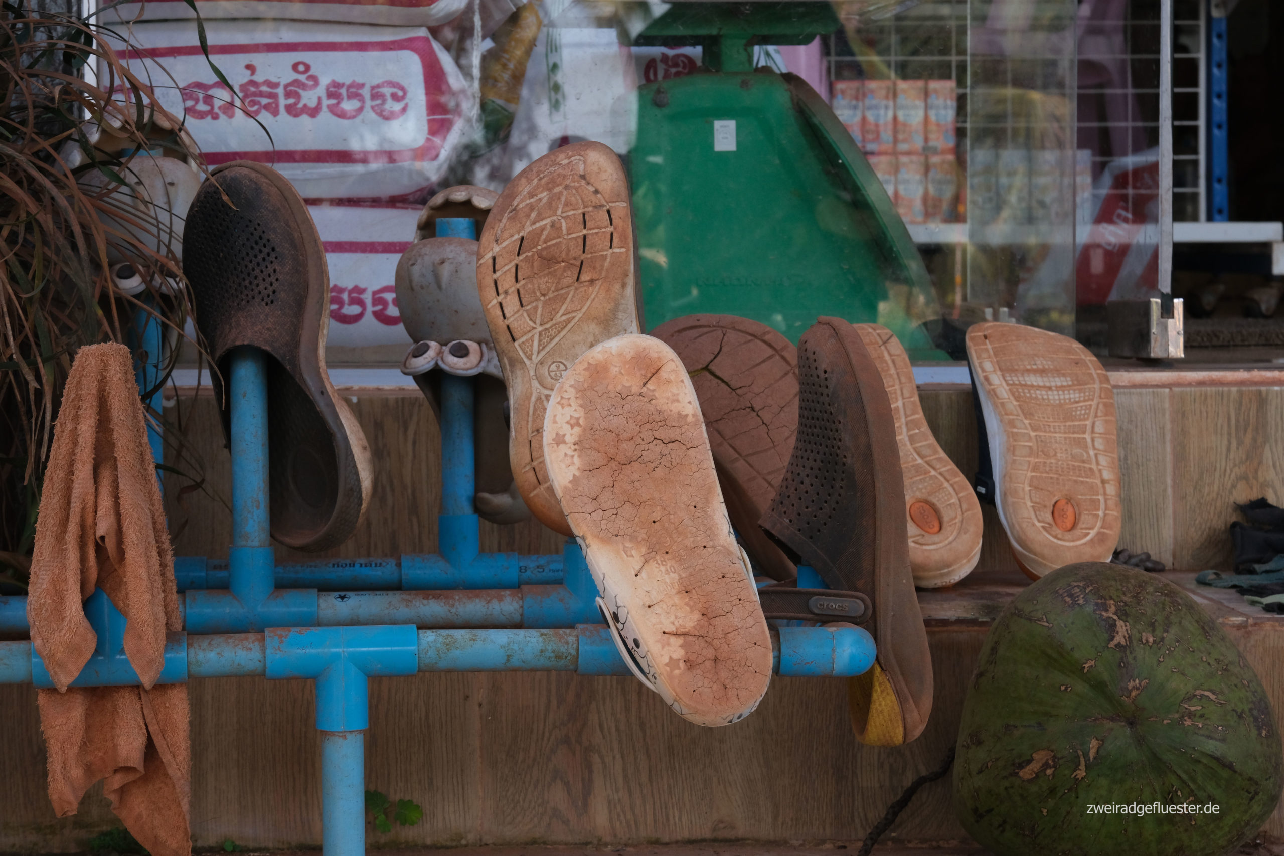 In Kambodscha kann man neben Riel auch mit US-Dollar zahlen. Es wirkt etwas suspekt, aber vor allem im städtischen Raum ist der Dollar omnipräsent. Wenn man sich die Riel anschaut, können wir das nur nachvollziehen. Es sind für uns die unübersichtlichsten Banknoten der Reise. Die Farben der unterschiedlichen Noten sind sich sehr ähnlich und dazu gibt es nur eine Ecke je Schein, auf dem der Wert mit den vielen Nullen, in arabischen Ziffern steht. Wir schieben der Hausherrin also einen 10- Dollar Schein rüber und damit ist die Nacht bezahlt.