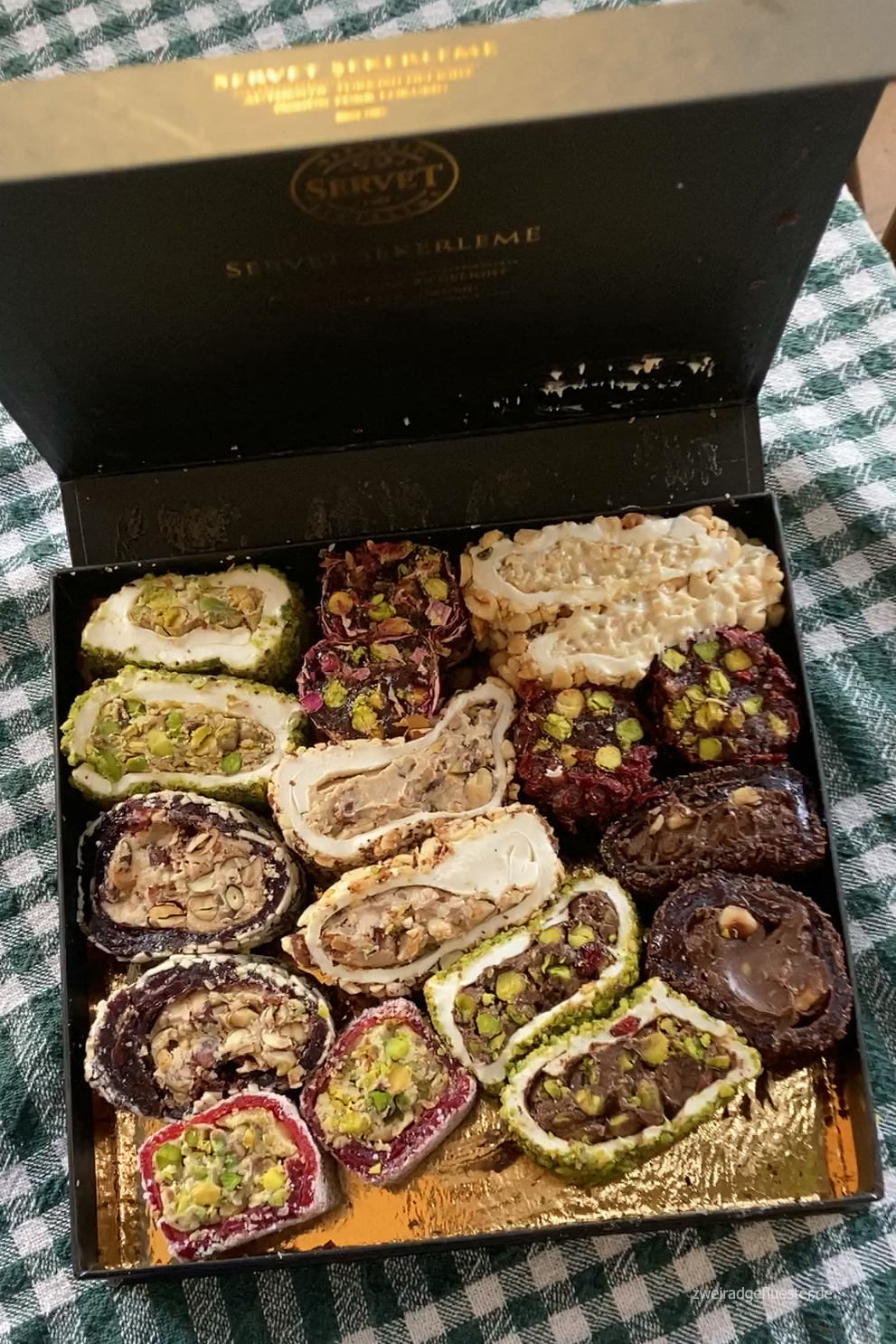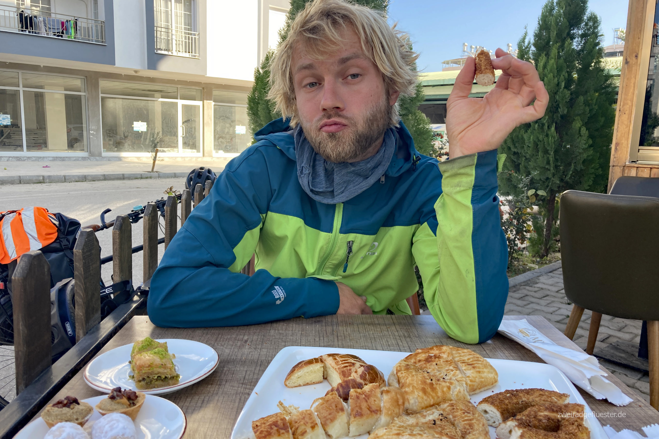 Bevor wir uns wieder auf den Weg begeben, schauen wir in einem kleinen Lokum-Laden vorbei. Mit viel zu großen Augen und einem unterlegenen Verhandlungsgeschick der Verkäuferin gegenüber, lassen wir uns eine riesige Box zusammenstellen. Es ist ja nicht so, dass wir diese Leckereien nicht essen wollen, sondern dass wir jetzt schlicht ein Kilo mehr Ballast die Berge hinaufbefördern müssen.
