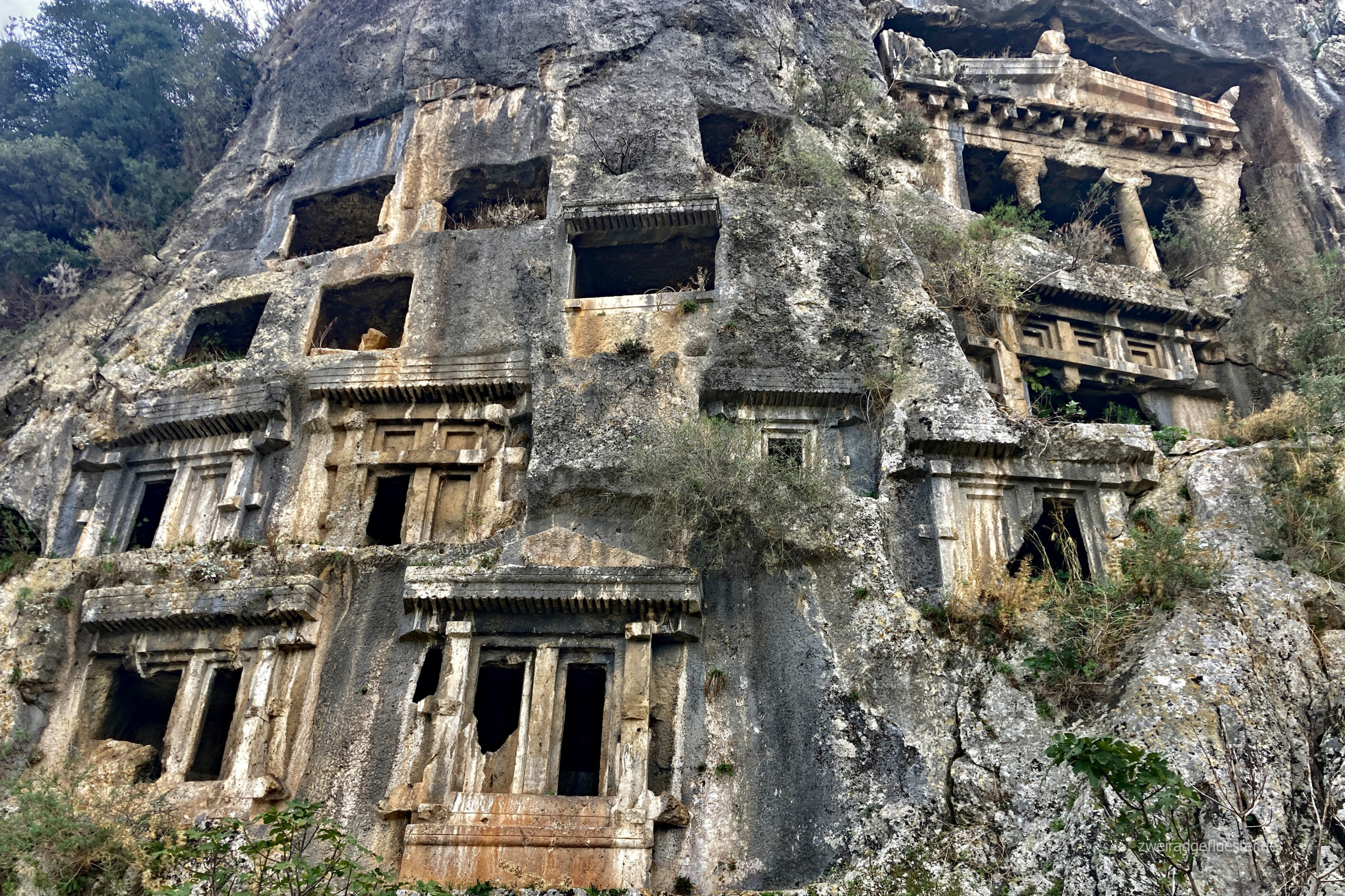 Was vor uns liegt ist das gebirgige Land der Lykier, die vor ca. 4.000 Jahren hier an der Küste gesiedelt haben und wovon viele Ruinen zeugen. Aufgrund der hohen Berge lebten sie lange geografisch abgeschieden von der Umwelt. Durch Diplomatie und Handelsgeschick, gelang es ihnen viele Jahre weitestgehend unabhängig von großen Imperien wie z. B. den Römern zu existieren. Sie hatten nicht nur ihre eigene Sprache und eigene Götter, sondern auch eine eigene Schrift. Die auffälligsten Hinterlassenschaften der Lykier aber gehören den Toten. Etliche Felsgräber sind wie Waben in die schroffen Felswände gehauen.