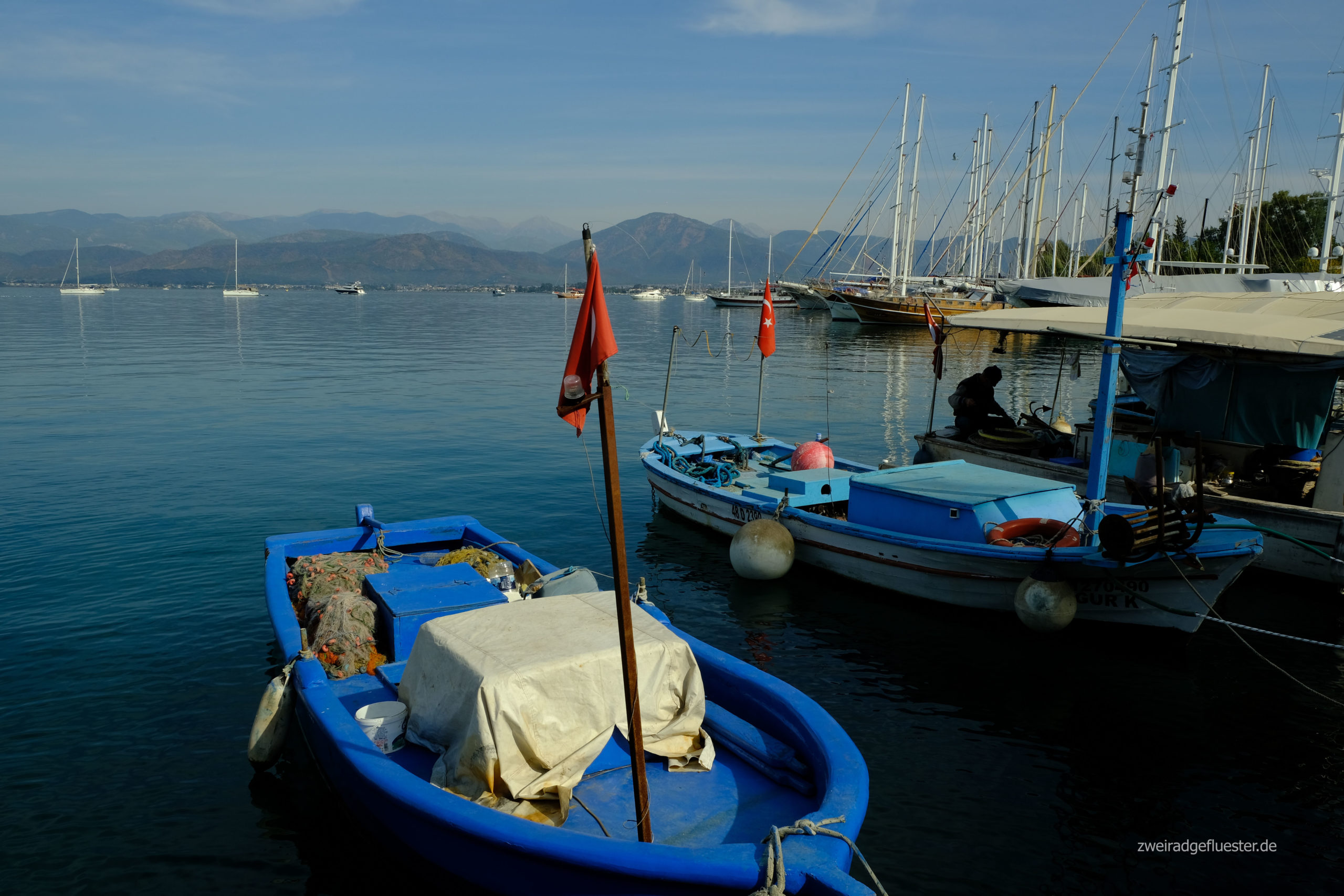 Schon bei der Abfahrt aus den Bergen in Richtung Mittelmeer wird es mit jedem Höhenmeter wärmer. In Fethyie erwartet uns traumhaftes Spätsommerwetter. Wir haben es wohl noch ein letztes Mal geschafft dem Herbst davon zu fahren. Wir bleiben ein paar Tage und genießen das schöne Panorama der Stadt, die sich zwischen die großen Berge und das türkisblaue Meer mit all den kleinen Inseln zwängt.