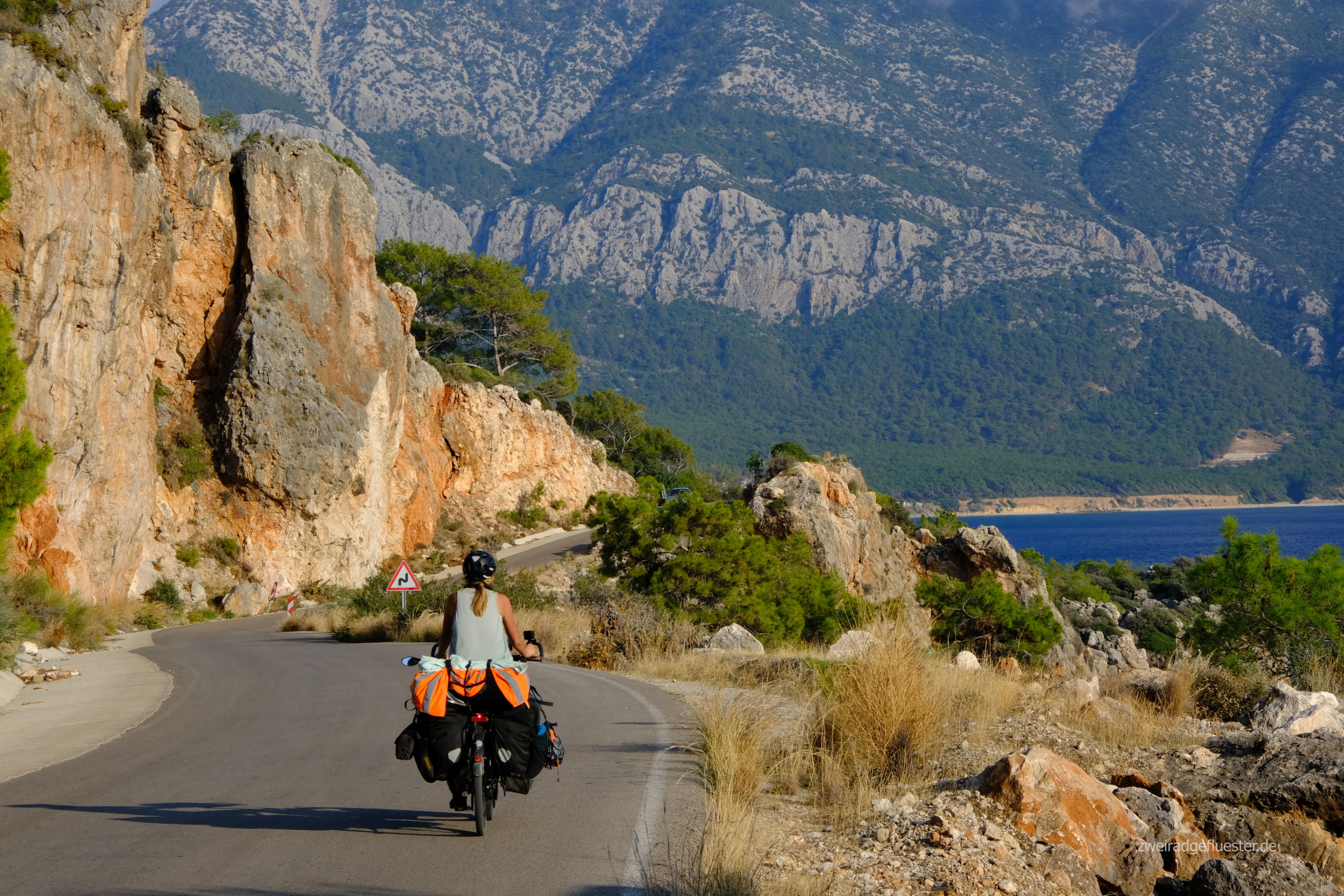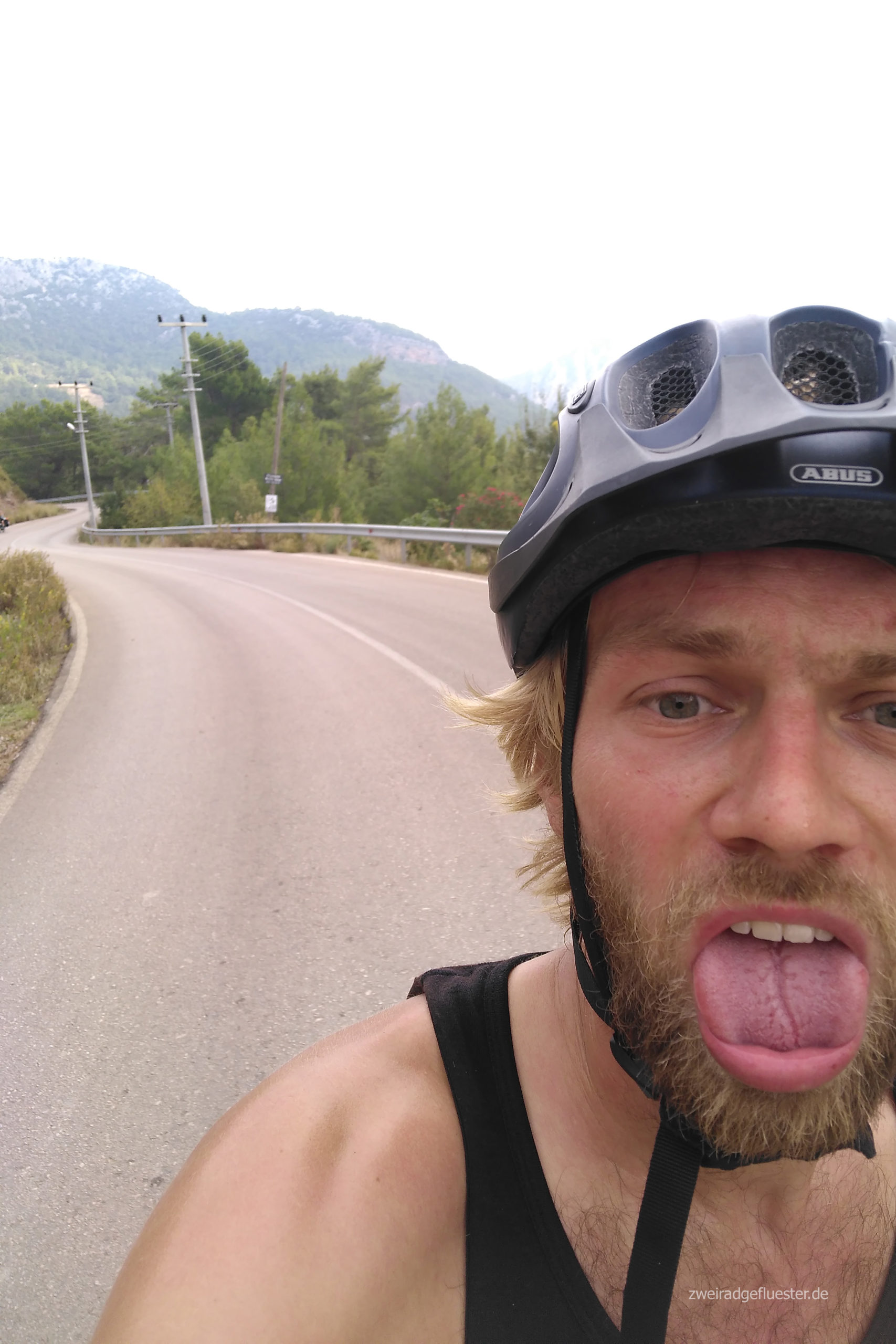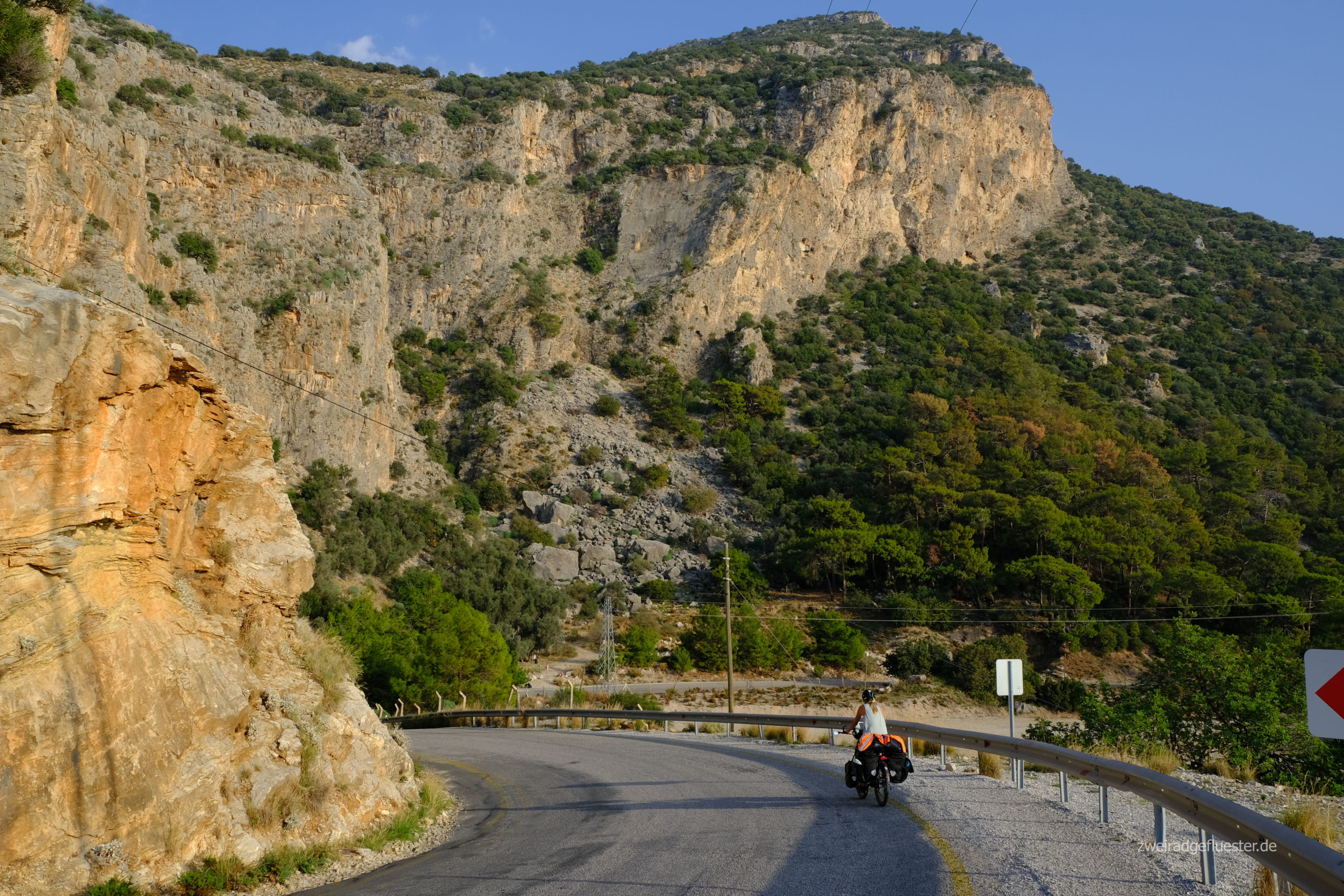 Die Bergetappe hin zum Mittelmeer steckt uns noch immer gut in den Beinen, denn mit der Erschöpfung ist es ja so eine Sache, man spürt sie erst richtig, wenn man mal zur Ruhe kommt. Entsprechend ausgelaugt sitzen wir nach unseren zwei Tagen Pause wieder auf den Rädern, als wir Fethyie verlassen. In dieser Verfassung stehen wir an einer Kreuzung und müssen uns entscheiden, wie wir die vor uns liegende Landzunge überwinden wollen. Nehmen wir den flacheren Weg über die Bundesstraße oder doch die kleine, steile Bergetappe. Nunja wir entscheiden uns mal wieder für die schweißtreibende, anstrengende aber auch wunderschöne Variante.