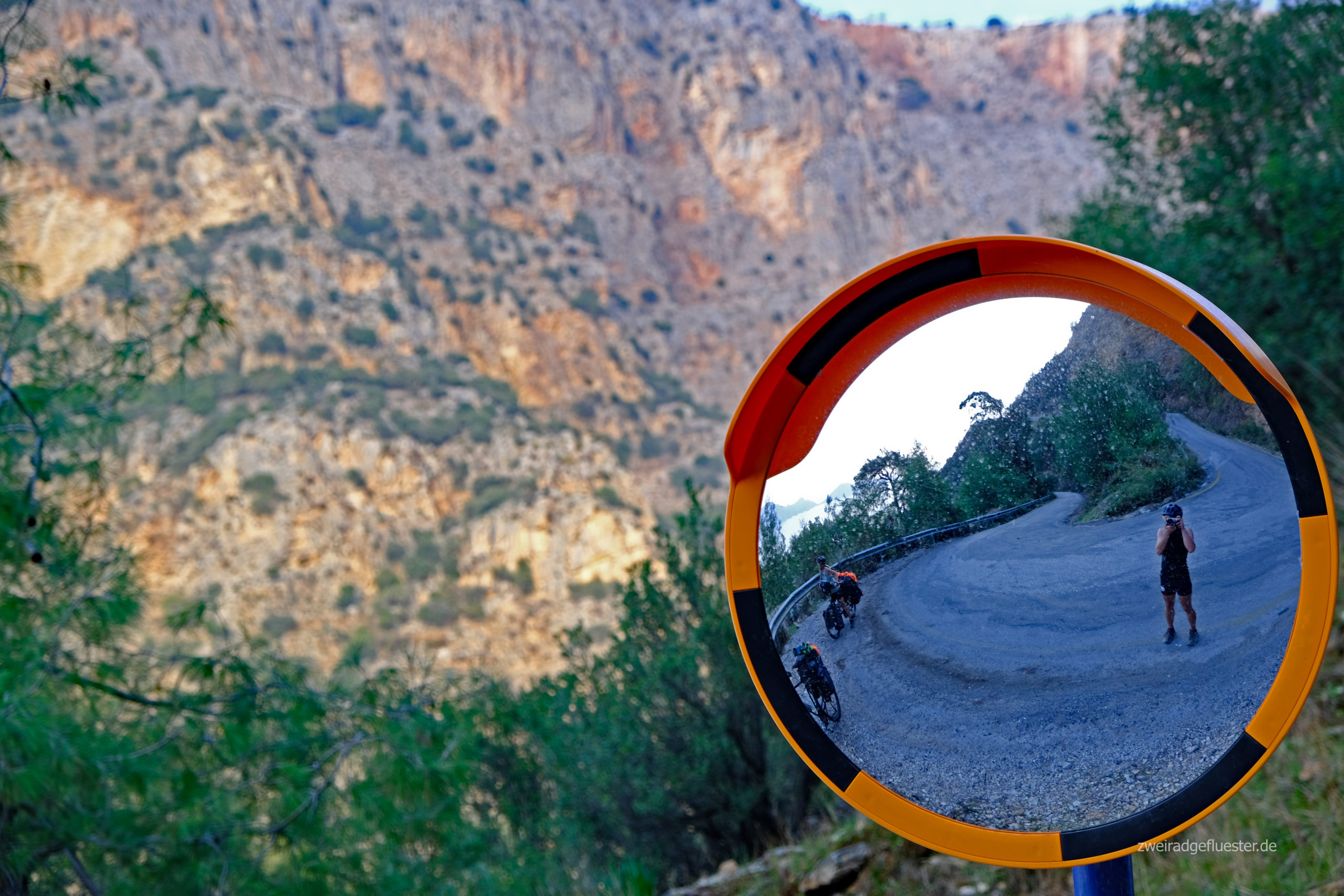 Am nächsten Tag befördern wir etwas müde vom ganzen Kikeriki unsere gut bepackten Räder noch weiter nach oben. Eine kleine Straße führt in unzähligen Serpentinen immer weiter nach oben. Das uns umgebende Bergpanorama ist eindrucksvoll! Massiv! Überwältigend!