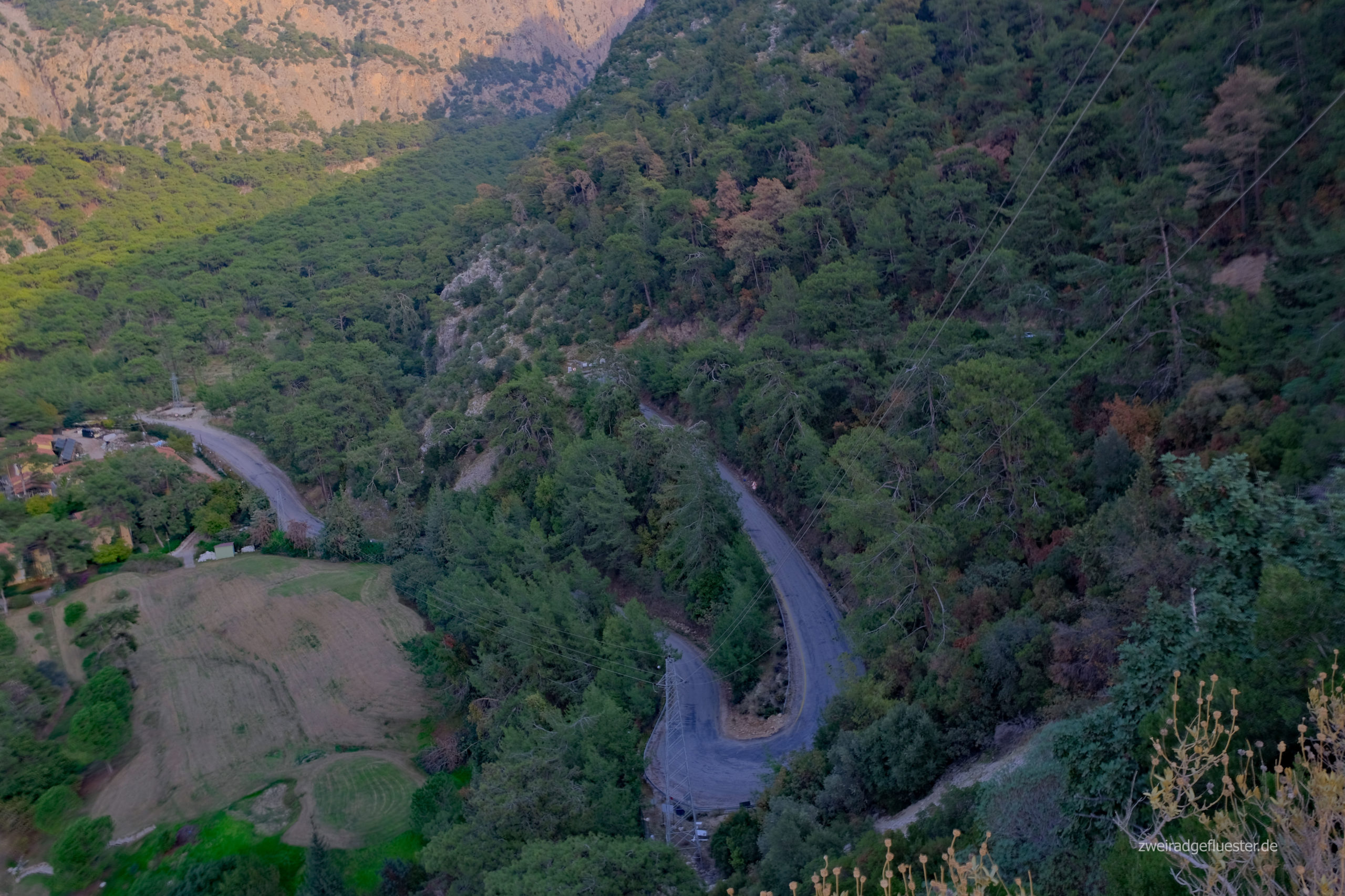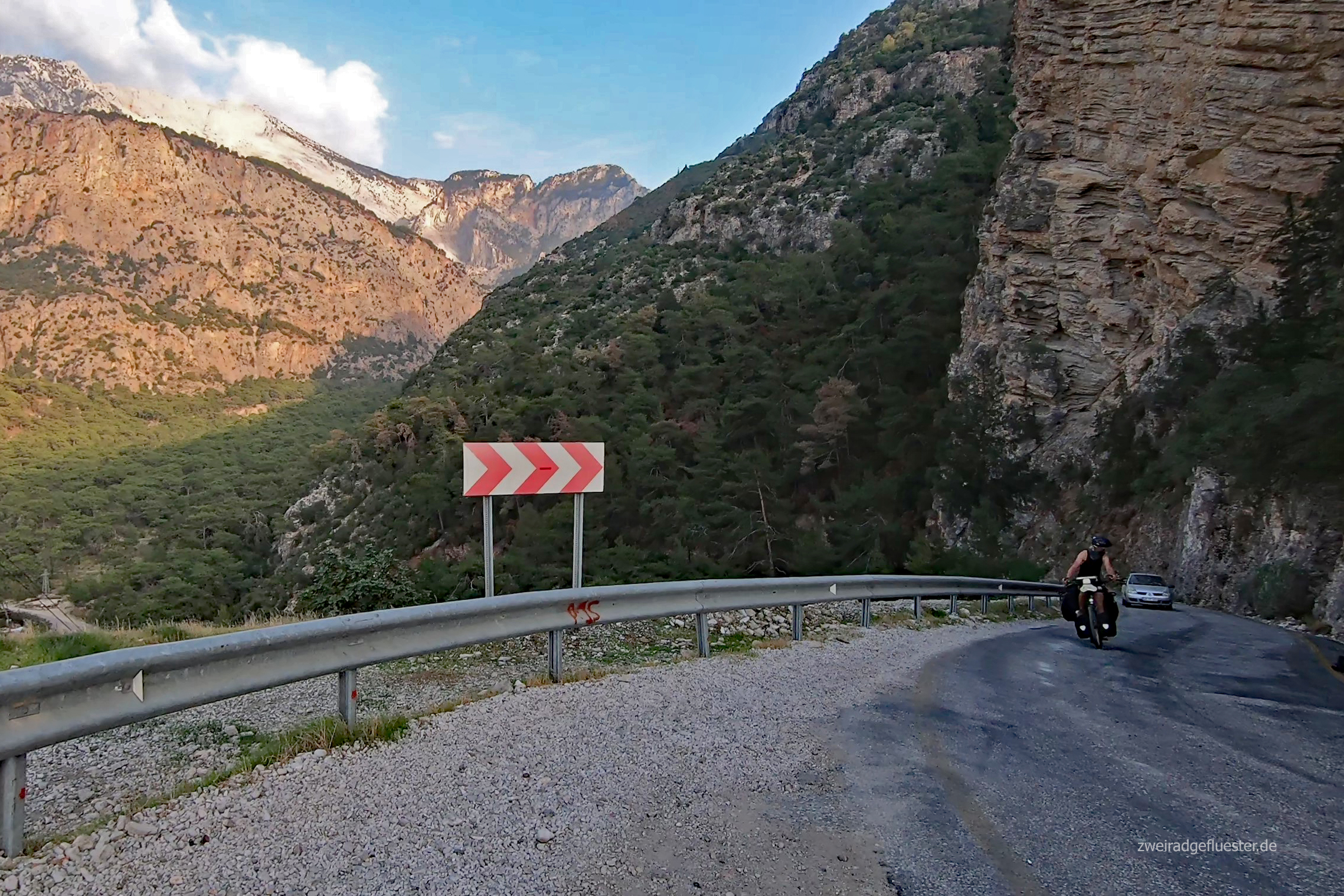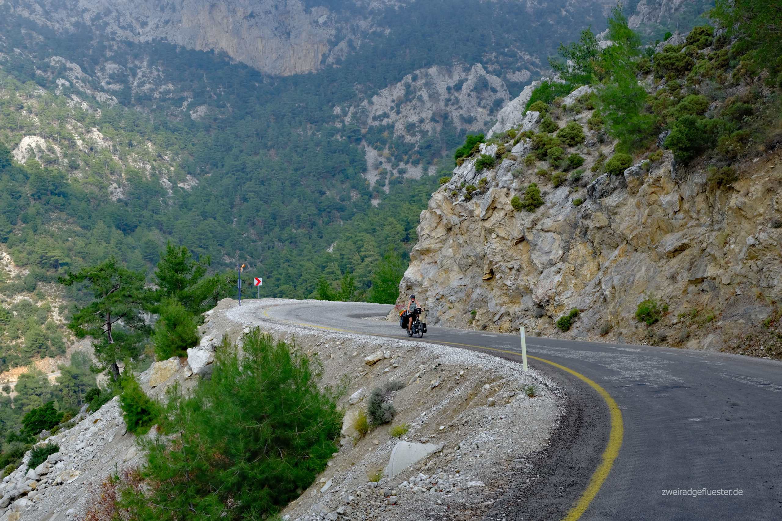 Hinter der Ebene erreichen wir den Olimpos Beydağları Millî Parkı, dessen Gebirgszüge und canyonartige Schluchten sich bis Antalya erstrecken. In der antiken Stadt Olympos säumen heute etliche Campingplätze, Holzhäuser und Souvenirshops die Straße. Wir sind froh über unsere Reisezeit, denn im Sommer muss hier wohl die Hölle los sein. Nun heißt es nochmal ordentlich pumpen bis zum nächsten Gipfel, wo wir dann leider wieder auf die große Bundesstraße müssen. Zum Glück ist die Straße recht neu und zumindest größtenteils mit einem breiten Seitenstreifen versehen, sodass wir uns meistens recht sicher fühlen.