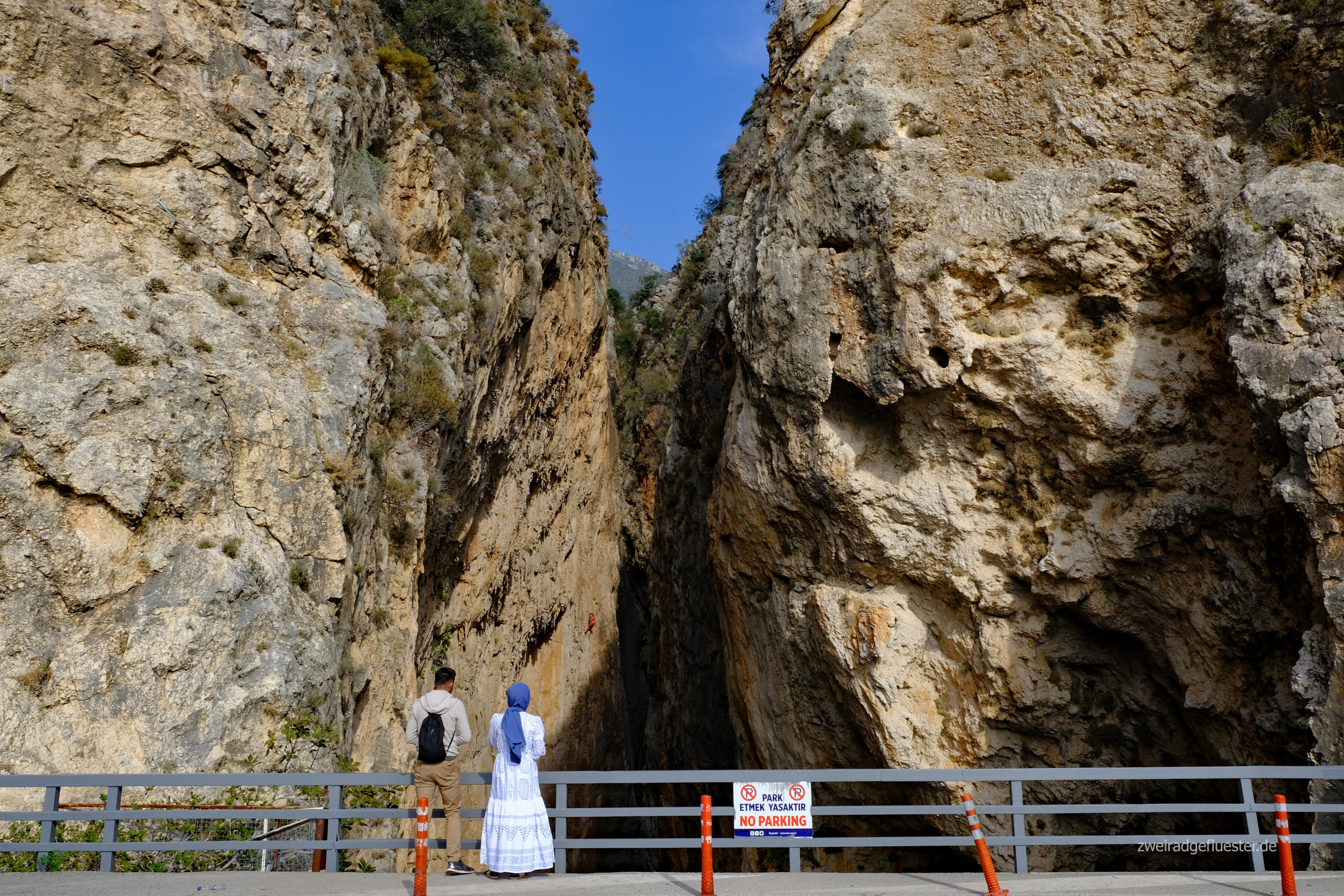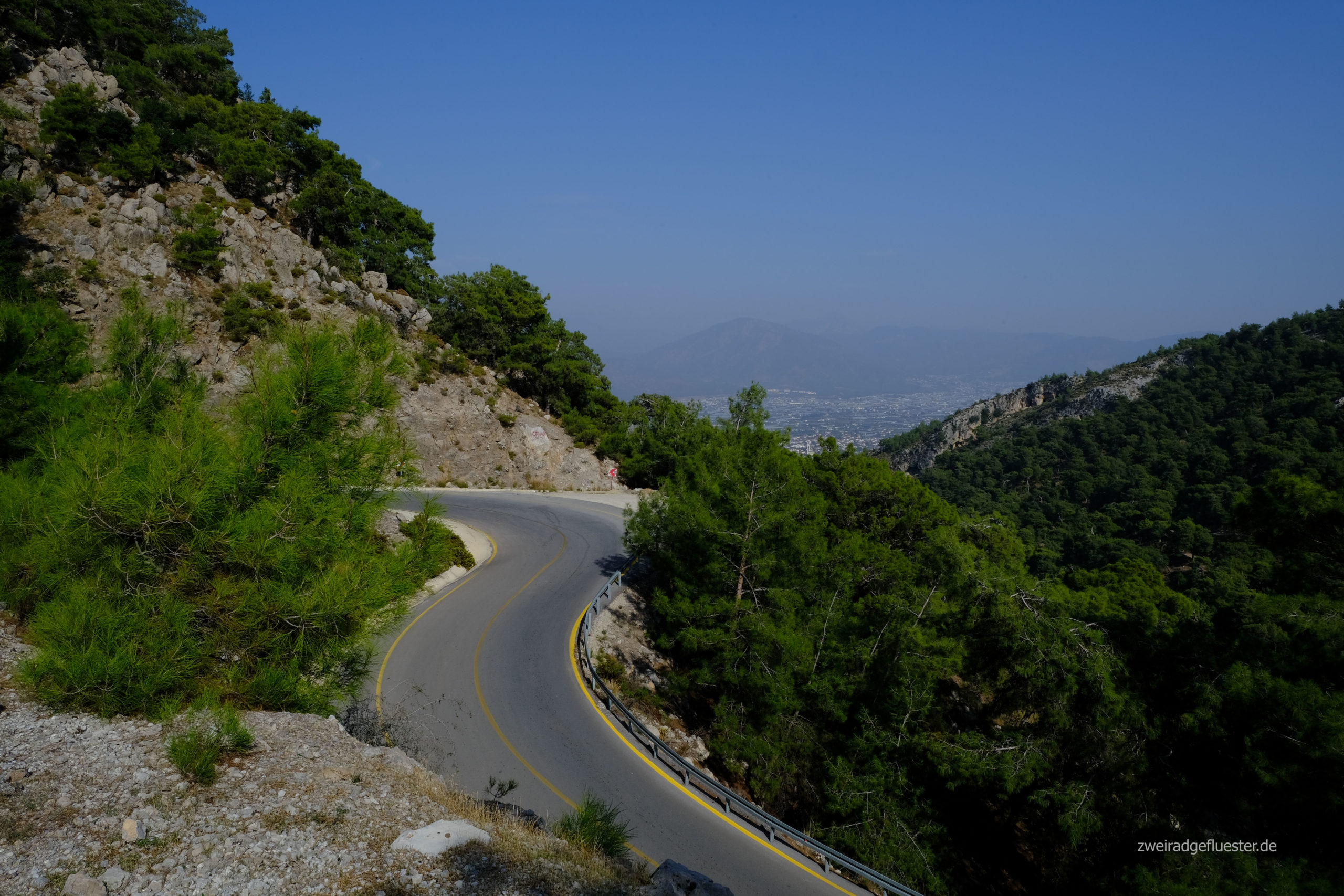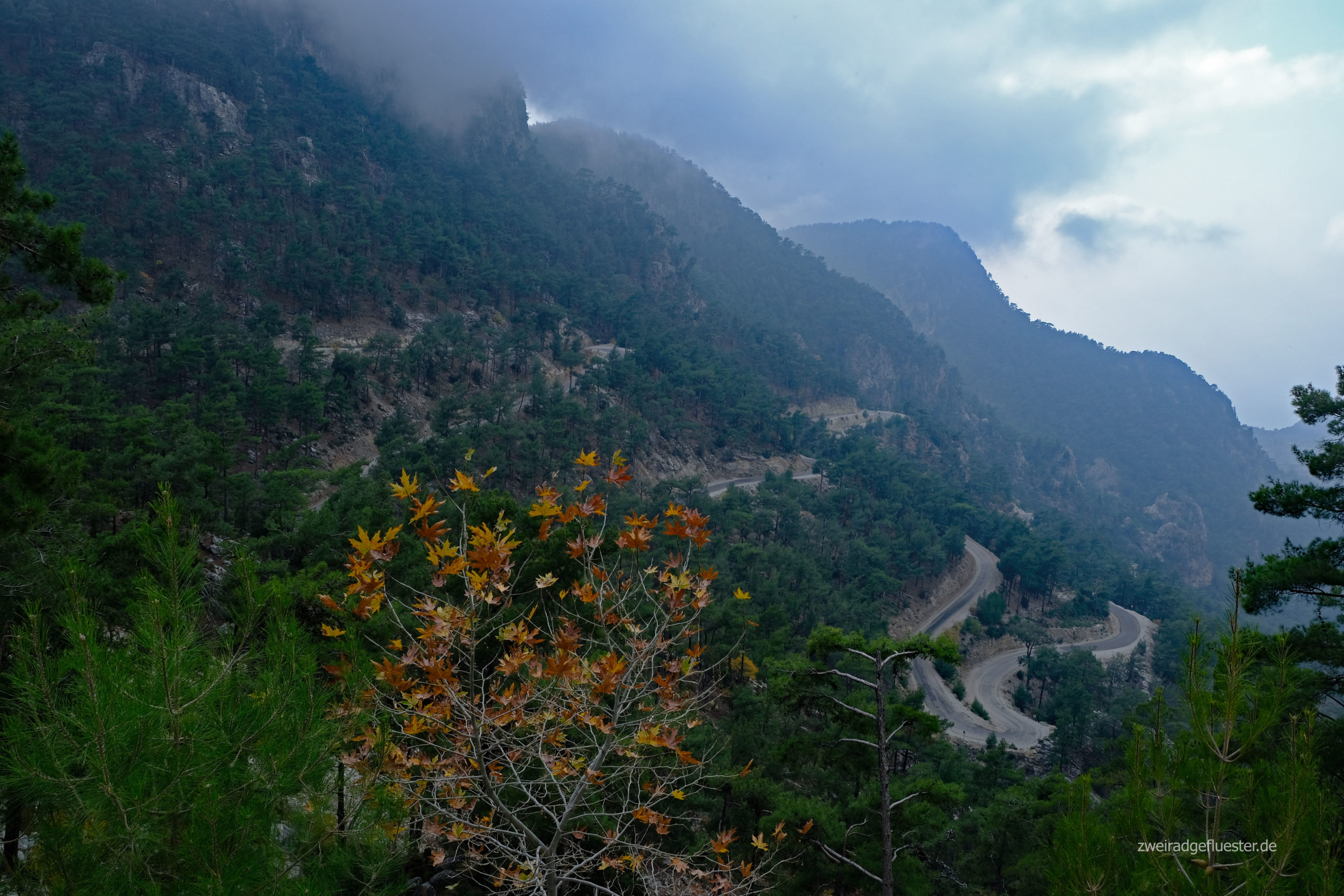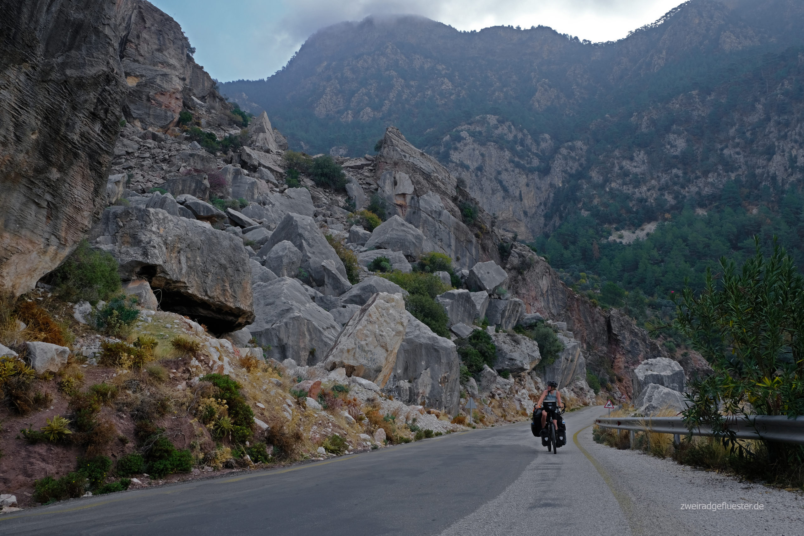 Hinter der Ebene erreichen wir den Olimpos Beydağları Millî Parkı, dessen Gebirgszüge und canyonartige Schluchten sich bis Antalya erstrecken. In der antiken Stadt Olympos säumen heute etliche Campingplätze, Holzhäuser und Souvenirshops die Straße. Wir sind froh über unsere Reisezeit, denn im Sommer muss hier wohl die Hölle los sein. Nun heißt es nochmal ordentlich pumpen bis zum nächsten Gipfel, wo wir dann leider wieder auf die große Bundesstraße müssen. Zum Glück ist die Straße recht neu und zumindest größtenteils mit einem breiten Seitenstreifen versehen, sodass wir uns meistens recht sicher fühlen.