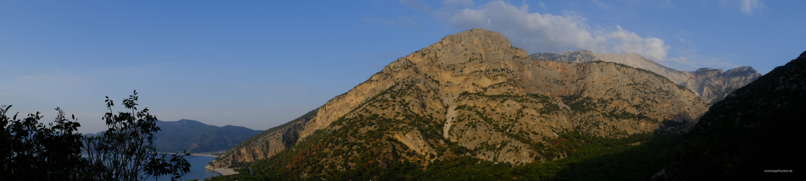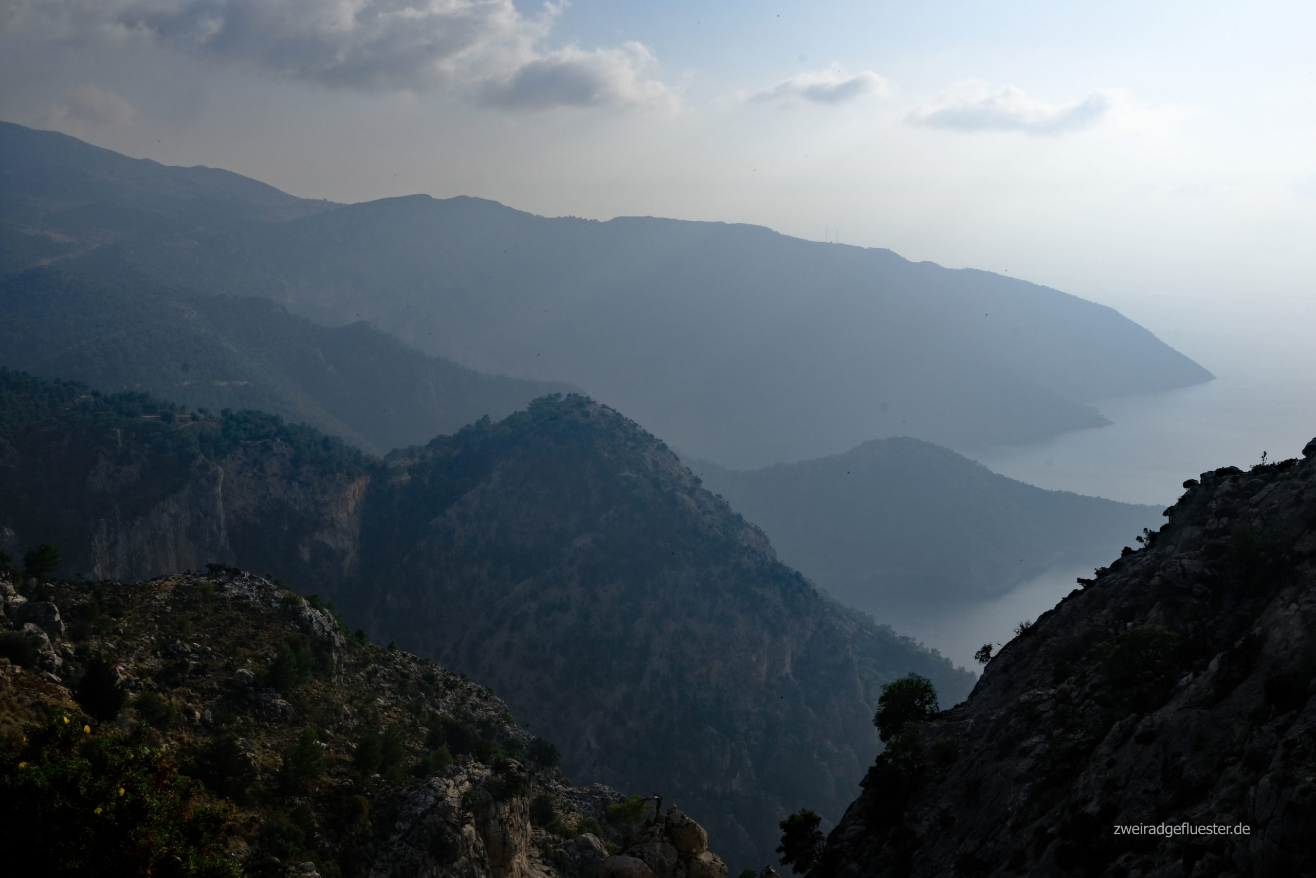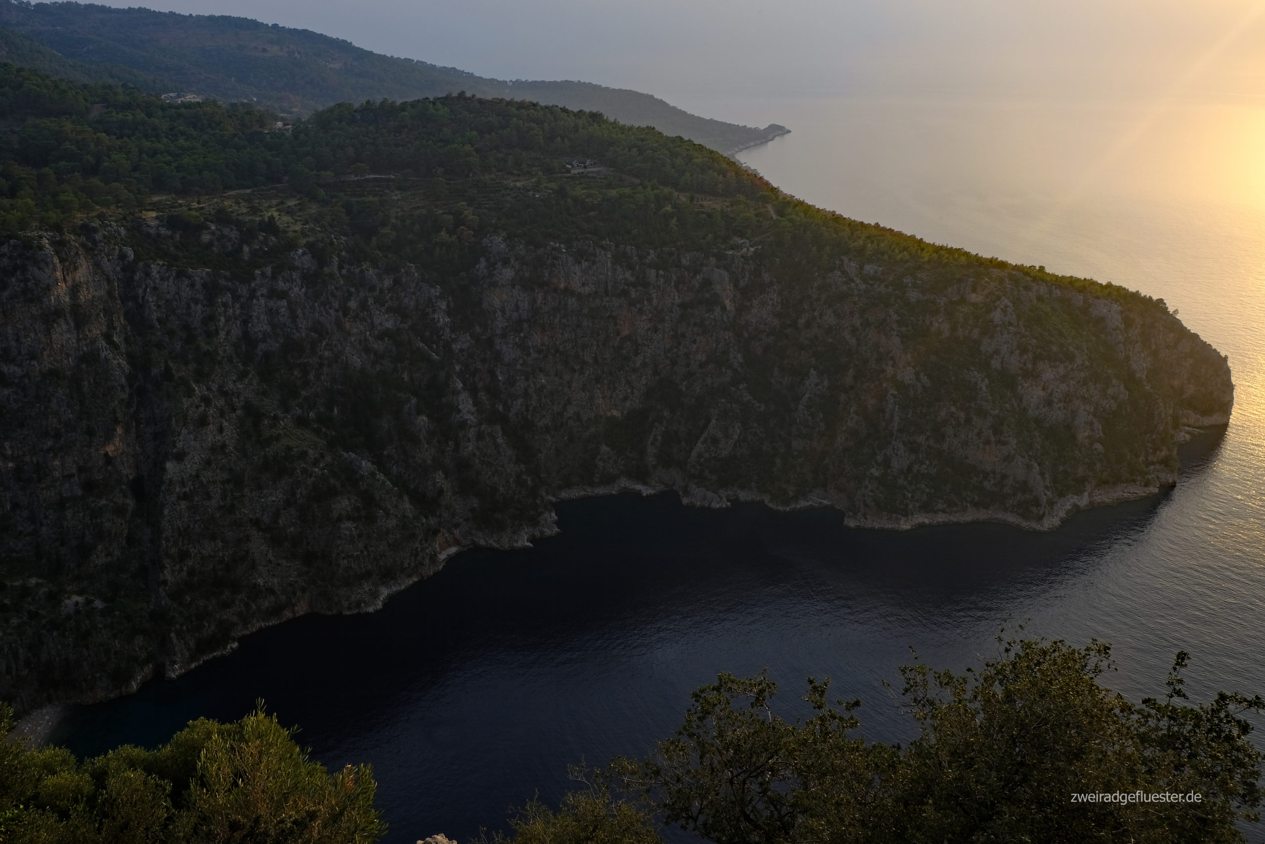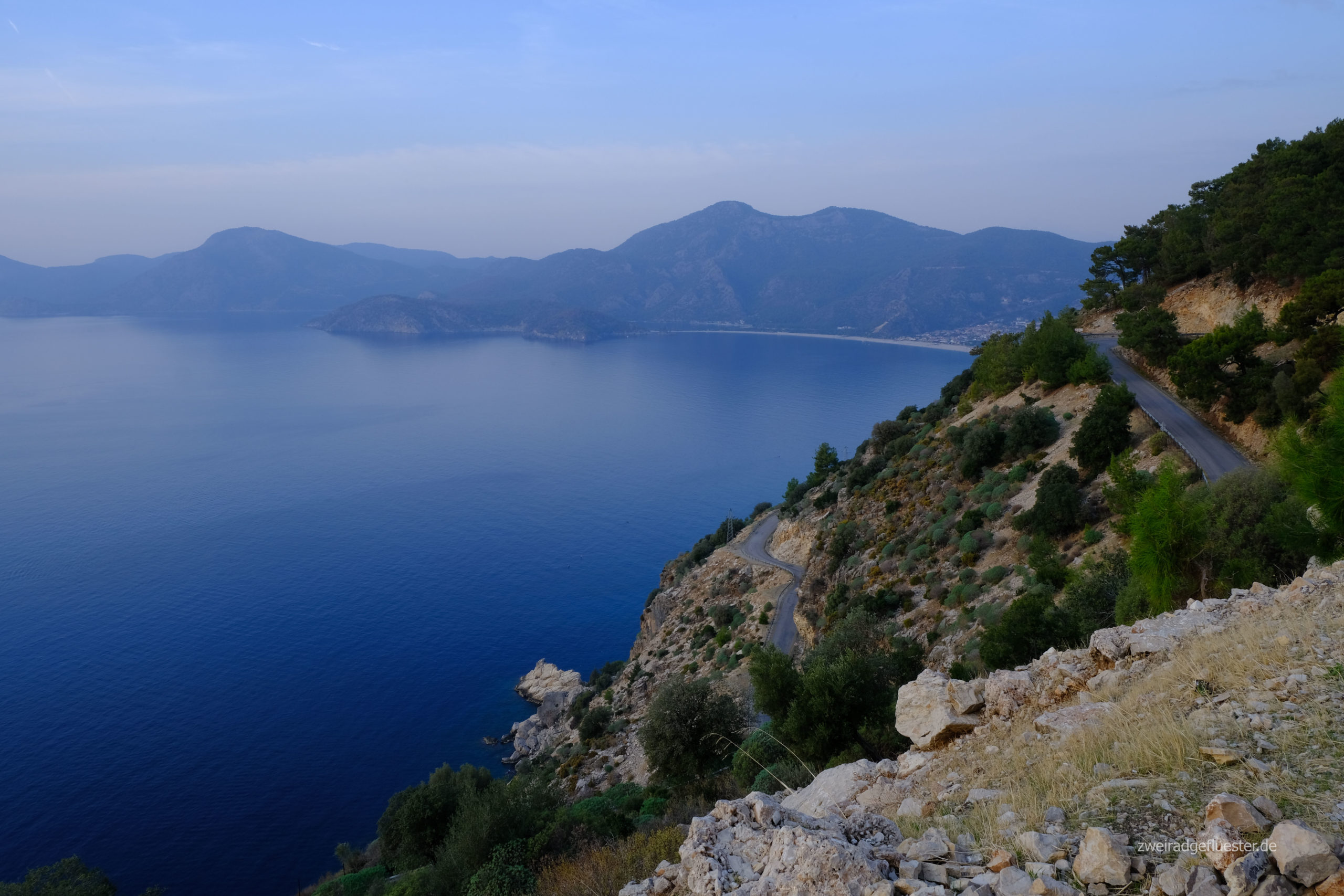 Wir beginnen unseren Weg aus Fethyie nun also mit einer augenverdrehenden, ca. 20 % steilen, schnurrgeraden Straße in die Berge! Da haben selbst die Autos ordentlich zu kämpfen. Irgendwann kommen uns glücklicherweise die Serpentinen zur Hilfe und wir schrauben uns immer weiter nach oben, um dann nach ein paar Kilometern und einem Gipfellokum wieder hinunter an das Meer rollen zu können. In der Abenddämmerung schnaufen wir die traumhafte Küstenstraße hinter Öludeniz entlang. Links von uns: die massiven Felswände, die in mächtigen Gebirgszügen enden und mit dem knapp 2.000 m hohen Babadağ ihren Höhepunkt haben. Rechts von uns: einsame, türkis schimmernde Buchten, die sich fließend in das weite Meer erstrecken. Es riecht nach Pinien, Meer und Sommerurlaub!