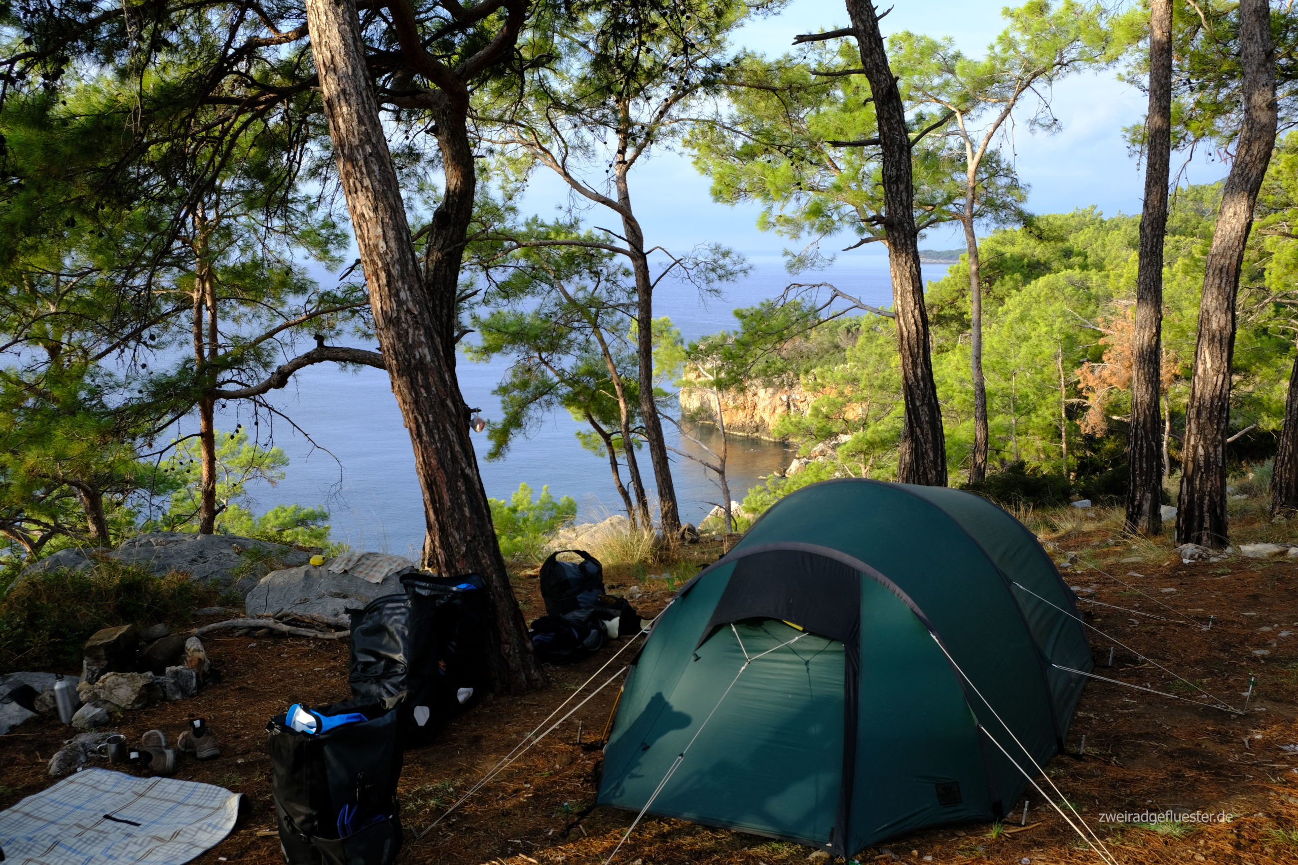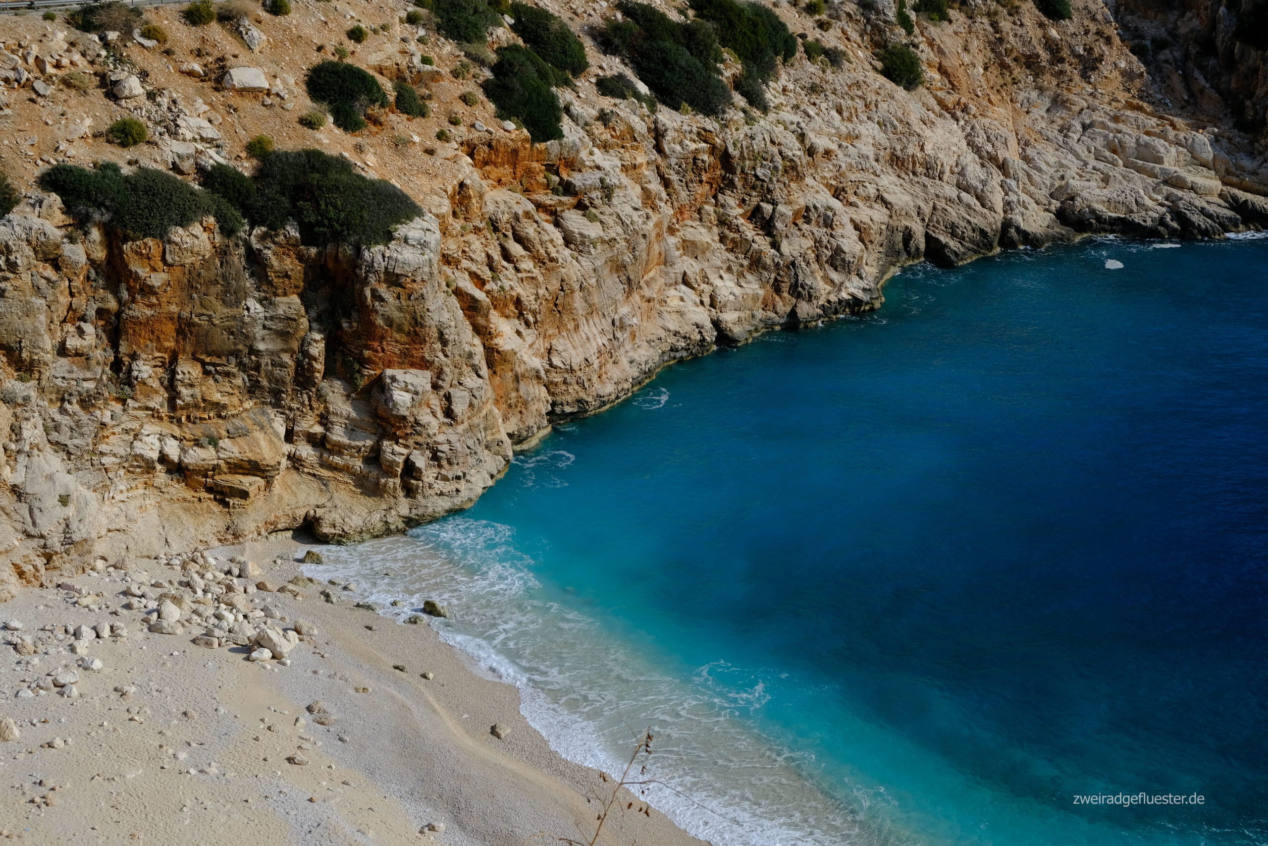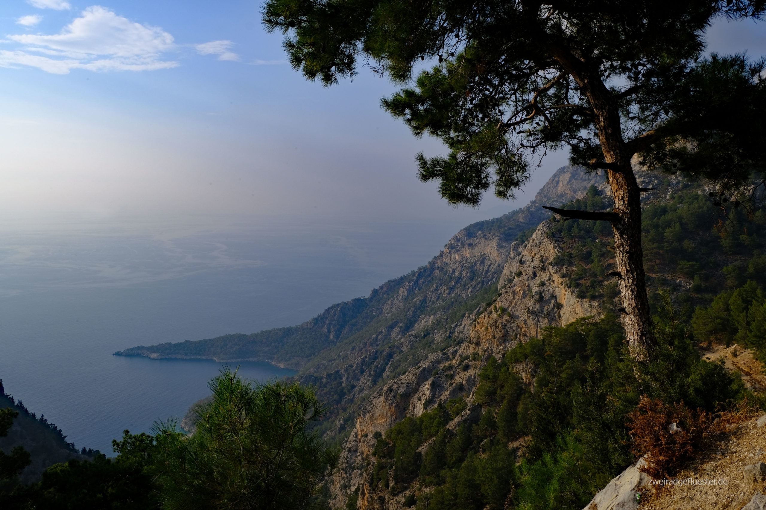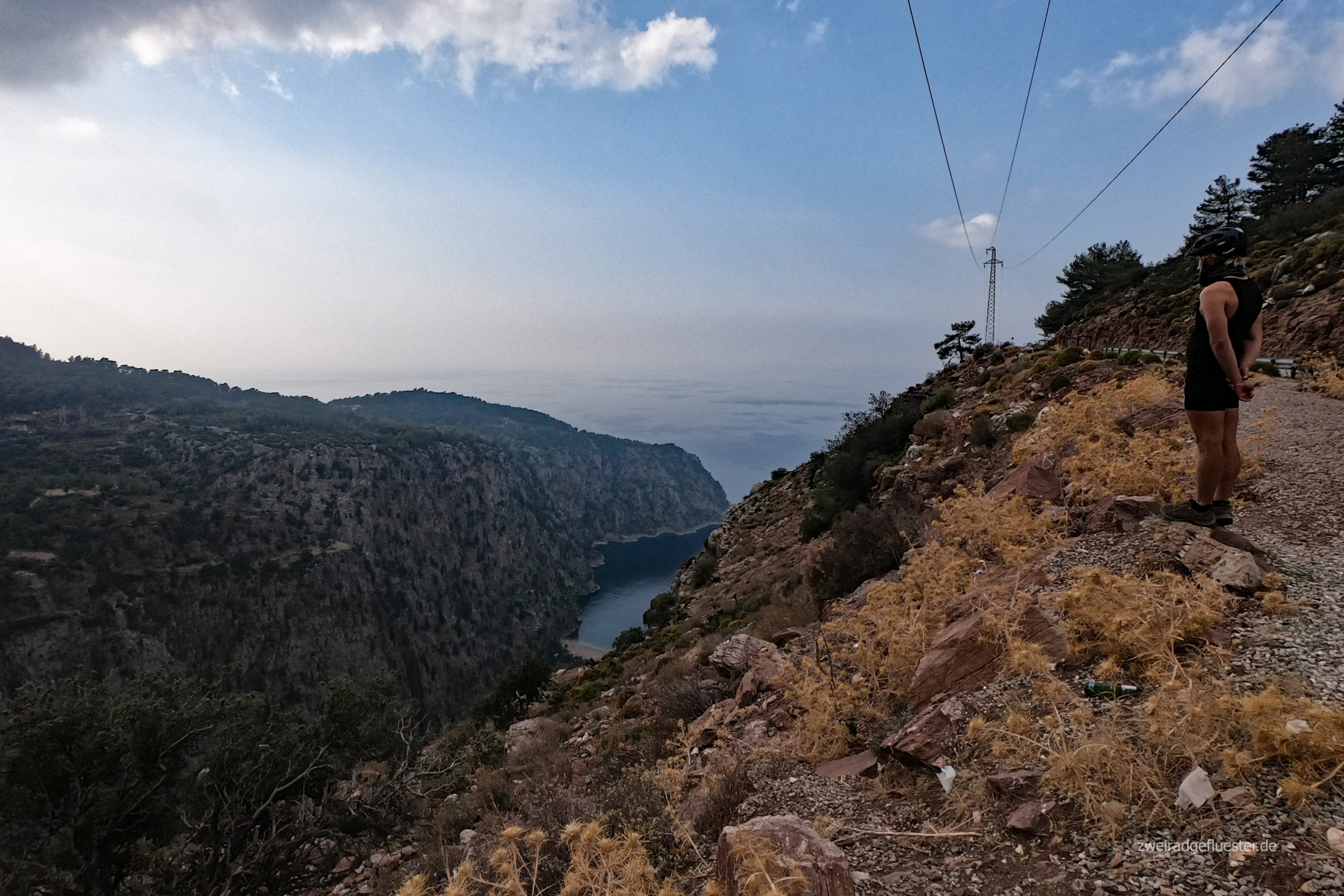 Wir beginnen unseren Weg aus Fethyie nun also mit einer augenverdrehenden, ca. 20 % steilen, schnurrgeraden Straße in die Berge! Da haben selbst die Autos ordentlich zu kämpfen. Irgendwann kommen uns glücklicherweise die Serpentinen zur Hilfe und wir schrauben uns immer weiter nach oben, um dann nach ein paar Kilometern und einem Gipfellokum wieder hinunter an das Meer rollen zu können. In der Abenddämmerung schnaufen wir die traumhafte Küstenstraße hinter Öludeniz entlang. Links von uns: die massiven Felswände, die in mächtigen Gebirgszügen enden und mit dem knapp 2.000 m hohen Babadağ ihren Höhepunkt haben. Rechts von uns: einsame, türkis schimmernde Buchten, die sich fließend in das weite Meer erstrecken. Es riecht nach Pinien, Meer und Sommerurlaub!