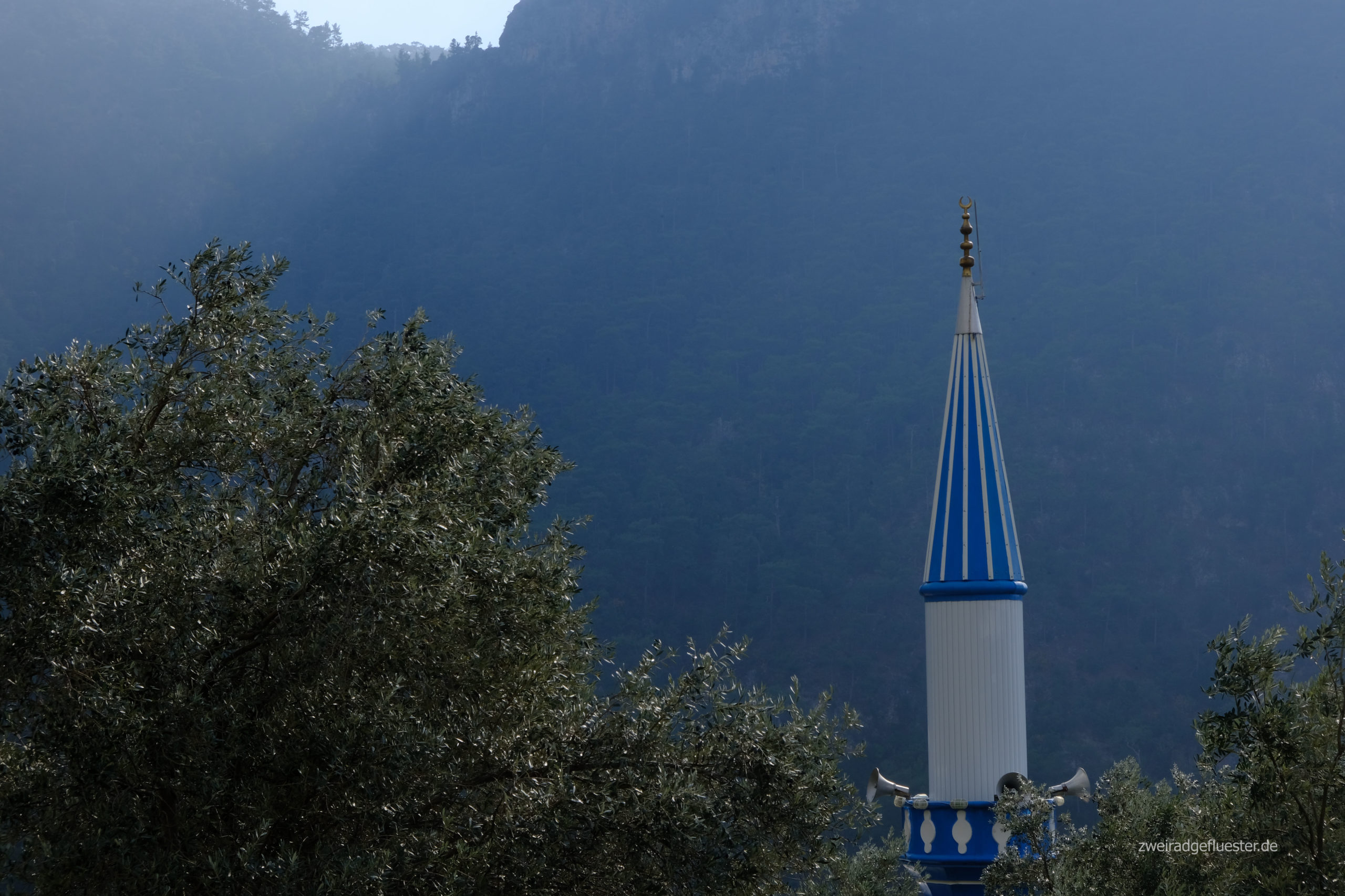 Die Küstenstraße endet für uns in einer atemberaubenden Bucht, die sich in einer eindrucksvollen Schlucht befindet. Kurz vor Sonnenuntergang stehen wir auf gut 300 Metern und blicken die steilen Felsklippen der Schmetterlingsbucht hinunter. Wir stellen unser Zelt im Garten einer Pension auf und sind umgeben von gewaltigen Felswänden. Dadurch schallt nicht nur der Muezzingesang in schrillen Tönen zwischen den Bergen, sondern wir können auch den Hähnen die ganze Nacht beim lautstarken, gegenseitigen Übertrumpfen lauschen.