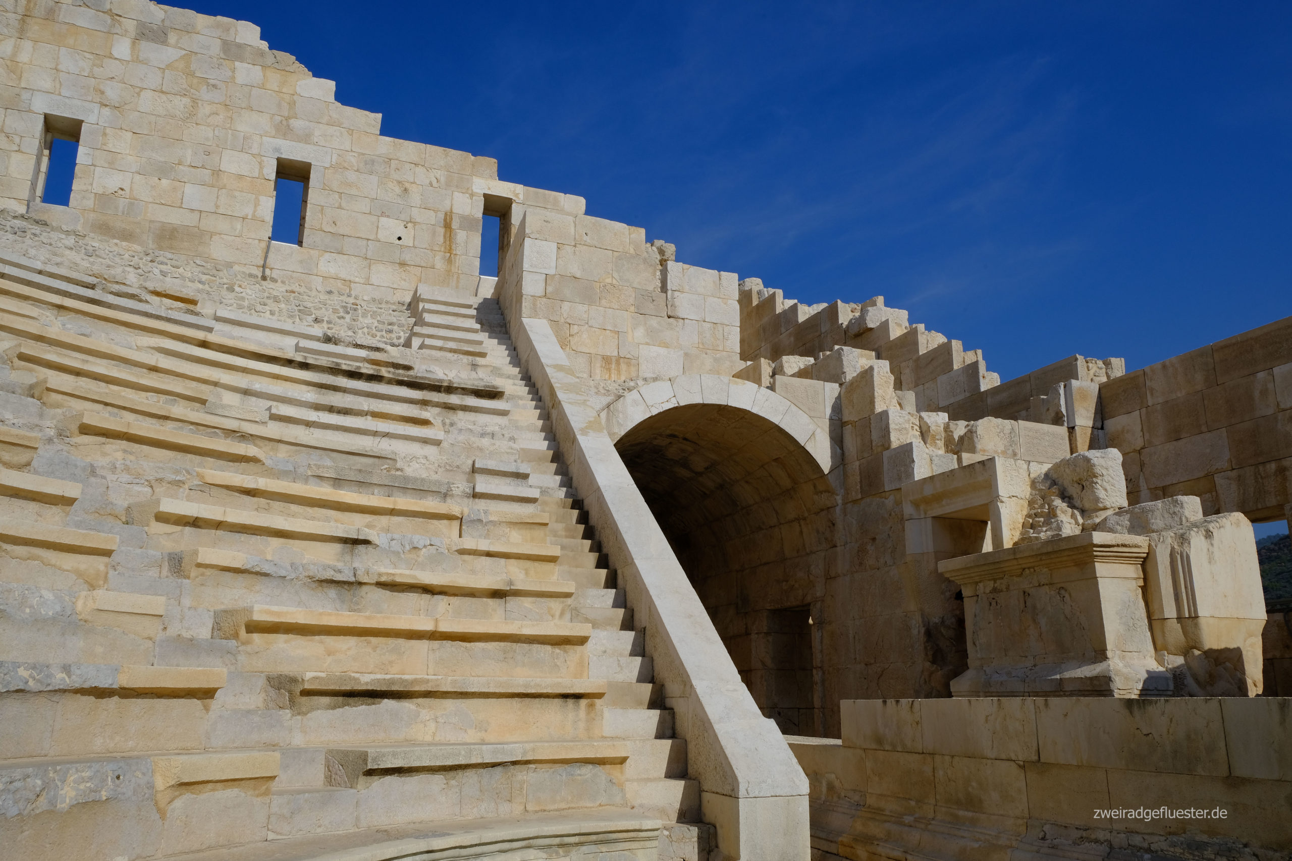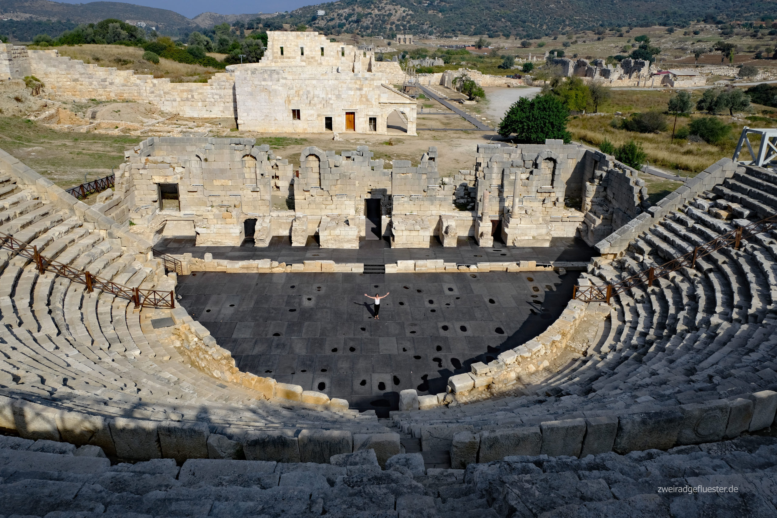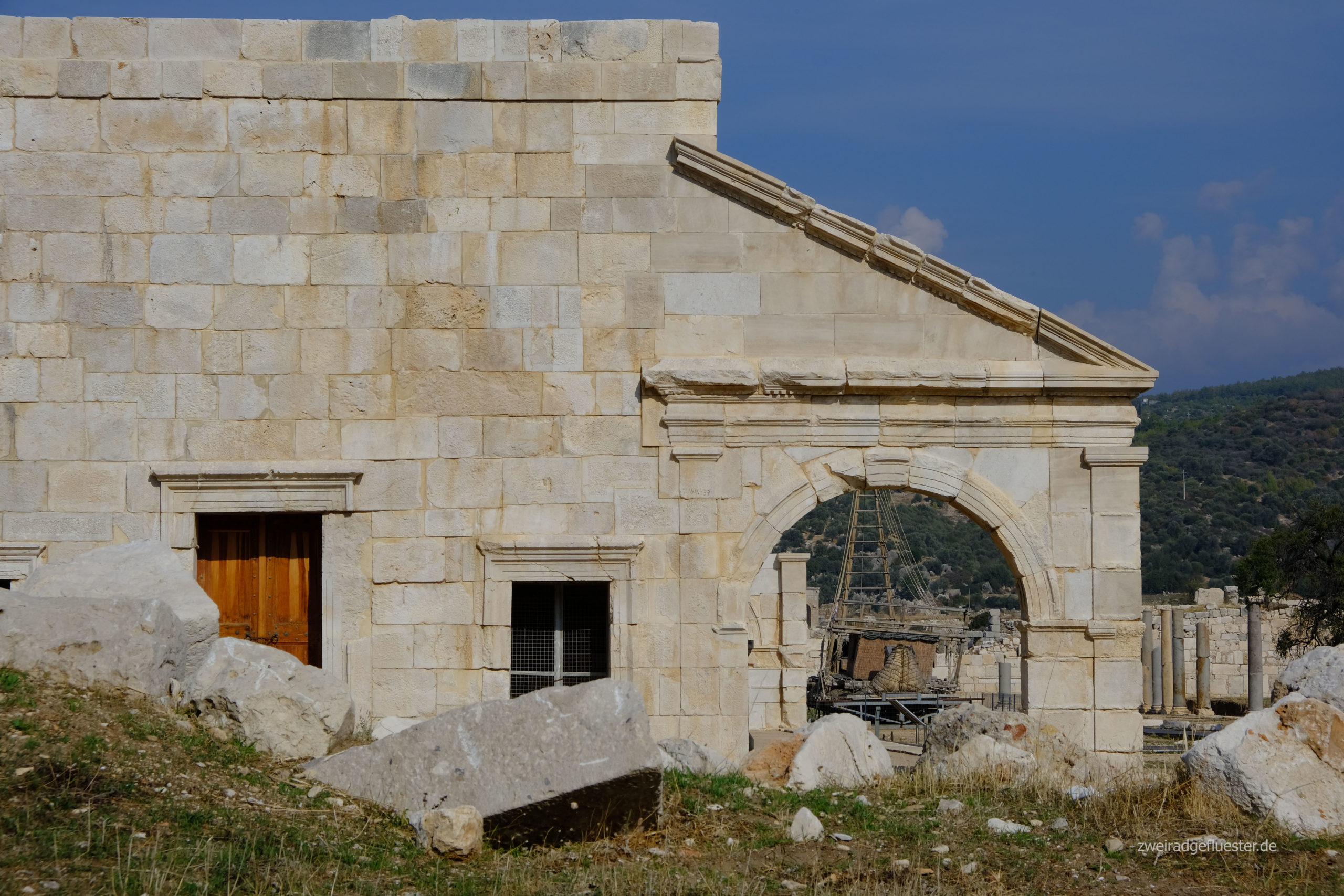 Nach einem ausgiebigen Frühstück auf Balkonien machen wir uns auf den Weg zu den Ruinen von Nikolaus Geburtsstadt, der alten lykischen Stadt Patara. Neben all den Ruinen und Säulen, gibt es auch hier wieder ein sehr gut erhaltenes Theater zu sehen, welches an die griechische Baukunst erinnert. Der antike Hafen soll wohl damals irgendwann versandet sein. Als wir im Anschluss zum riesigen Sanddünenstrand laufen, können wir uns das sehr gut vorstellen.
