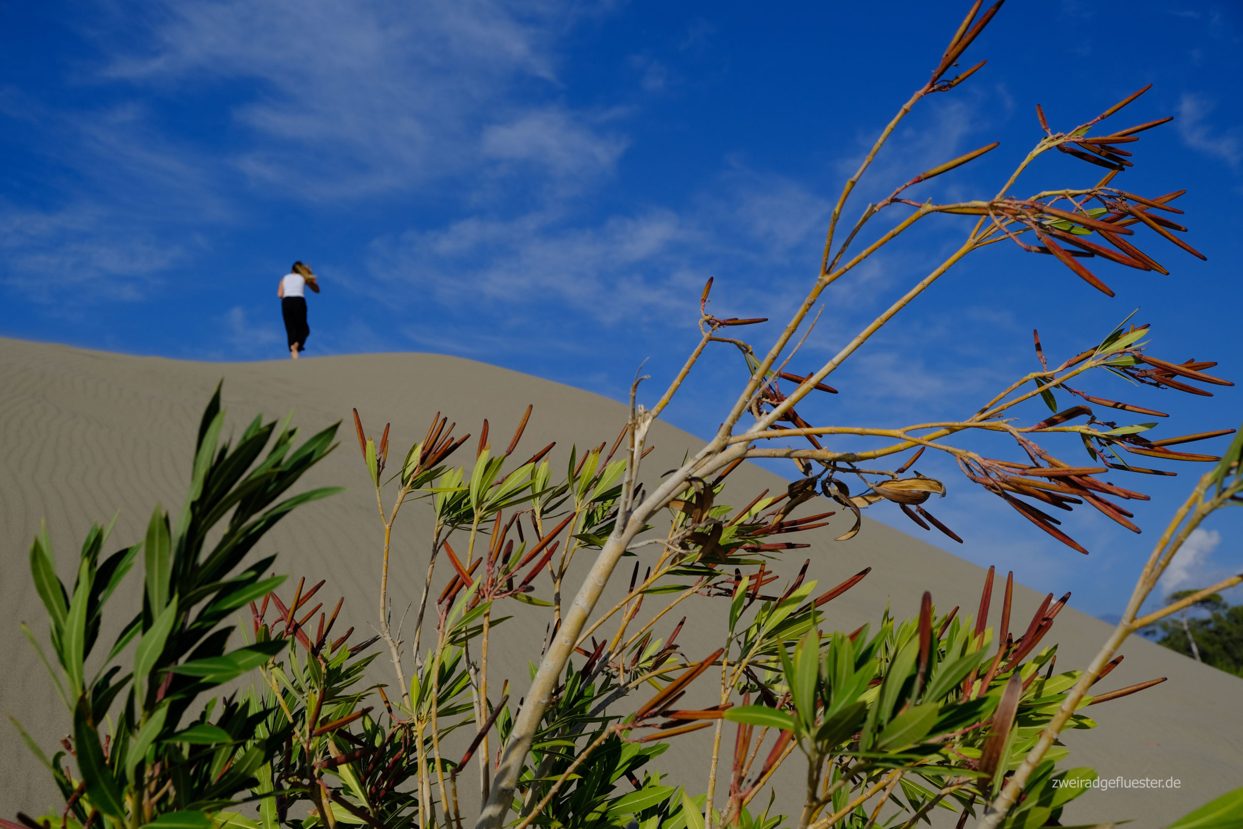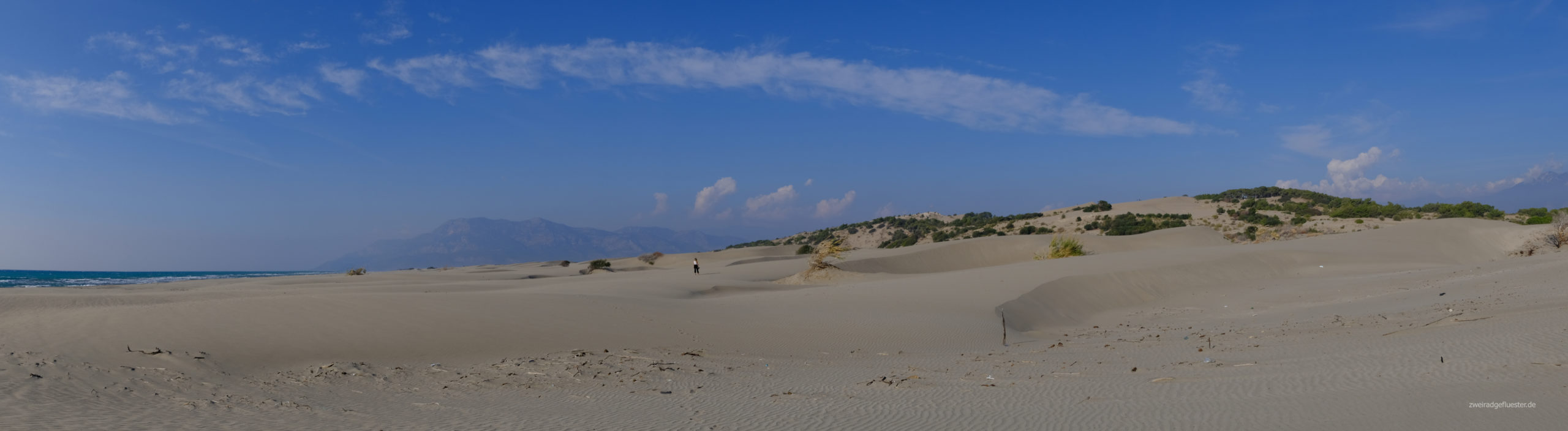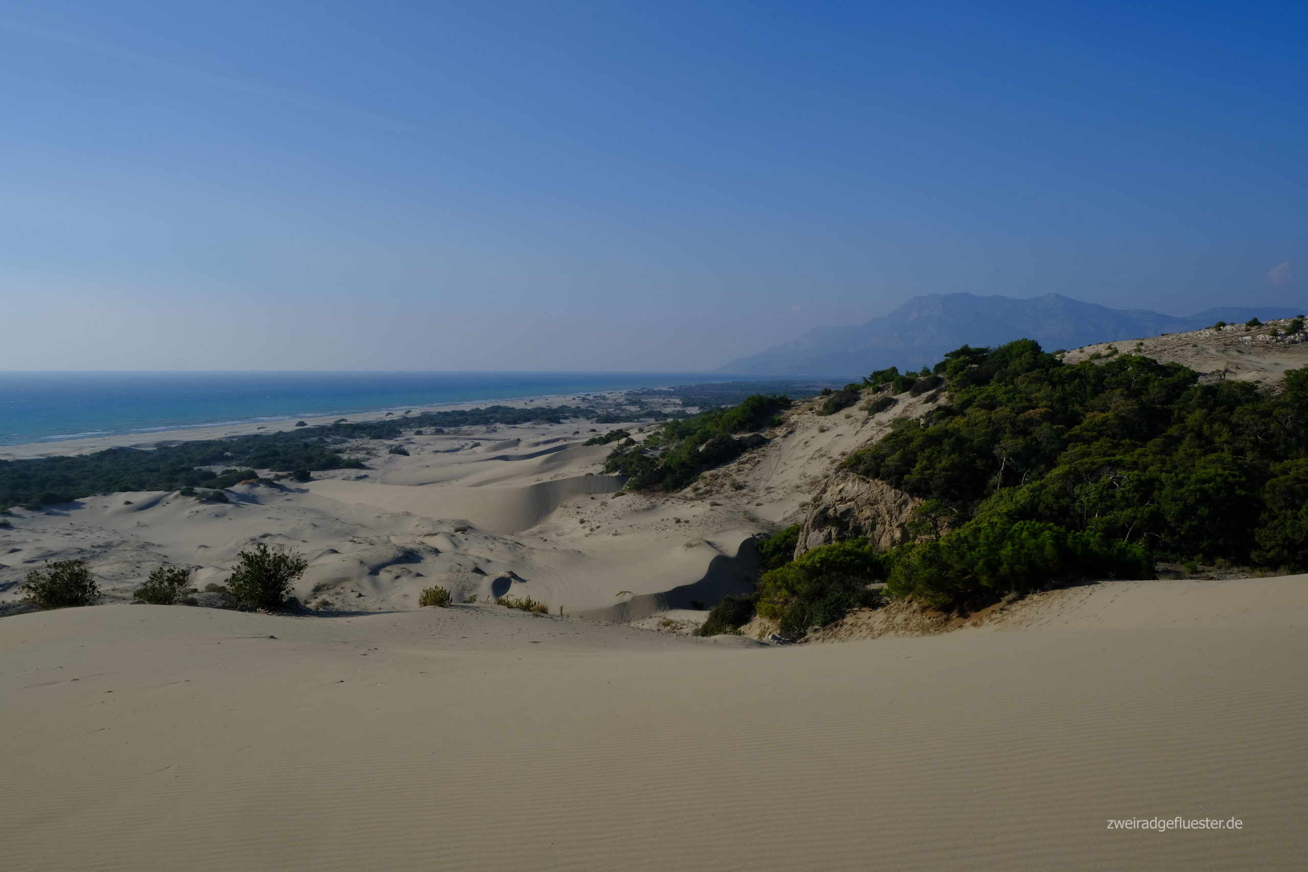 Der ca. 12 km lange Sandstrand befindet sich unter Naturschutz, weshalb man außer den Ruinen auch kein einziges Bauwerk weit und breit erblicken kann. Kilometerweit nur Sand und Meer, umrahmt von grünen Hügeln und einem Bergpanorama, welches wir in den letzten Tagen überwunden haben. Es sieht ein bisschen aus wie in der Wüste, der Wind pfeift und wir stapfen auf den tanzenden Sandkörnern bis zur Spitze der Dünen, wo wir auf den Sonnenuntergang warten.