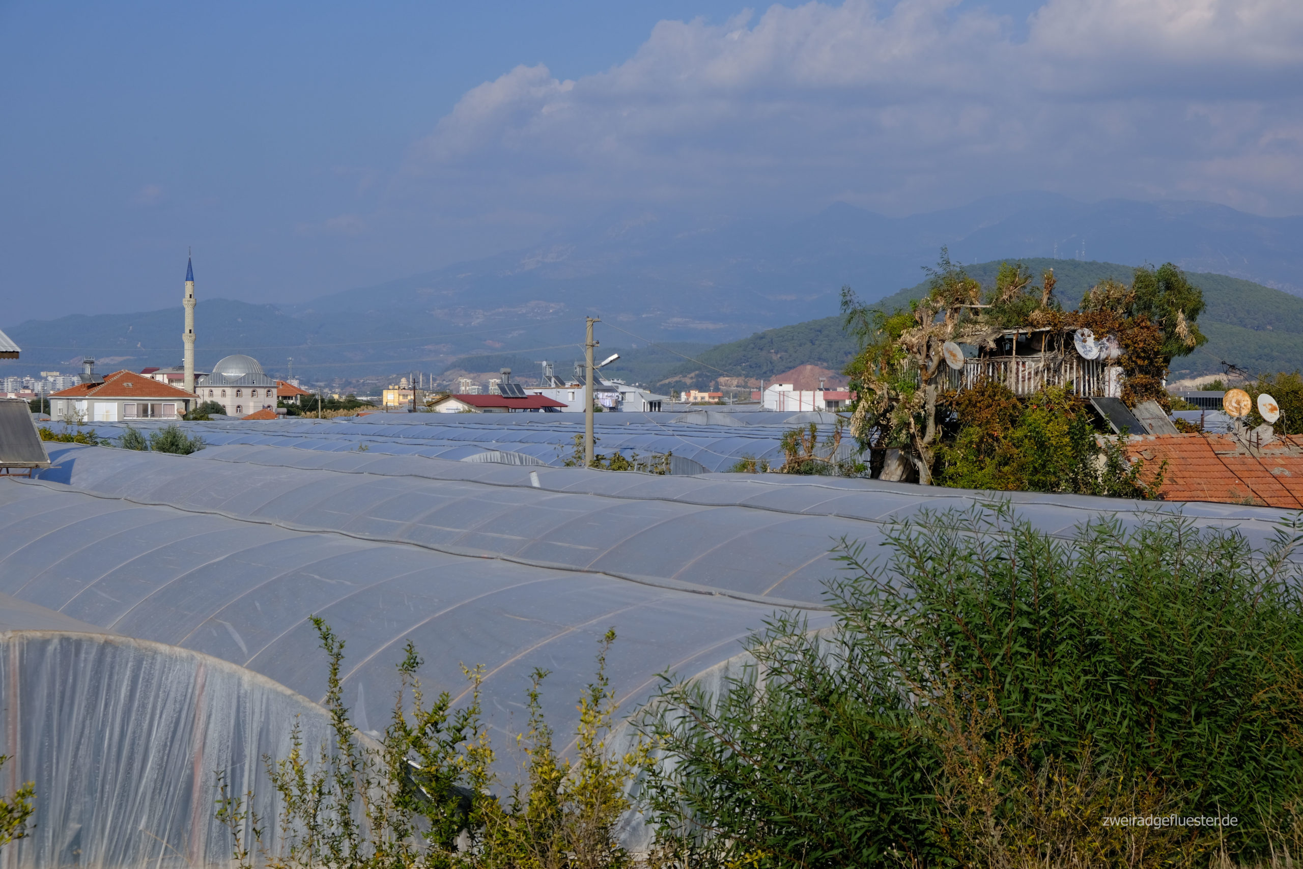 Hinter Demre fahren wir immer entlang der wunderschönen Küstenstraße mit Blick auf unzählige, kleine Traumbuchten und kommen aus dem Staunen über diese natürliche Schönheit mal wieder nicht mehr raus. In Finike werden wir sogar mit einem echten Radweg überrascht, der 15 km am Strand entlangführt. So lange sind wir schon ewig nicht mehr auf flachem Terrain geradeaus gefahren. Wir könnten fast fliegen, wenn da nicht dieser garstige Gegenwind wäre. Auch diese flache Ebene zwischen den Bergen ist gesäumt von unzähligen Gewächshäusern.