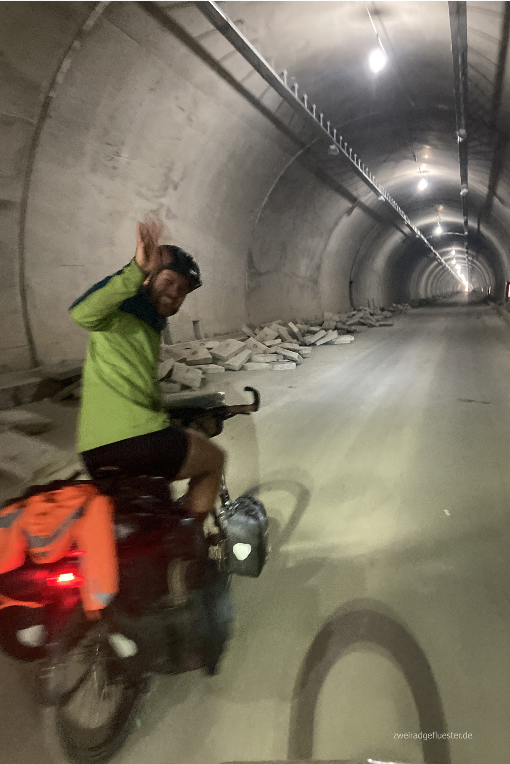 Irgendwann beginnt eine längere Baustelle, aber wir nutzen die fast fertige, neue Fahrbahn, um dem großen Verkehr zu entkommen. Doch irgendwann endet auch diese vor einem Tunnel, der sich gerade noch im Bau befindet. Wir fragen nach, ob wir vielleicht durchfahren dürfen, um erstens dem großen Verkehr auf der engen Umgehungsstraße zu entkommen und zweitens, ein paar Höhenmeter zu sparen. Der junge Bauleiter ist nicht gerade begeistert von unserer Idee, aber der Seniorchef lacht und willigt sofort ein. Wir sollen das Licht anmachen und schön langsam fahren und rattern kurze Zeit später glücklich durch den unfertigen, dunklen Tunnel.