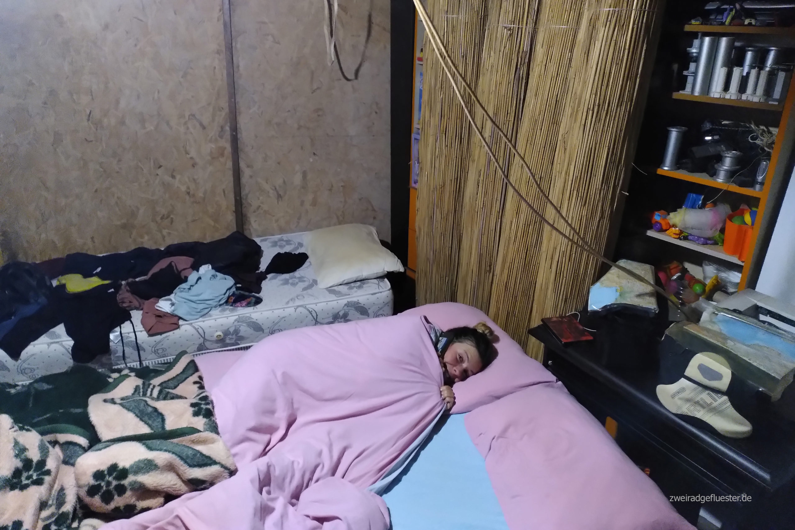 Untergebracht sind wir in einer kleinen Rumpelkammer, die neben unserem Schlafplatz als Lagerraum, Abstellkammer und Werkstatt dient.