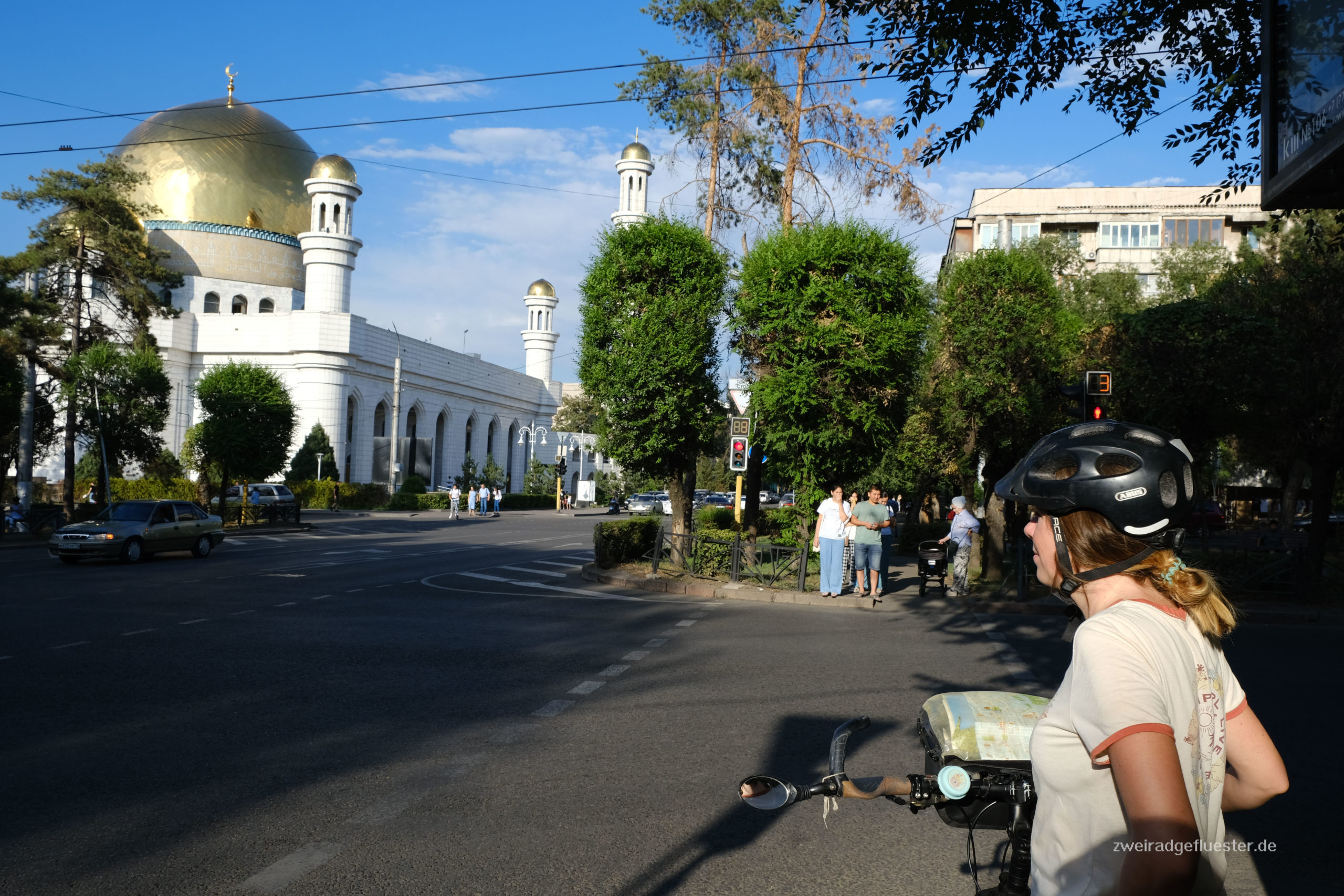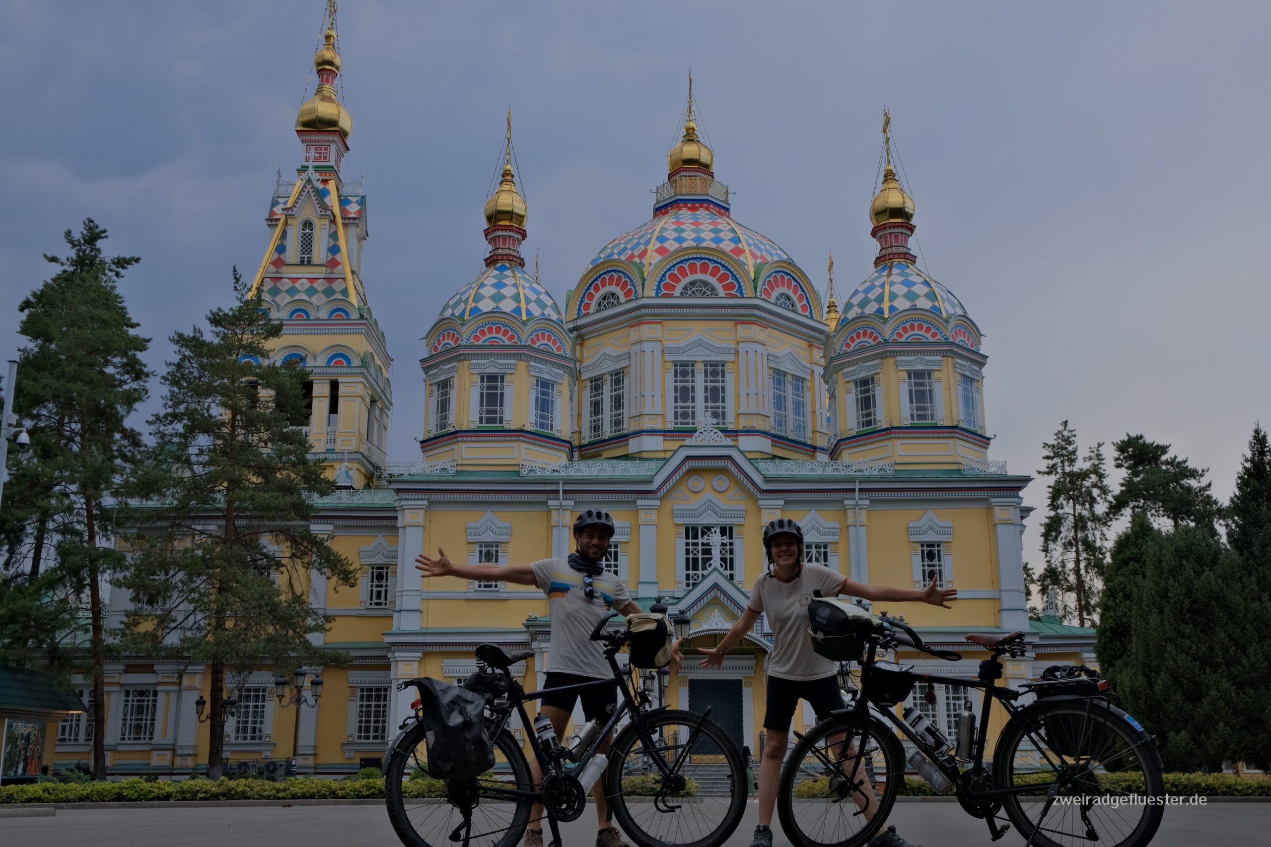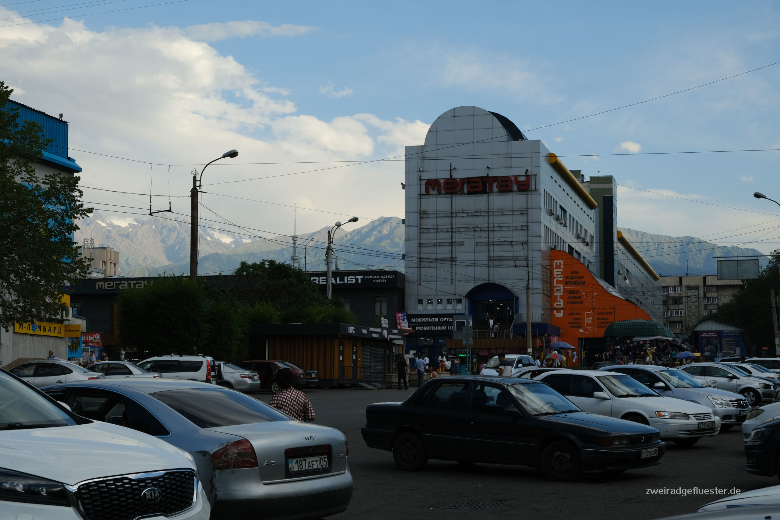 Wir bauen die Räder in den frühen Morgenstunden direkt am Flughafen zusammen und radeln nach einer schlaflosen Nacht ins Zentrum von Almaty. Es fängt an zu regnen, die ersten Tropfen seit über zwei Monaten! Das Grün der Pflanzen in der Stadt ist nach den iranischen Wüstenstädten Balsam für unsere Augen und wir atmen genüsslich die frische Vorstadtluft ein.