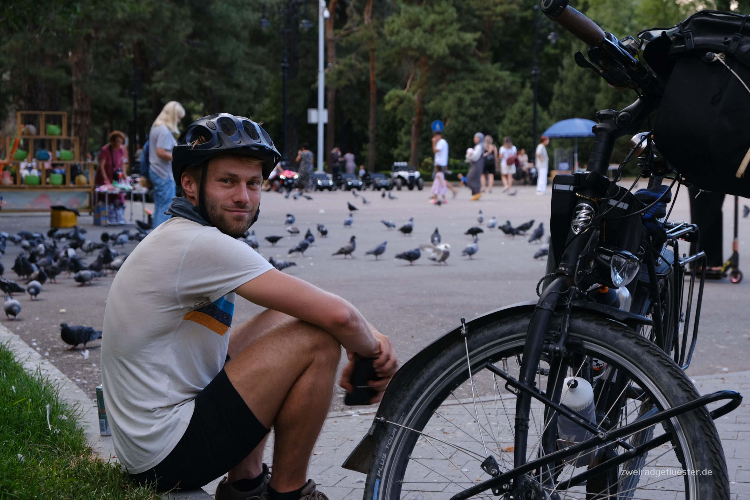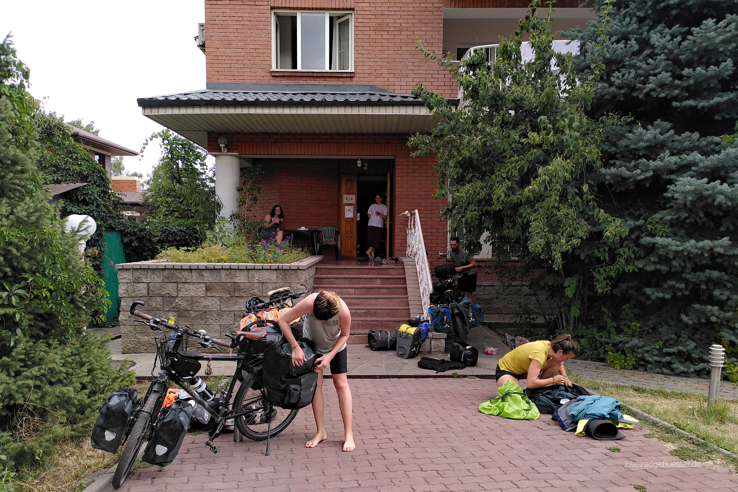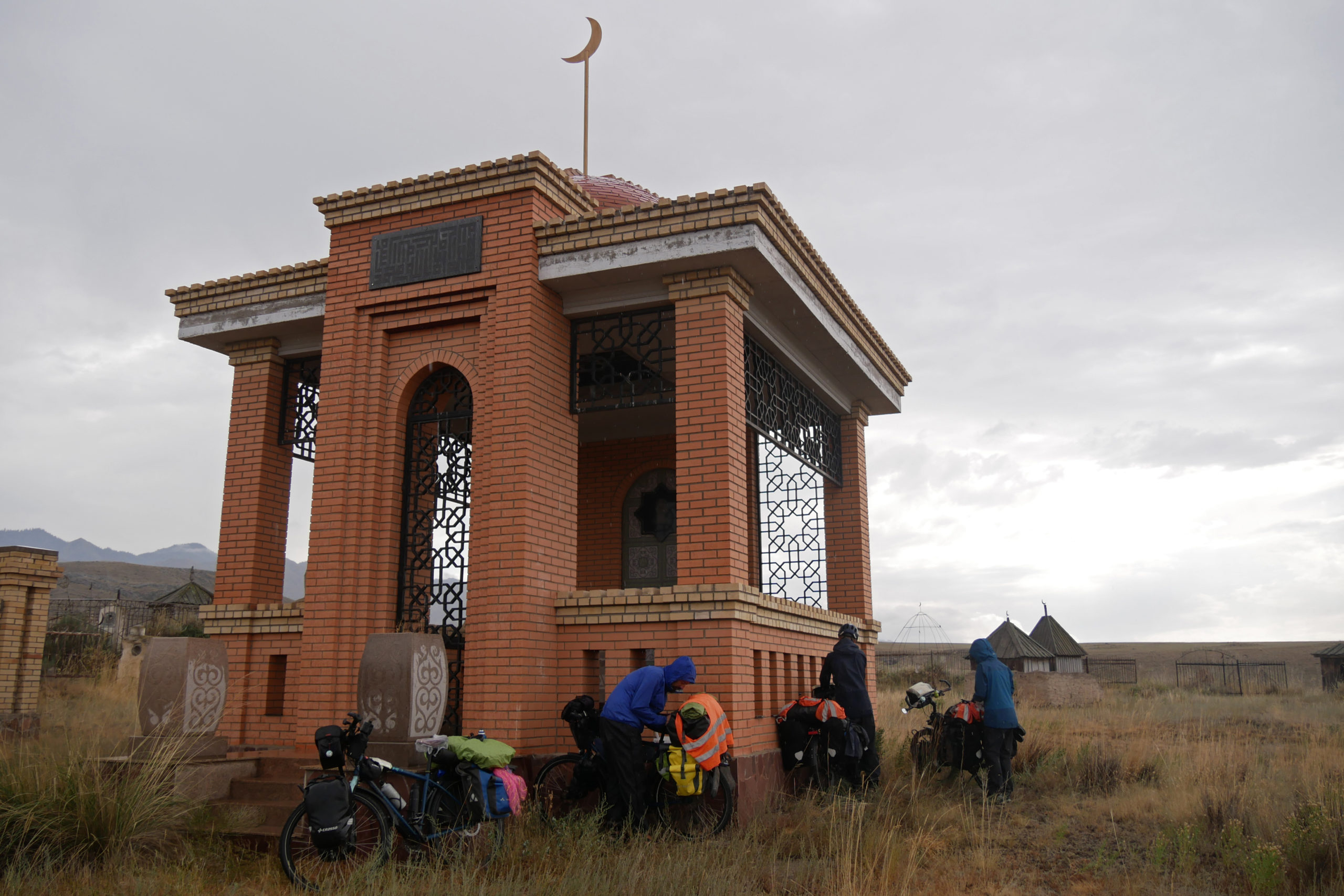 Wir bauen die Räder in den frühen Morgenstunden direkt am Flughafen zusammen und radeln nach einer schlaflosen Nacht ins Zentrum von Almaty. Es fängt an zu regnen, die ersten Tropfen seit über zwei Monaten! Das Grün der Pflanzen in der Stadt ist nach den iranischen Wüstenstädten Balsam für unsere Augen und wir atmen genüsslich die frische Vorstadtluft ein.