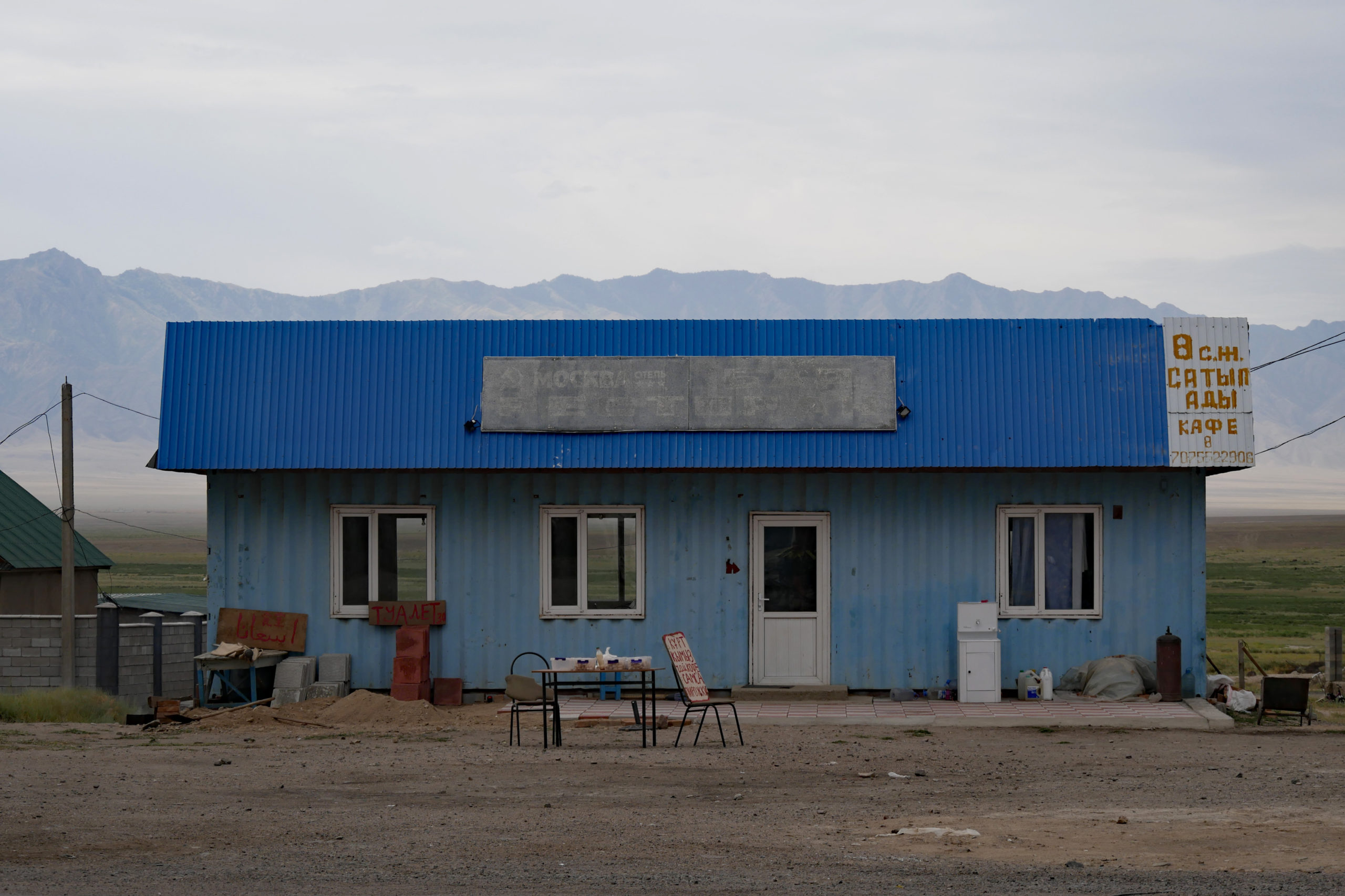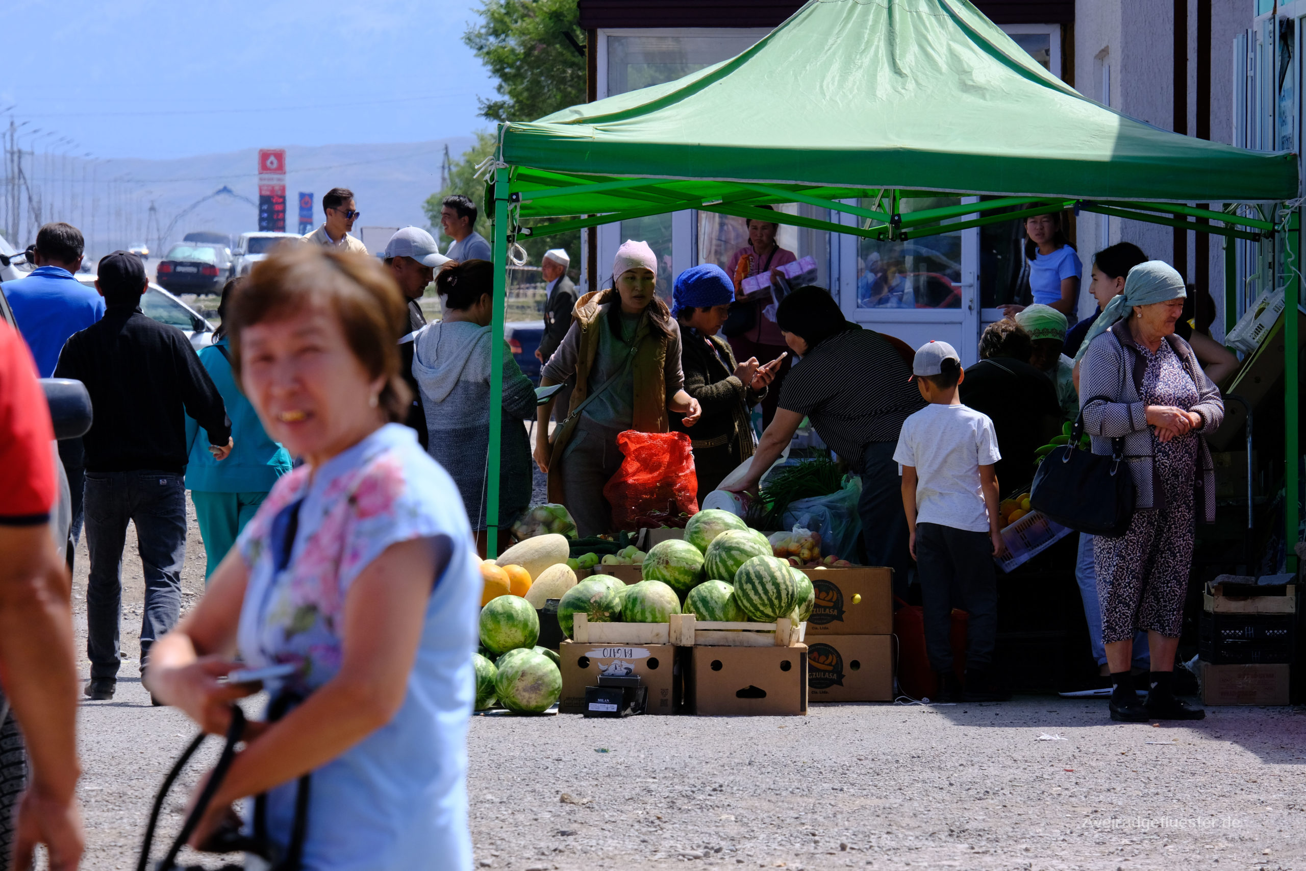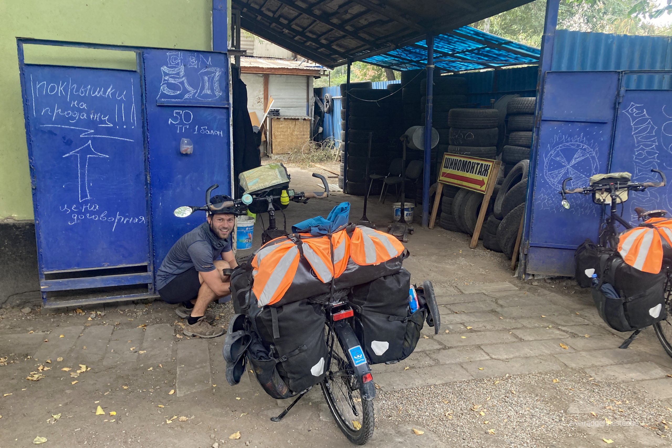 Wir gehen auf Nummer sicher und packen die Taschen voll, heben viel zu viel Geld ab und tauschen sogar schonmal erste kasachische Tenge in kirgisische Som. Wir füllen unseren Benzintank für unseren Kocher an der Tankstelle. Eine Sache, die immer wieder zum Schmunzeln führt, wenn zwei auf dem Rad tatsächlich Benzin kaufen wollen. Diesmal geht es zu einem Opi an den Transporter, er schöpft uns etwas aus dem Kanister in unsere Flasche. Dann noch schnell die Luft an einer kleinen Autowerkstatt mit dem Kompressor aufpumpen und ab geht es!