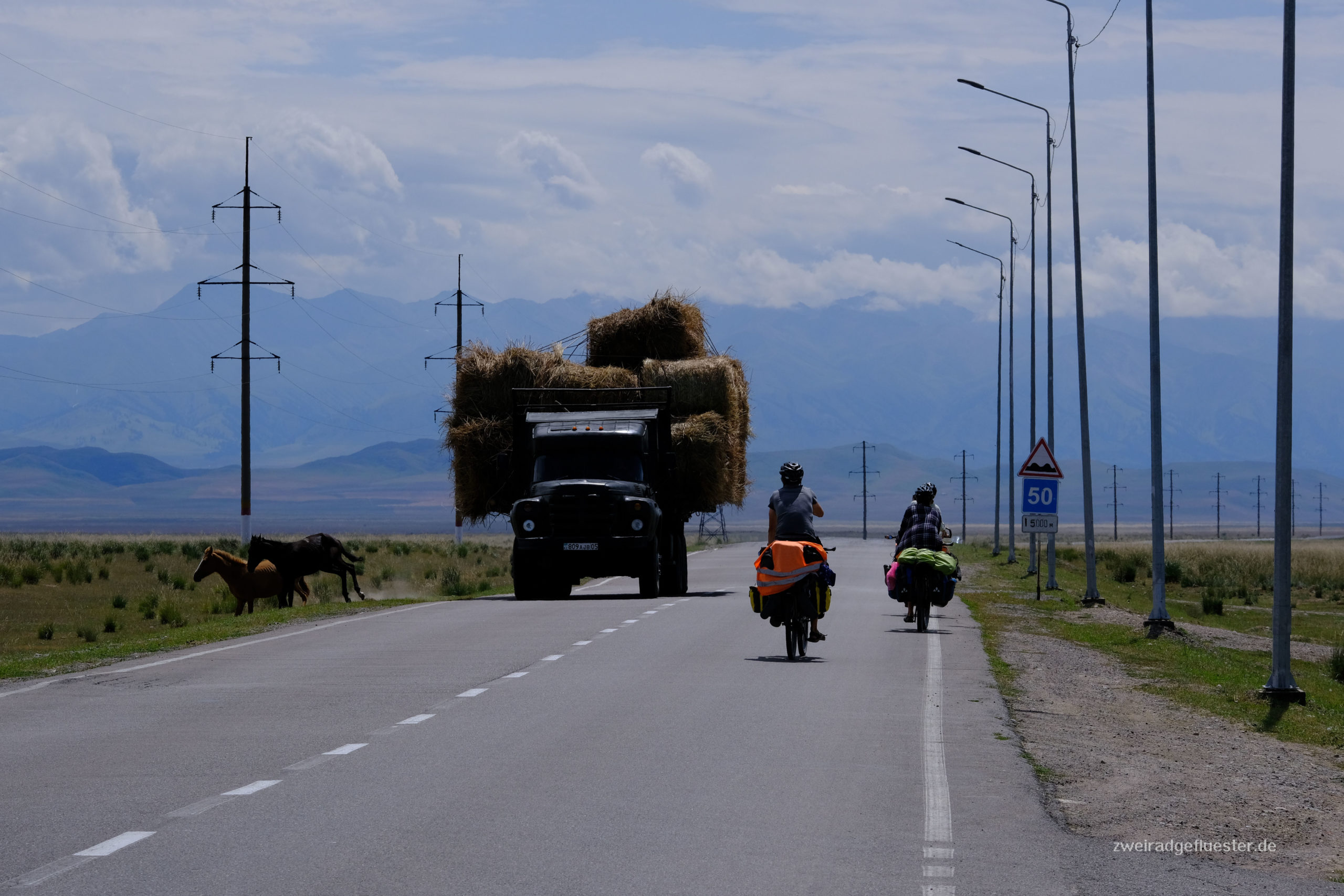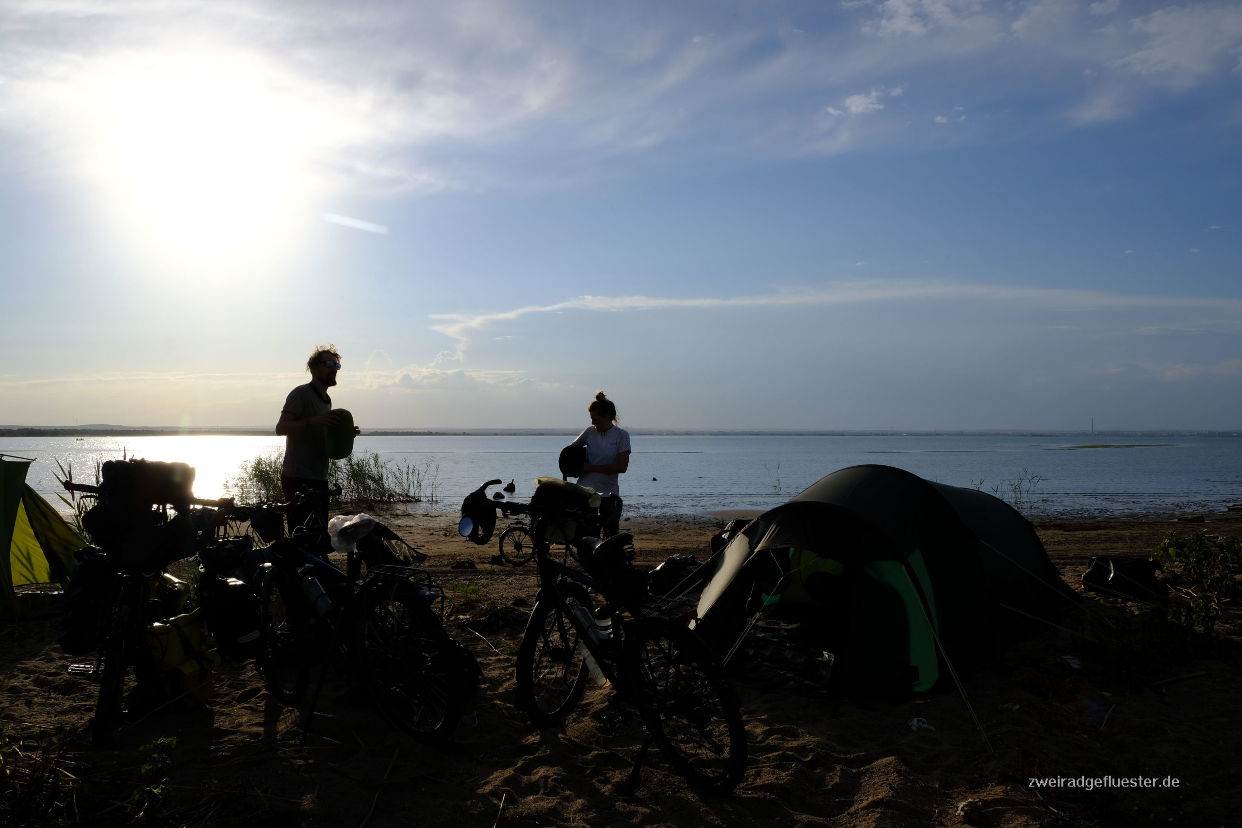 Im Hostel treffen wir auf Antoine und Guénola, die beiden sind auch mit dem Rad unterwegs und in Almaty kreuzen und verbinden sich unsere Wege. Wir sind etwas planlos, welchen Weg wir in Richtung Kirgistan einschlagen sollen. Wir machen es uns einfach, folgen den beiden und verabreden uns grob an einem möglichen Campspot am See nördlich von Almaty. Aus dem kleinen Reiseplausch im Hostel wird eine Freundschaft. Schon auf dem Weg dahin treffen wir uns wieder und ab da radeln wir die nächsten Tage gemeinsam weiter.