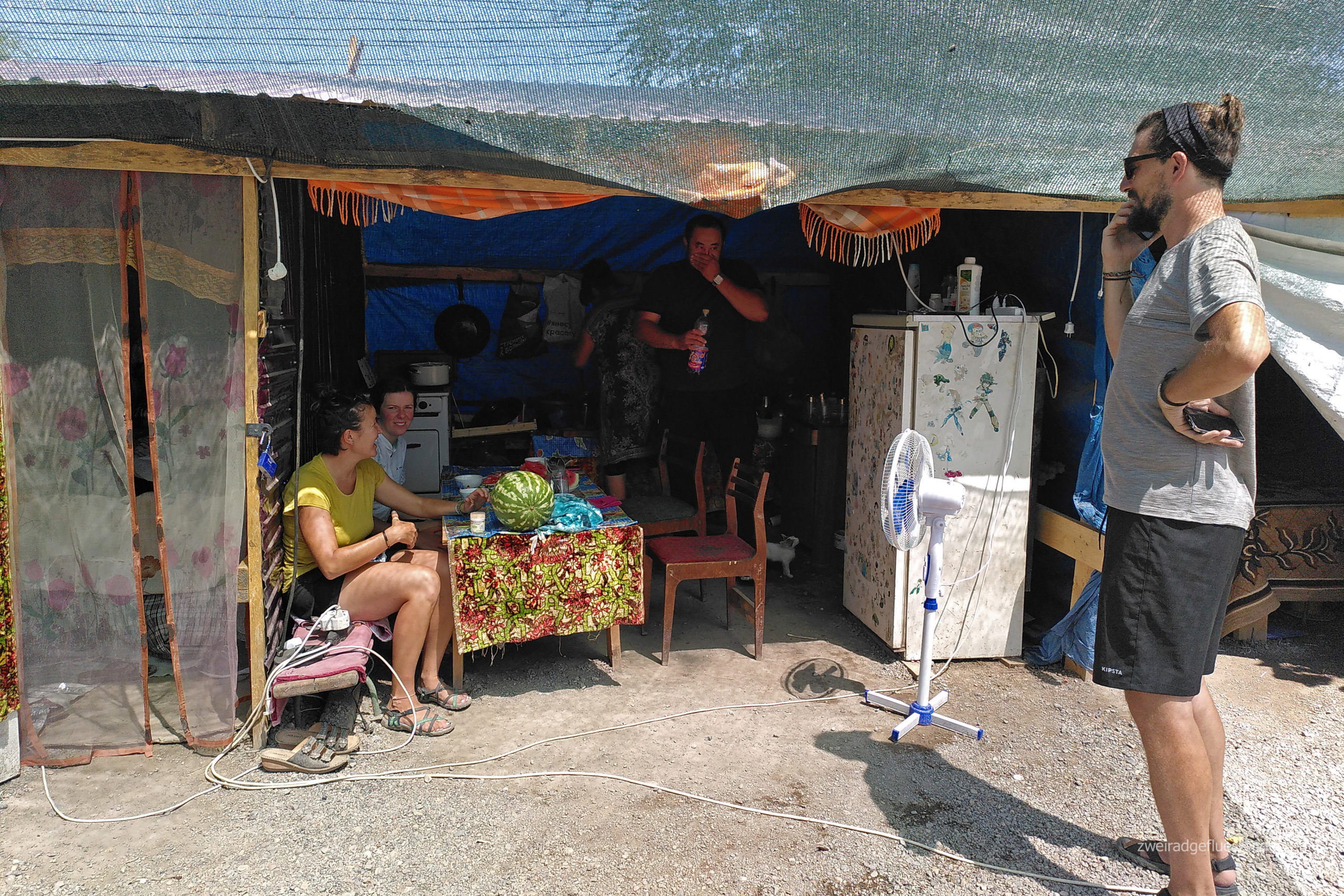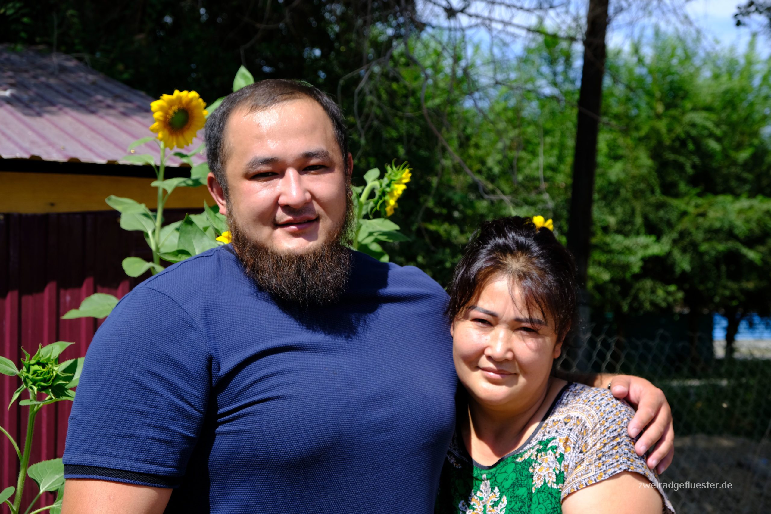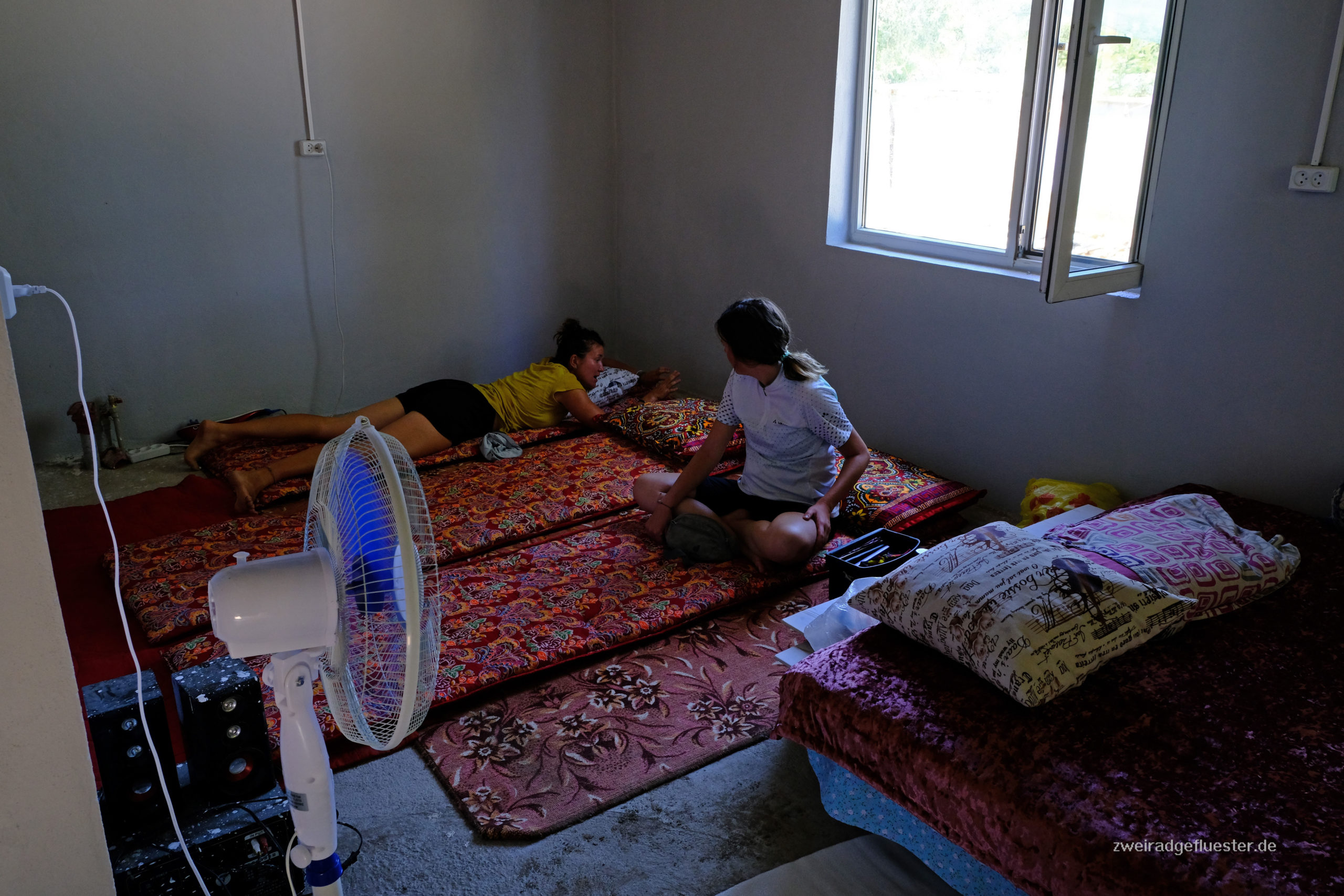 Bislan erzählt uns, dass er Muslim ist und auch er sagt uns wieder, dass Einladen von Reisenden gehört in seiner Religion, dem Islam, einfach dazu. Es ist Freitag und er entschuldigt sich, denn er muss jetzt in die Moschee zum Freitagsgebet. Das sei auch der Grund, warum er nicht mit uns gegessen habe. Wir sollen es uns in der Zwischenzeit im Haus gegenüber gemütlich machen und eine Pause von der Mittagssonne genießen. Eine Wahl haben wir nicht wirklich, denn die liebenswerte Mutter ist schon dabei Matratzen und Kissen in das halbfertige Haus zu räumen. Es ist gerade im Bau, doch heute am Freitag wird nicht gearbeitet. Trotz der Baustelle fungiert das Haus bereits als Wohnung für die beiden. Wir machen es uns gemütlich und ein Nickerchen, bevor wir uns von Bislan und Maida verabschieden. Was für eine schöne Mittagspause!