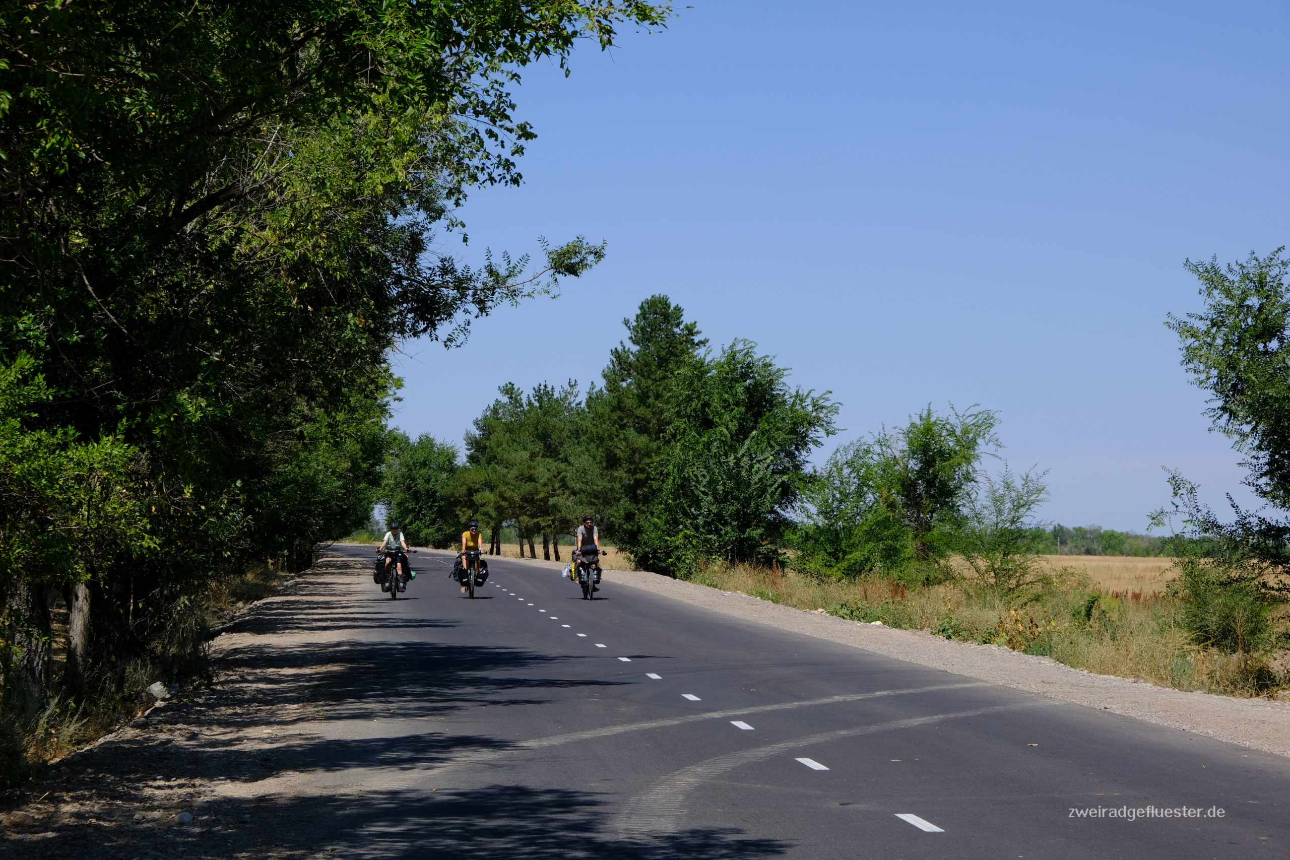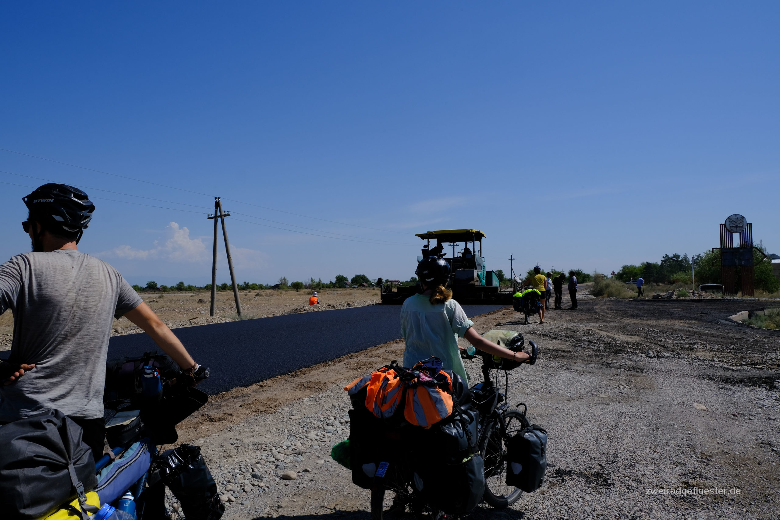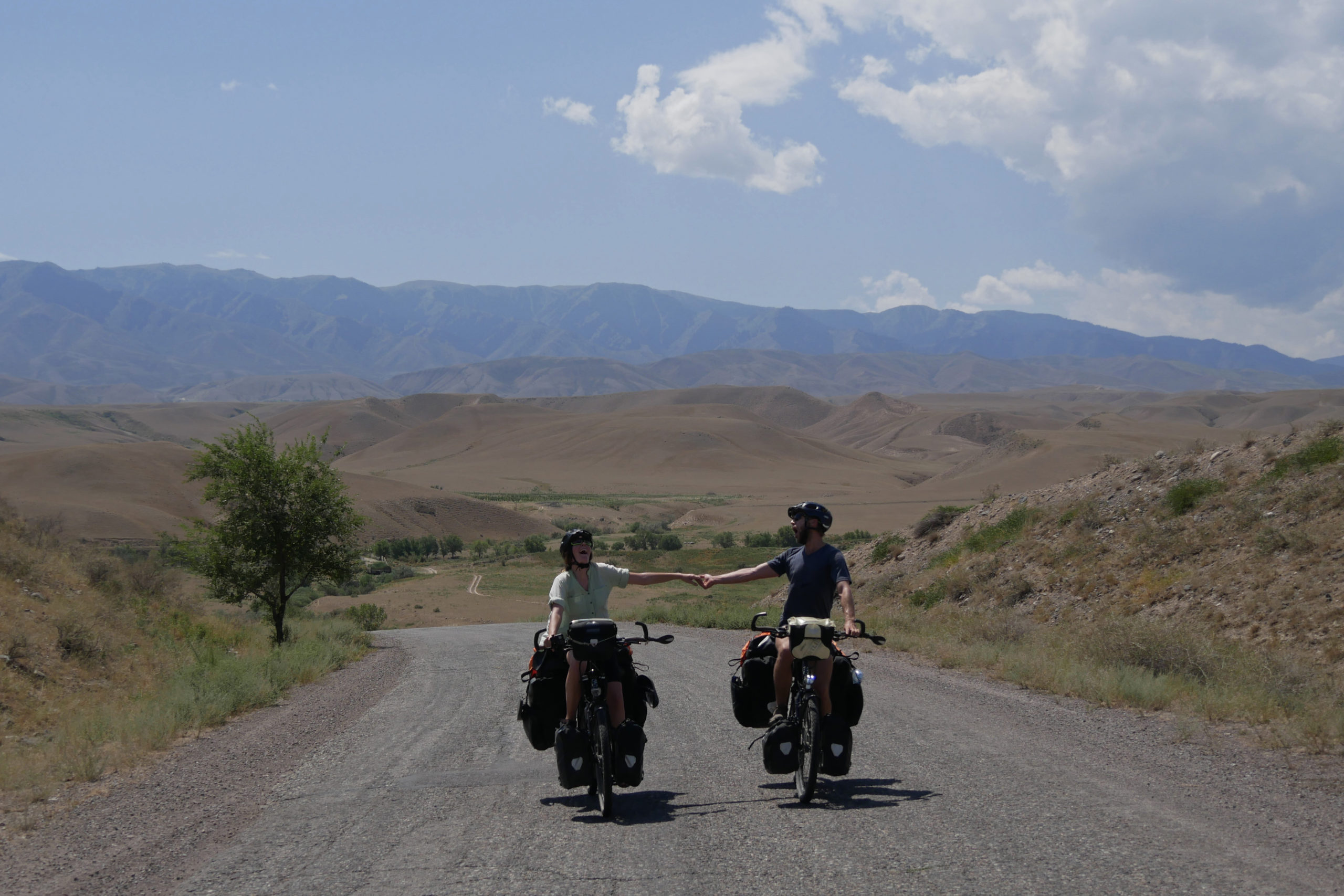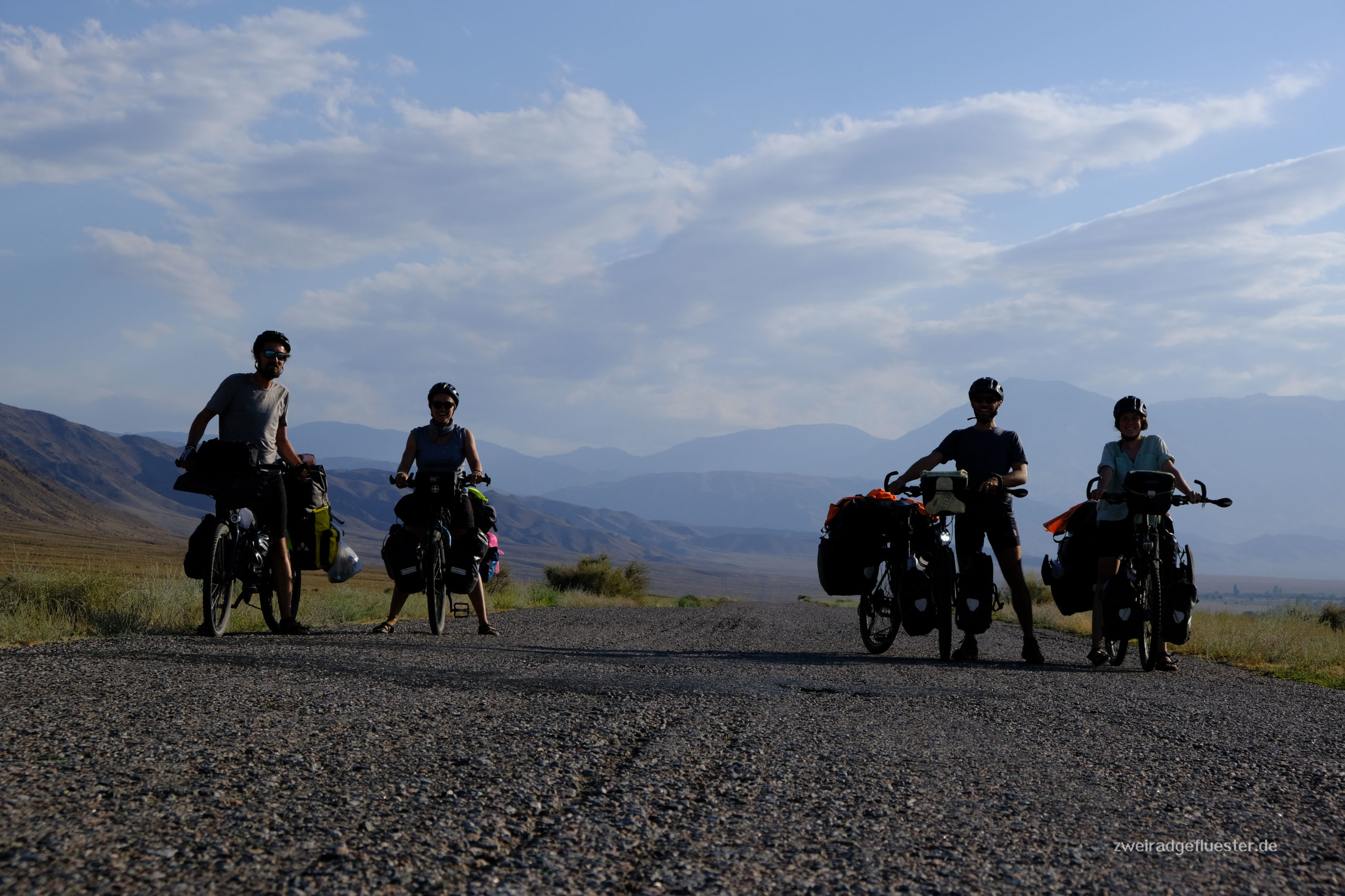 Wir radeln gemeinsam mit Antoine & Guéno in Richtung Kirgistan. Die beiden haben ungefähr das gleiche Tempo und den gleichen Rhythmus wie wir. Es ist das erste Mal auf unserer Reise, dass wir mit anderen Radreisenden länger als einen Tag unterwegs sind. Auf eine gewisse Art fühlt es sich an wie Urlaub. Besonders nach den angespannten Tagen in Iran, ob denn auch wirklich alles gut gehen wird mit dem Flug und co., können wir uns nun einfach wieder treiben lassen. Dabei teilen wir uns die Entscheidungen mit den beiden und man macht sich auch nur noch halb so viele Gedanken über alles, denn acht Augen sehen mehr als vier und vier Köpfe haben mehr Ideen als zwei.