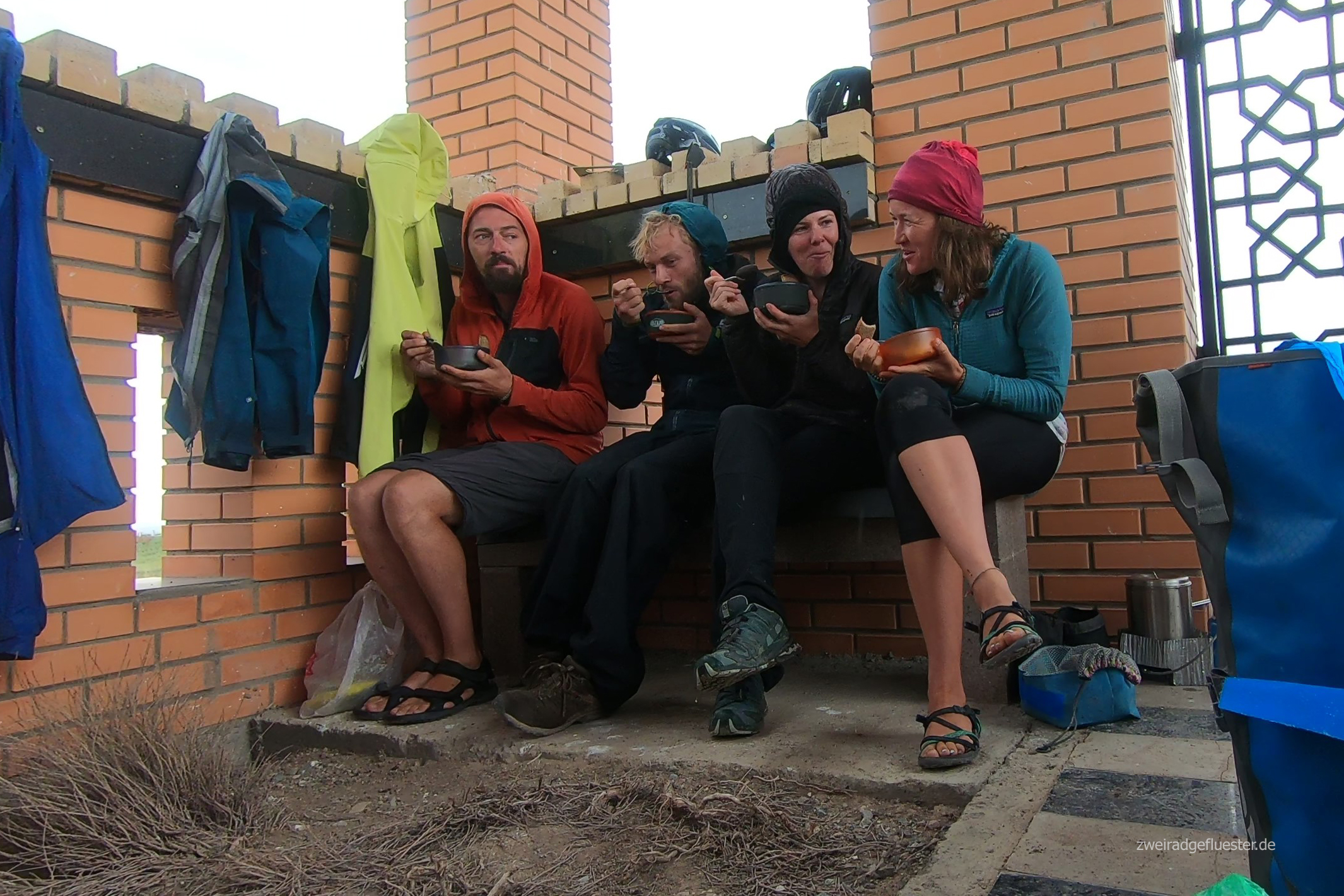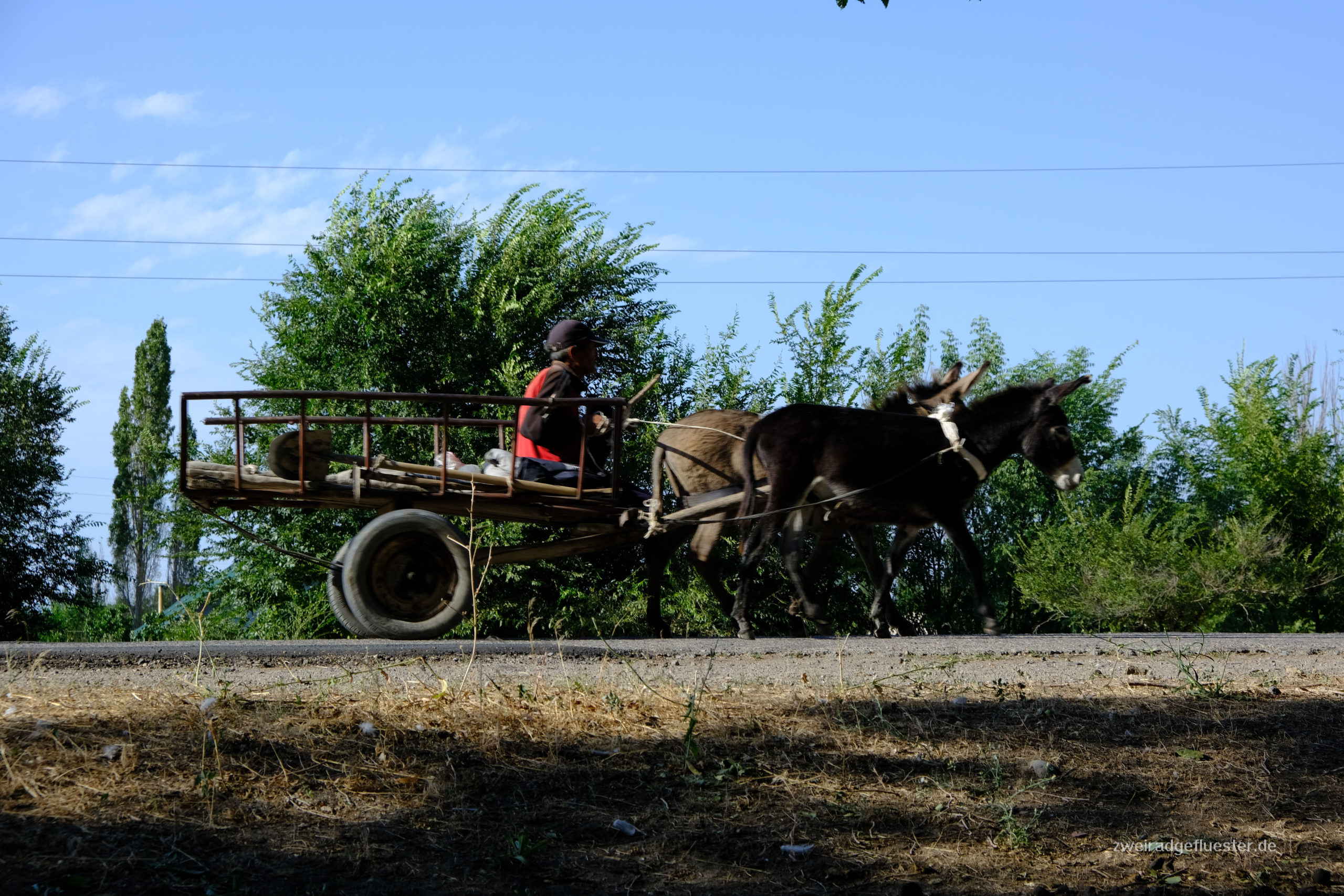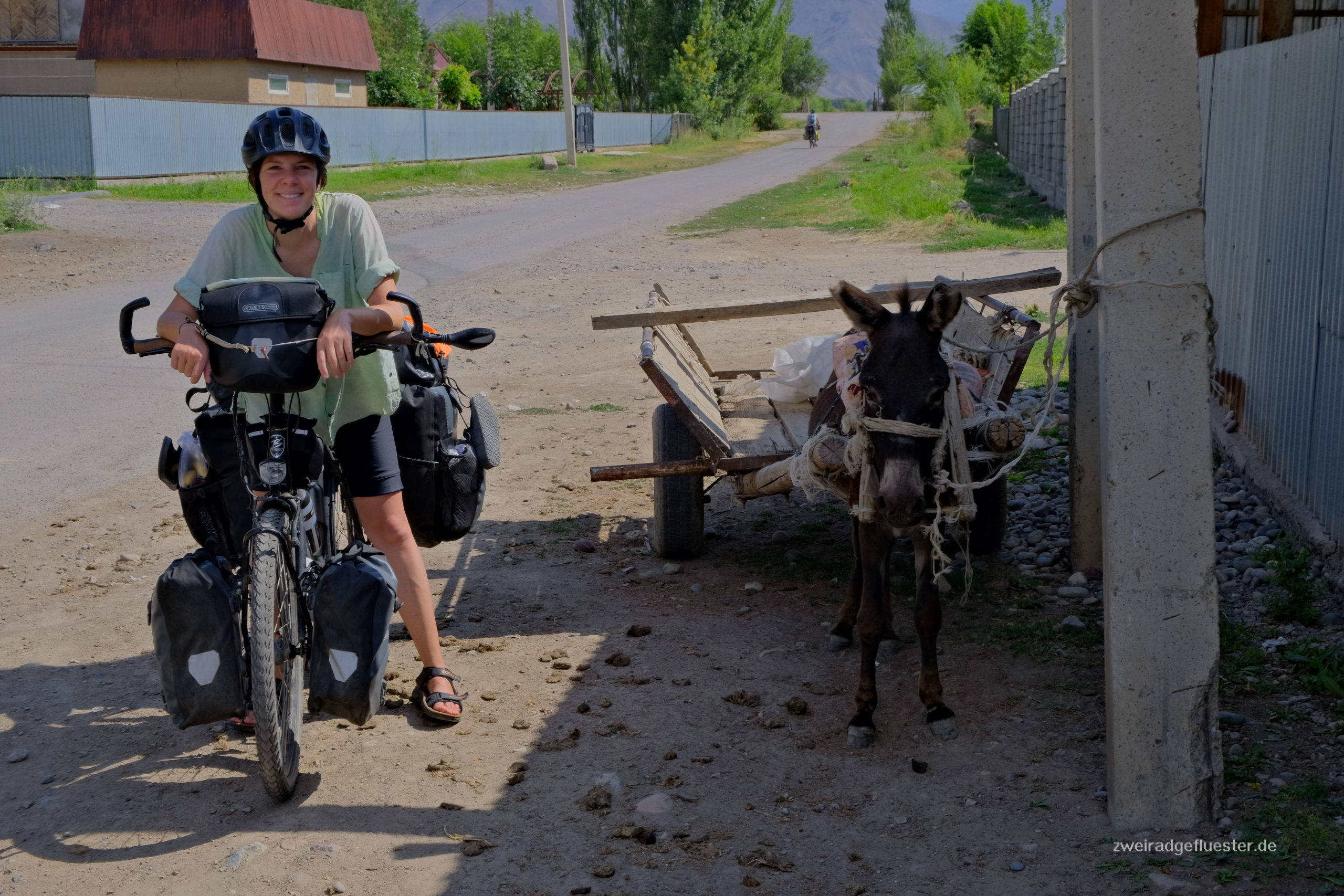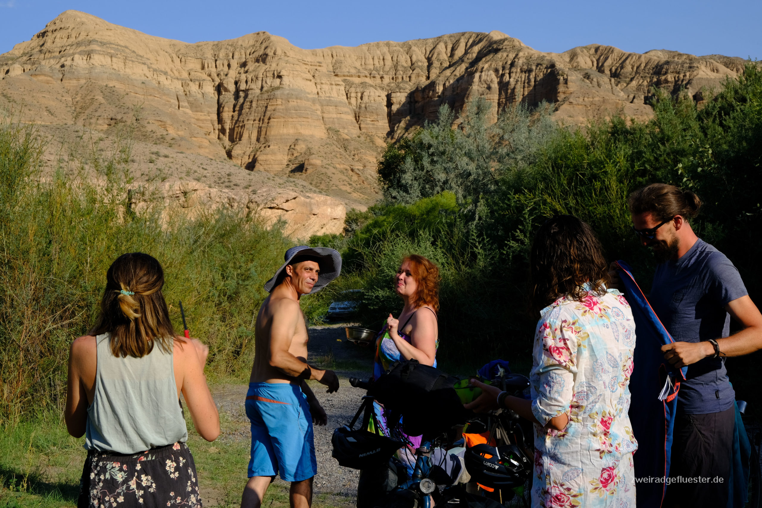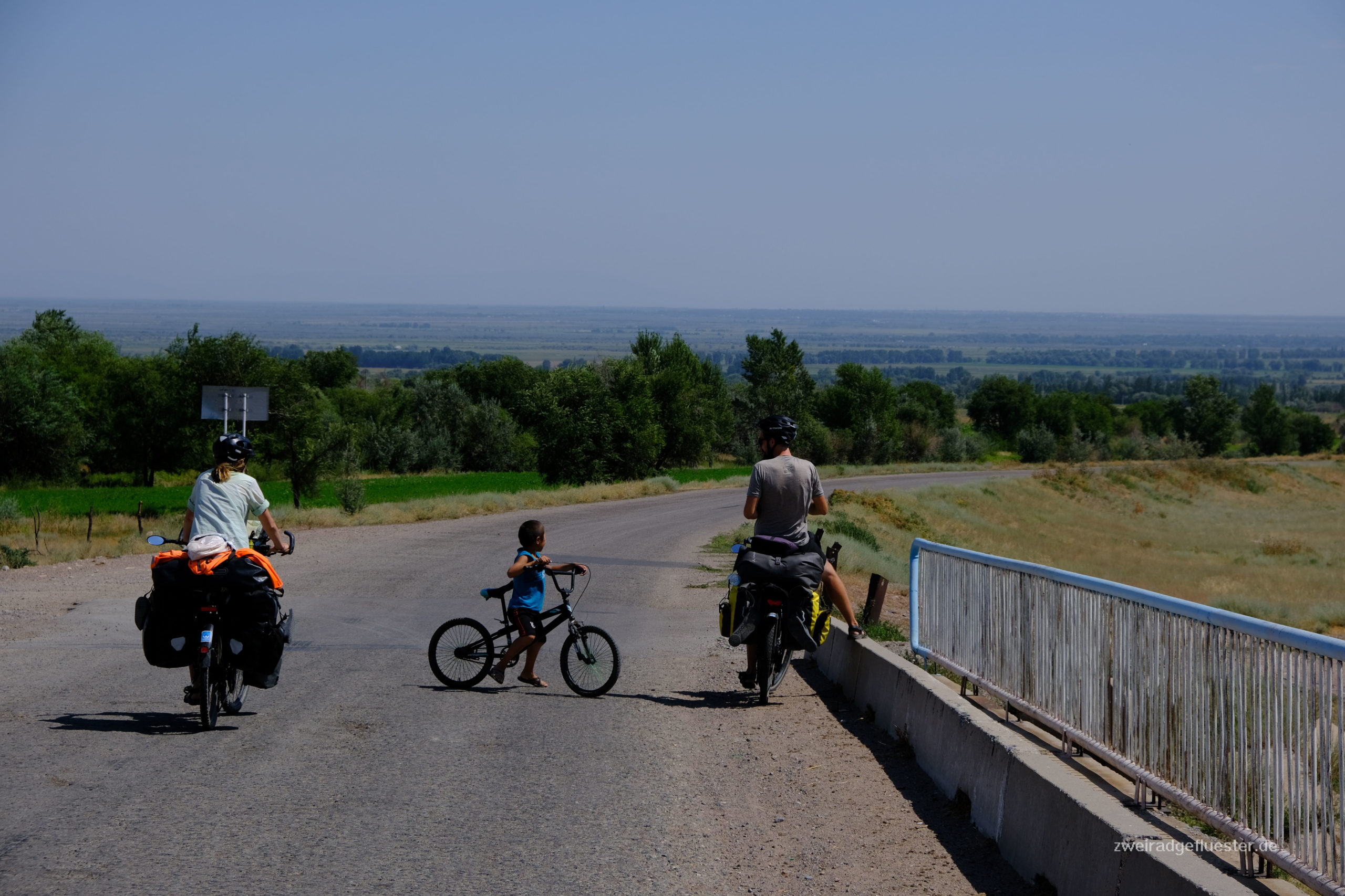 Wir radeln gemeinsam mit Antoine & Guéno in Richtung Kirgistan. Die beiden haben ungefähr das gleiche Tempo und den gleichen Rhythmus wie wir. Es ist das erste Mal auf unserer Reise, dass wir mit anderen Radreisenden länger als einen Tag unterwegs sind. Auf eine gewisse Art fühlt es sich an wie Urlaub. Besonders nach den angespannten Tagen in Iran, ob denn auch wirklich alles gut gehen wird mit dem Flug und co., können wir uns nun einfach wieder treiben lassen. Dabei teilen wir uns die Entscheidungen mit den beiden und man macht sich auch nur noch halb so viele Gedanken über alles, denn acht Augen sehen mehr als vier und vier Köpfe haben mehr Ideen als zwei.