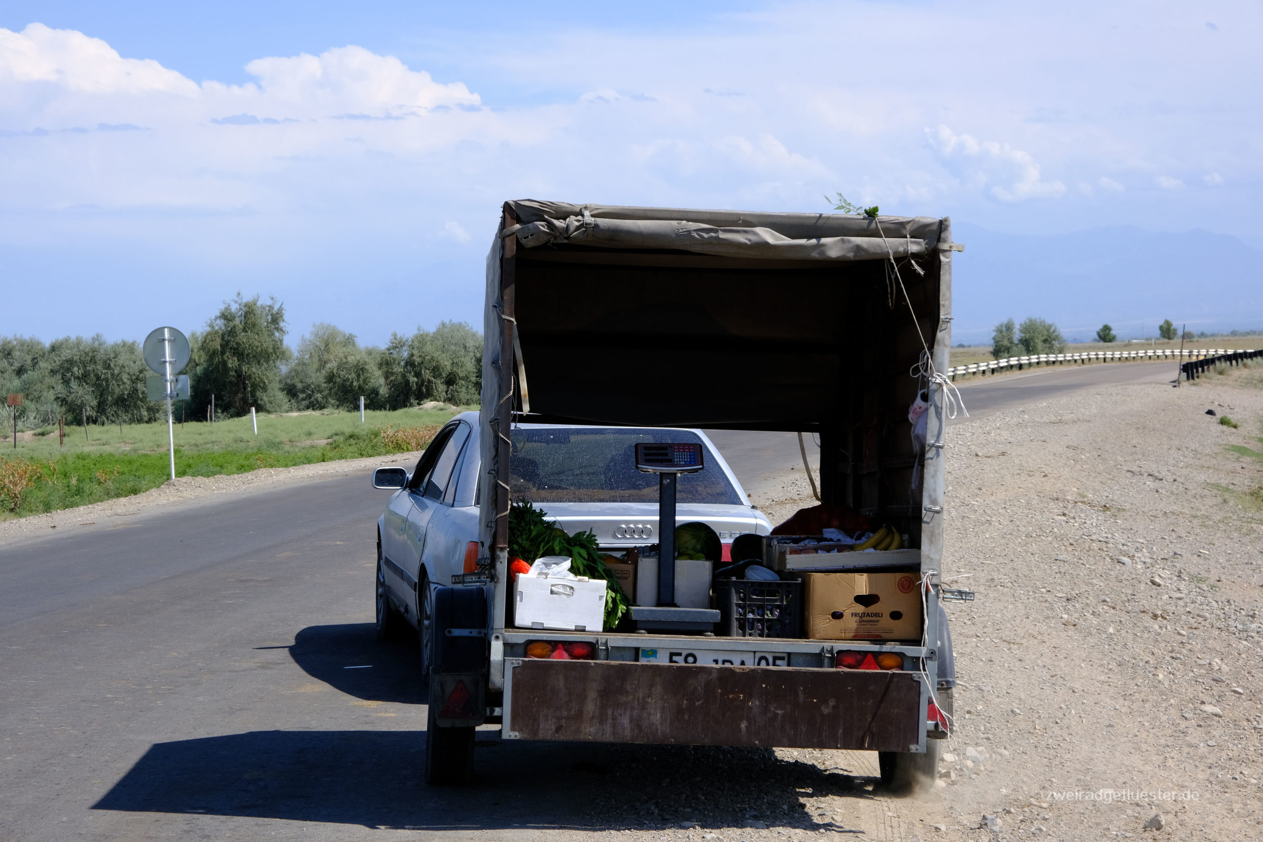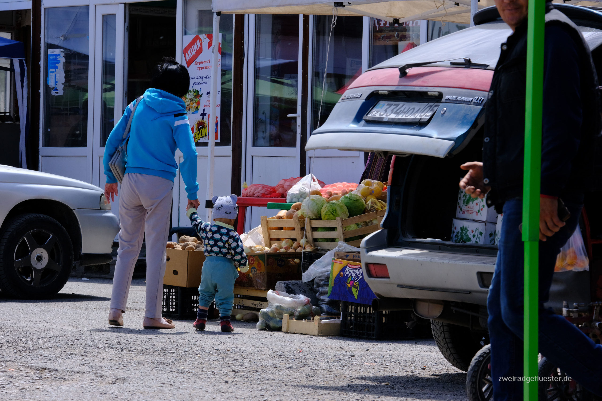 Wir decken uns in der kleinen Stadt Kegen mit frischem Obst und Gemüse für die nächsten Tage ein und verbringen unsere letzte Nacht in Kasachstan.