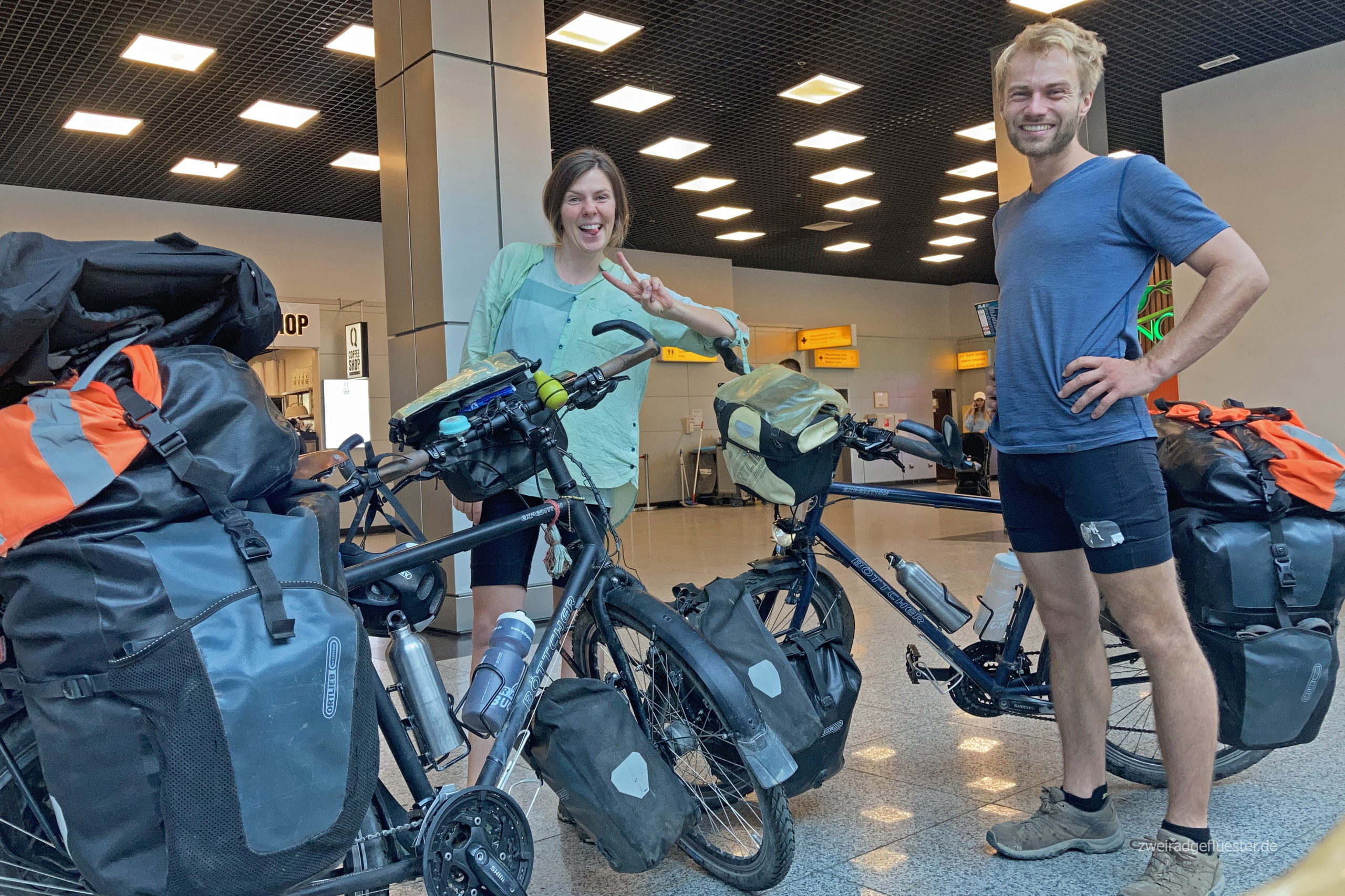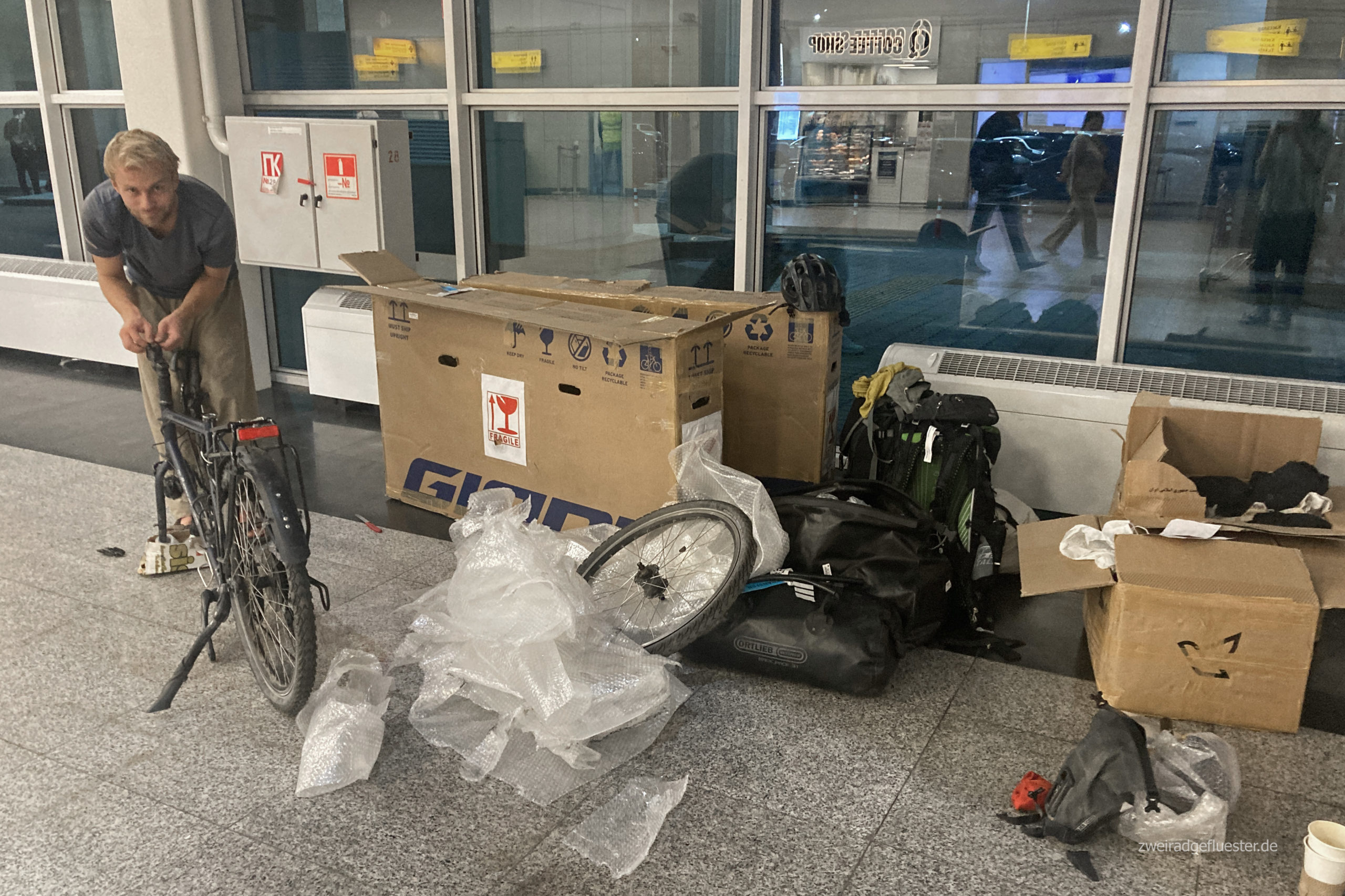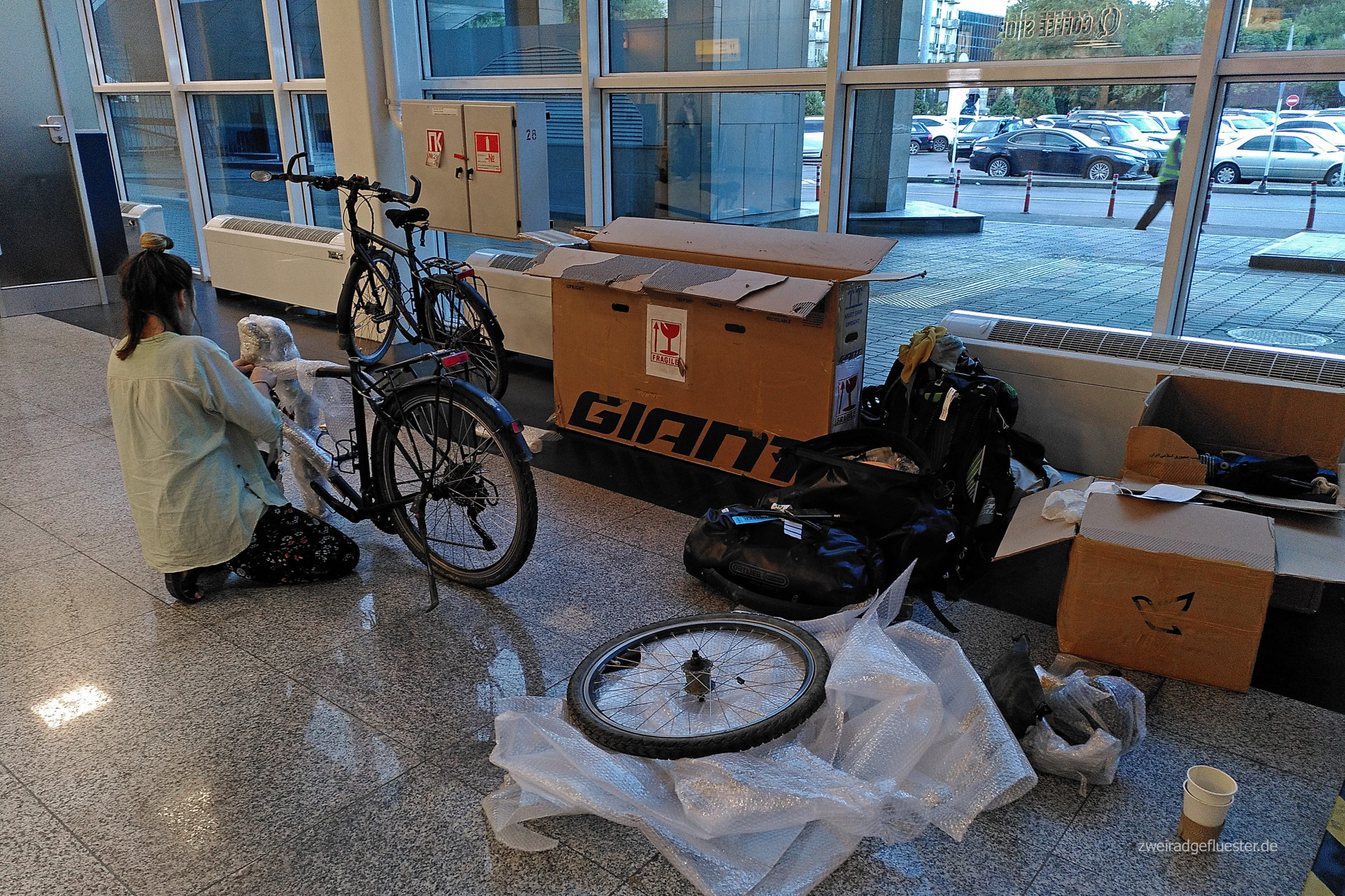 Wir landen gegen 3 Uhr nachts und warten wenig später müde, aber doch sehr aufgeregt an der Gepäckausgabe. Als wir nach der Ankunft in Almaty nach unseren Fahrradkartons fragen, werden wir einfach nur abgewimmelt und genervt angeschaut. Irgendwann kommen dann aber endlich unsere Kartons auf dem Gepäckband zum Vorschein. Auch der Blick hinein lässt uns aufatmen.