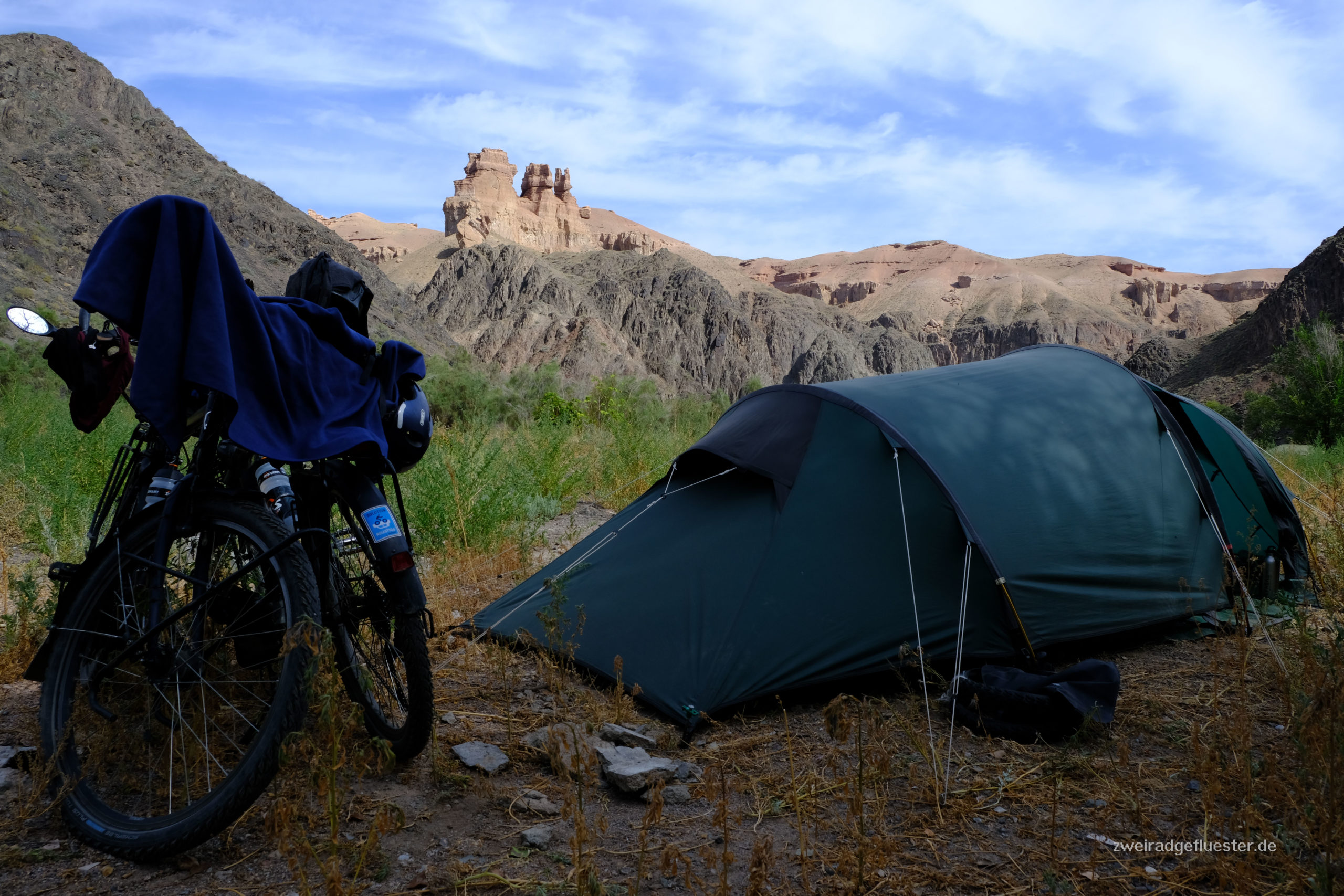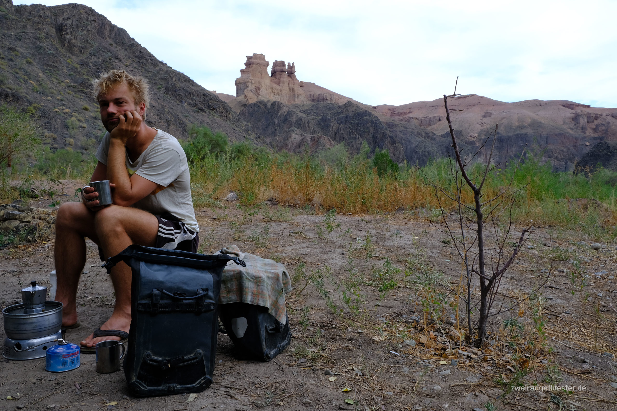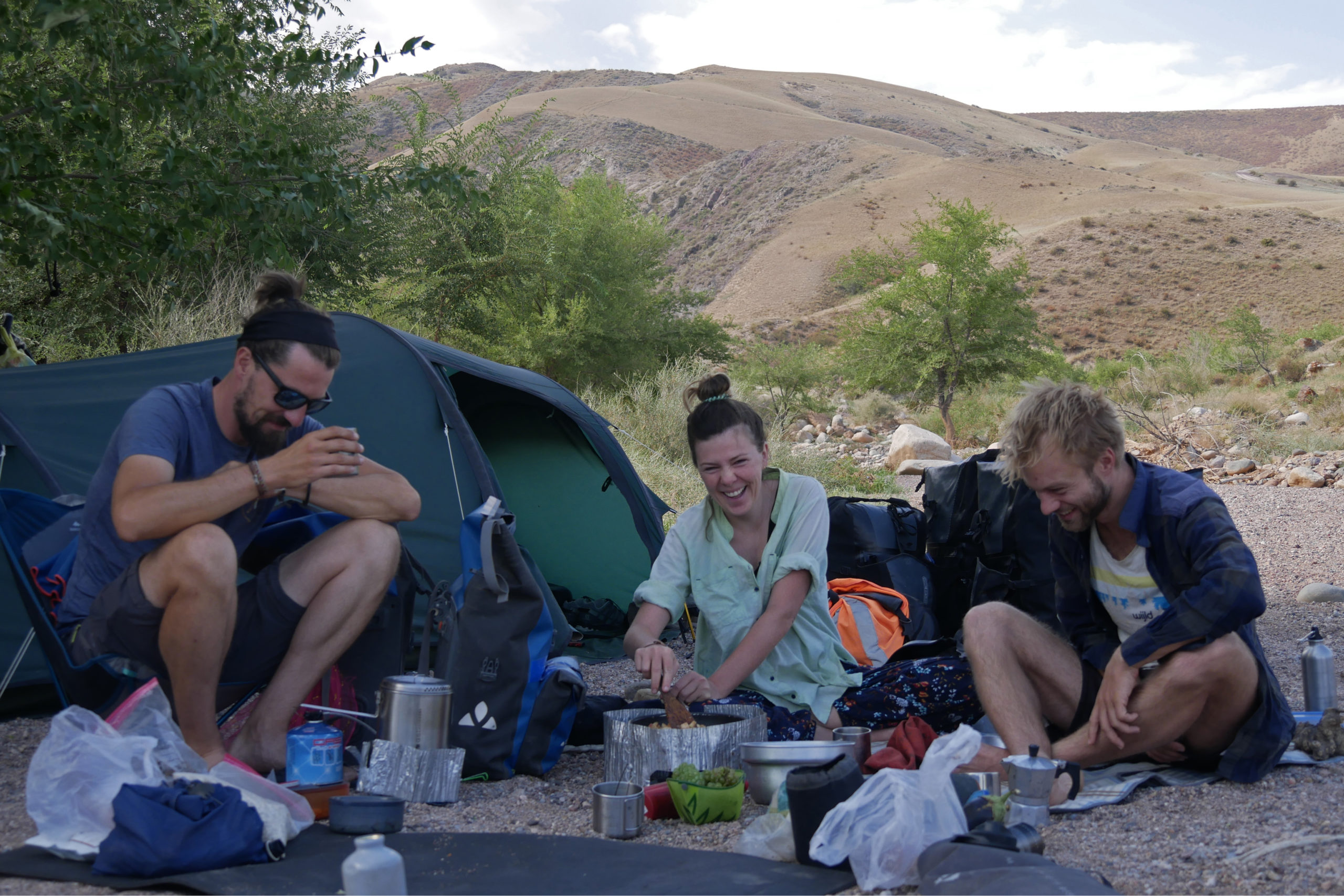 Man kann nicht nur durch diesen Canyon radeln, sondern auch mittendrin übernachten und so genießen wir den Blick nicht nur am Abend, sondern auch während des Frühstücks am stark rauschenden Fluss, bevor wir uns die Höhenmeter wieder hocharbeiten müssen. Ein paar Kilometer weiter legen wir einen weiteren Stopp ein. Die Landschaft ist einfach zu schön, um sie schon wieder zu verlassen. An diesem traumhaften Platz treffen wir außer ein paar Kühen nur noch ein kasachisches Pärchen, die hier fernab des tagsüber doch sehr frequentierten Canyons wohl auch Zuflucht und ein bisschen mehr Ruhe suchen. Sie begrüßen uns herzlich und wir kommen später in den Genuss eines kasachischen Barbecues. Der Geruch von Gegrilltem lag schon länger in der Luft und wir verspürten alle einen Heißhunger darauf. Die Freude war entsprechend groß, als unsere Nachbarn mit zwei liebevoll hergerichteten Würstchen herüberkamen.