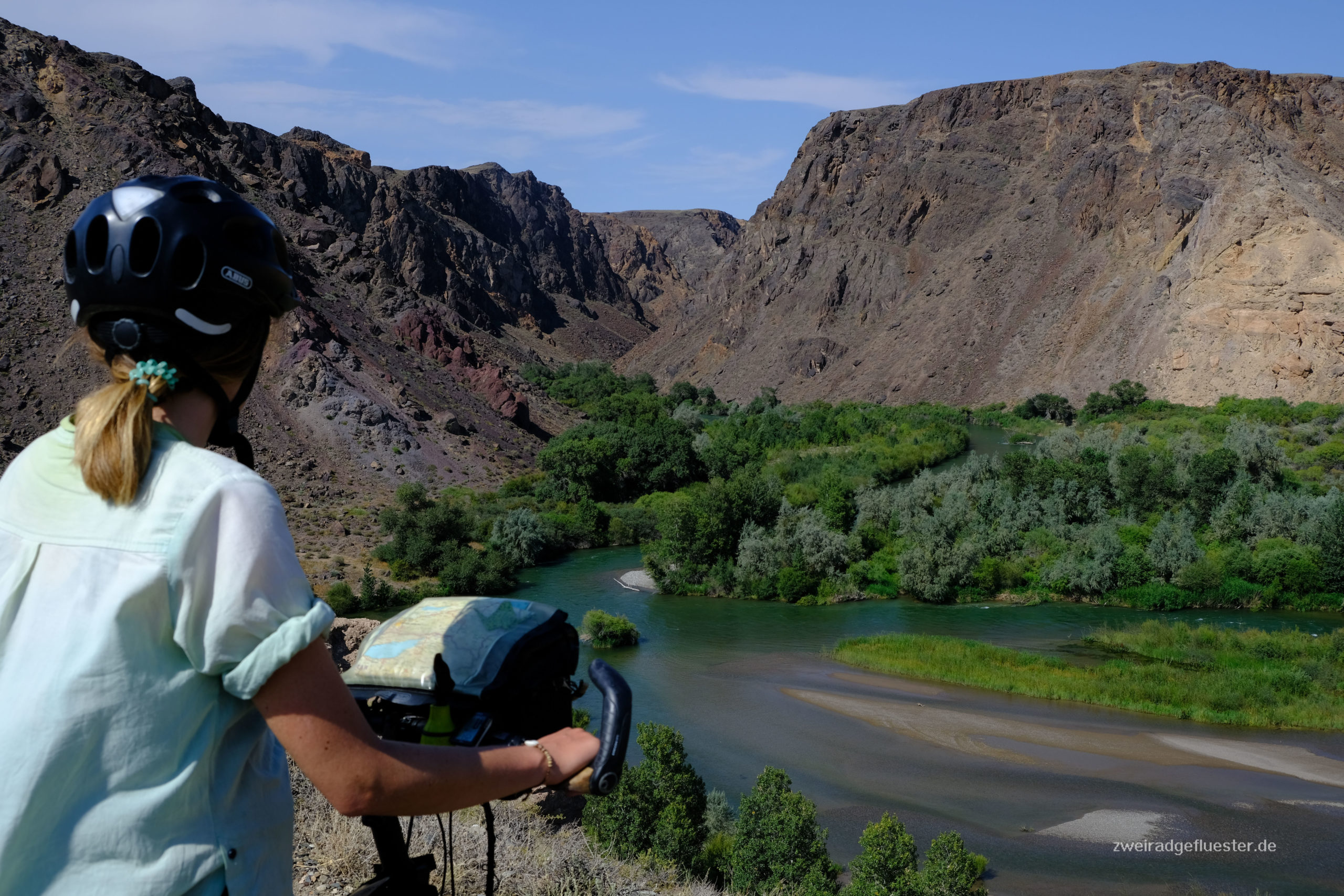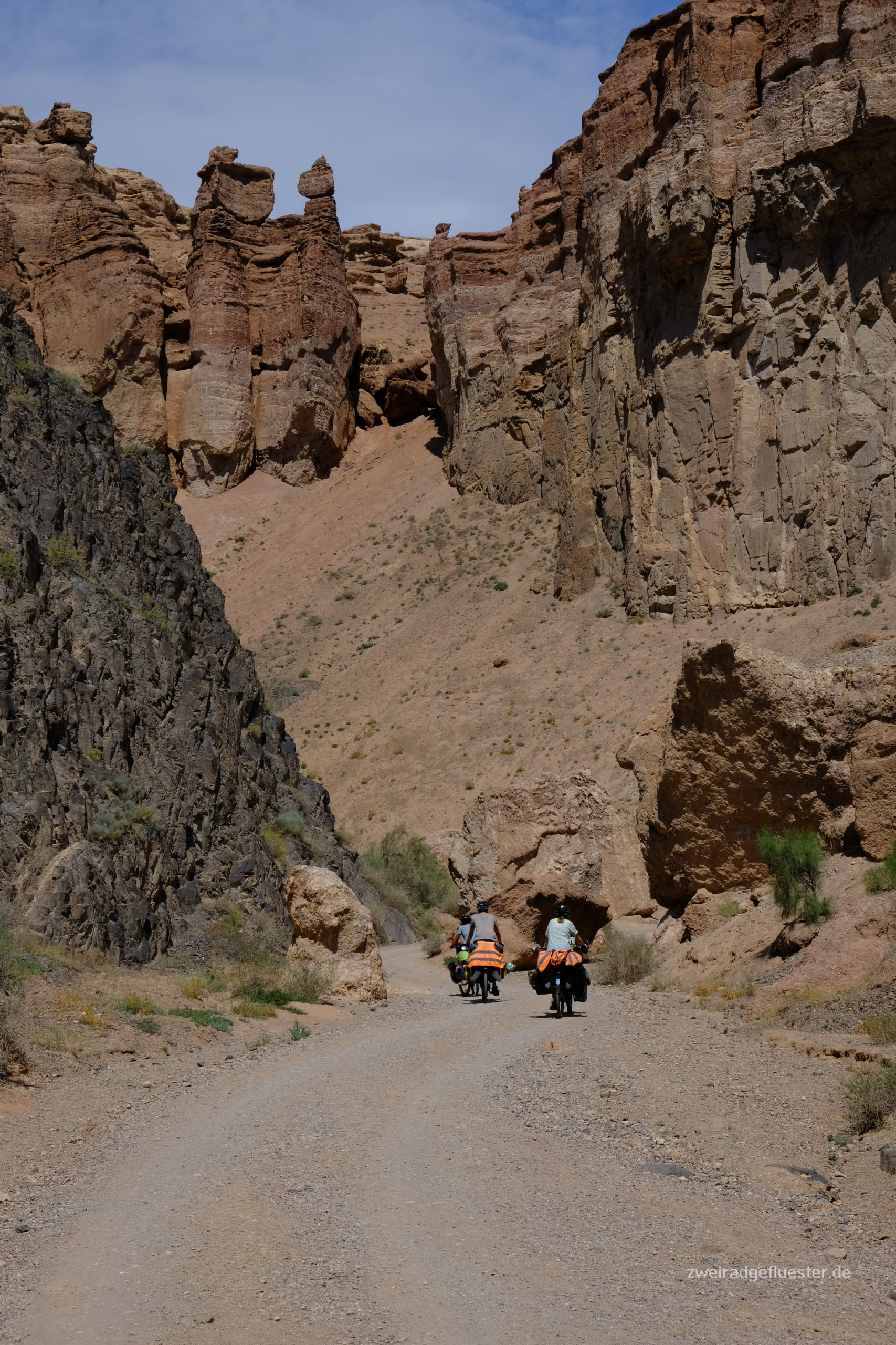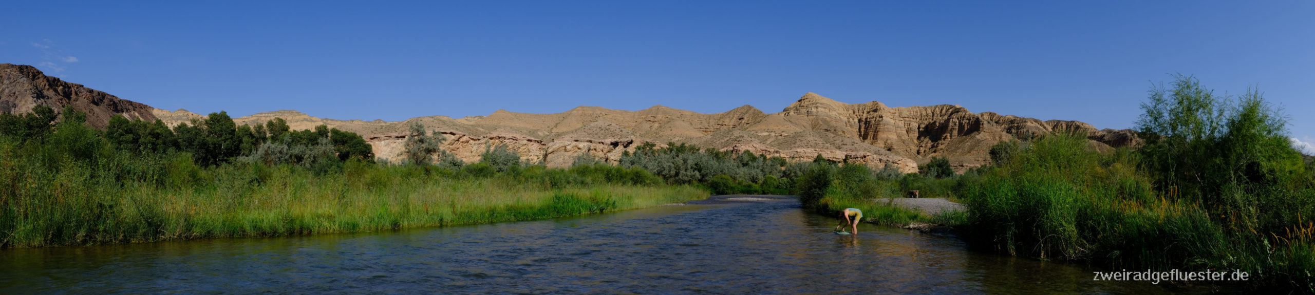 Man kann nicht nur durch diesen Canyon radeln, sondern auch mittendrin übernachten und so genießen wir den Blick nicht nur am Abend, sondern auch während des Frühstücks am stark rauschenden Fluss, bevor wir uns die Höhenmeter wieder hocharbeiten müssen. Ein paar Kilometer weiter legen wir einen weiteren Stopp ein. Die Landschaft ist einfach zu schön, um sie schon wieder zu verlassen. An diesem traumhaften Platz treffen wir außer ein paar Kühen nur noch ein kasachisches Pärchen, die hier fernab des tagsüber doch sehr frequentierten Canyons wohl auch Zuflucht und ein bisschen mehr Ruhe suchen. Sie begrüßen uns herzlich und wir kommen später in den Genuss eines kasachischen Barbecues. Der Geruch von Gegrilltem lag schon länger in der Luft und wir verspürten alle einen Heißhunger darauf. Die Freude war entsprechend groß, als unsere Nachbarn mit zwei liebevoll hergerichteten Würstchen herüberkamen.
