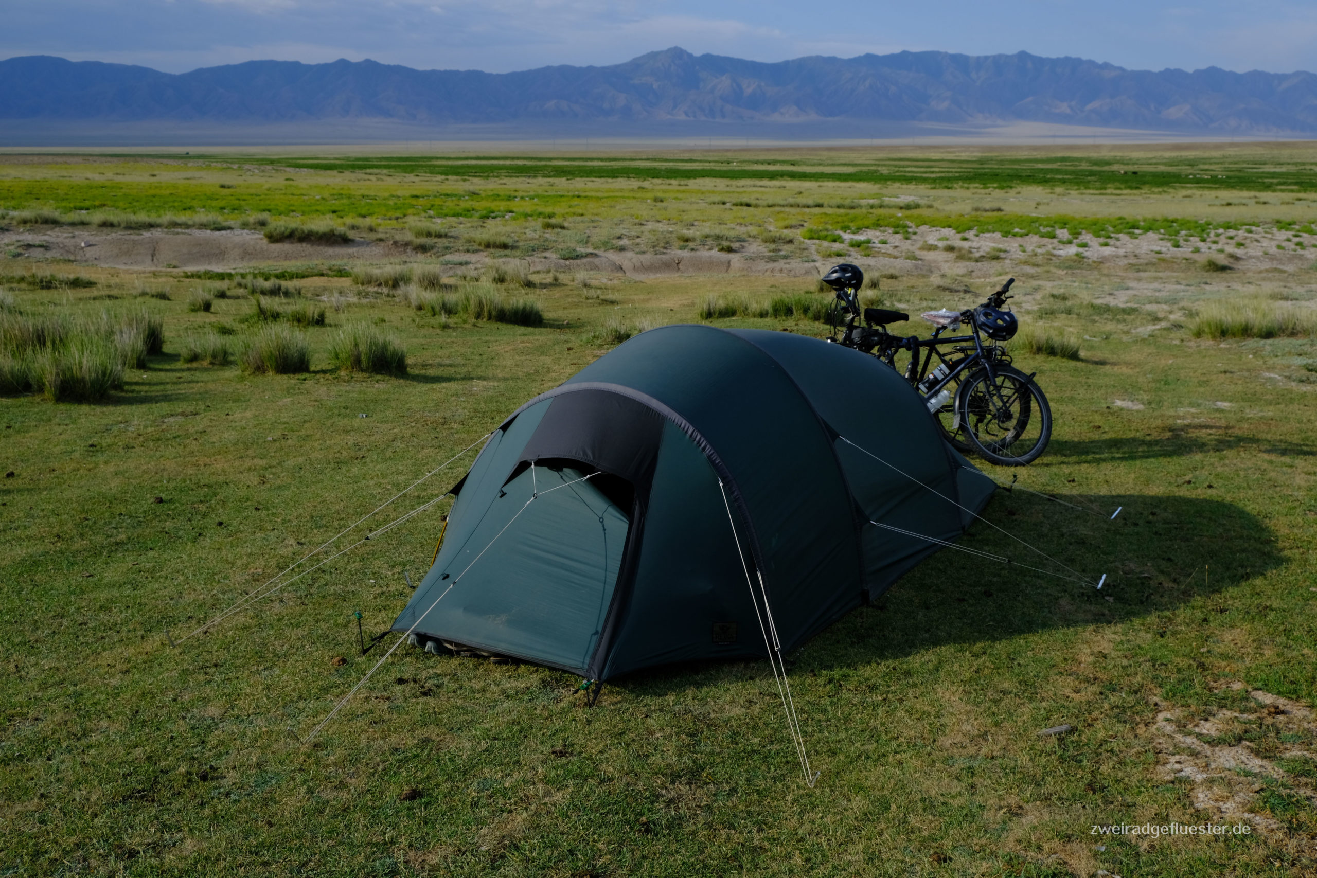 Wir fragen die Besitzer des Restaurants, was wohl auch irgendwie ihr Wohnhaus ist, ob wir hinter dem Haus unsere Zelte aufstellen können. Also schieben wir die Räder im Dunkeln vorbei an den Containern, dem Plumpsklo des Restaurants sowie den Ställen der Tiere weiter über die holprige Weide, die sich in der Weite verliert und bauen unsere Zelte auf.