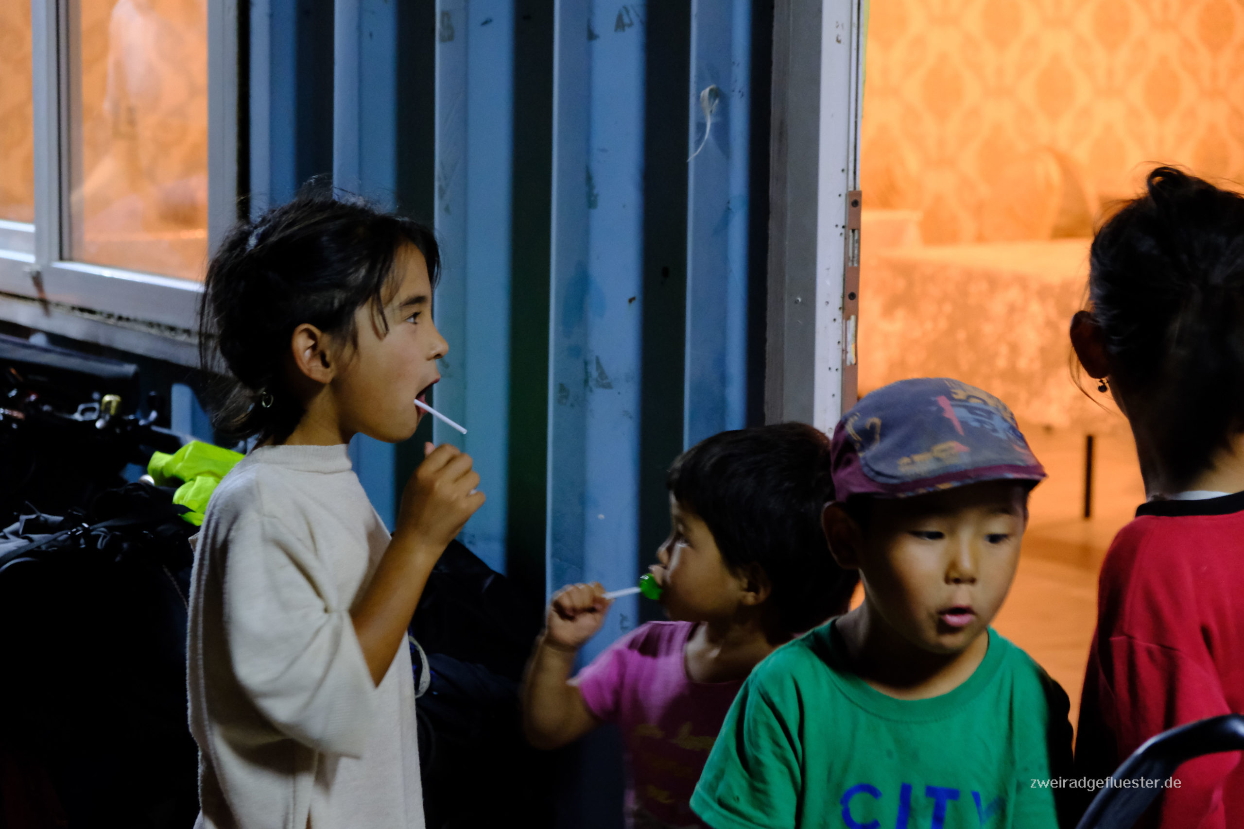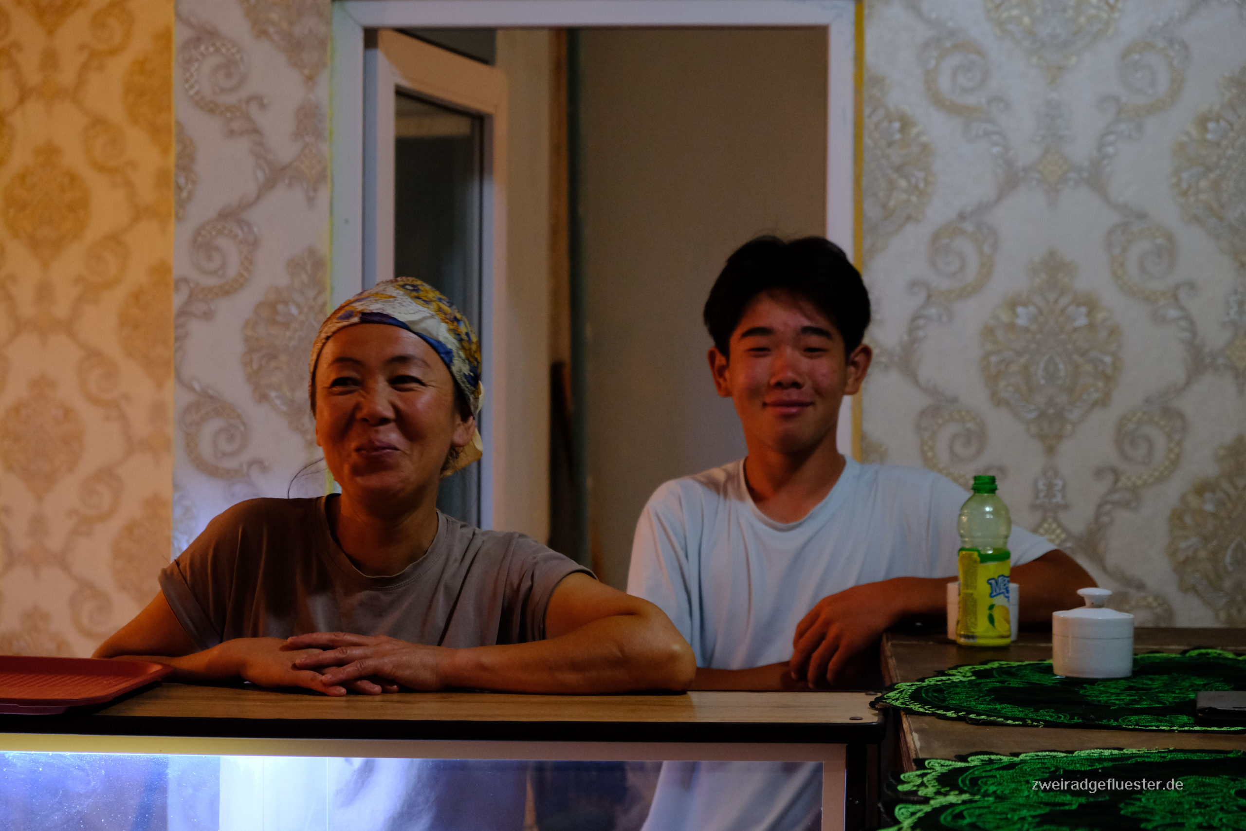 Doch ruhig ist es hier nicht, ein Restaurant reiht sich an das andere, kleine Shops und Stände versorgen hier scheinbar die Tourist:innenbusse von und nach Kirgistan. Wir lassen uns verführen und bestellen uns in einem kleinen Restaurant, bestehend aus drei Schiffscontainern, Laghman und Cay, der in Zentralasien traditionell immer aus kleinen Schüsseln geschlürft wird. Begrüßt werden wir von den liebevollen Kindern der Familie, die uns auch direkt auf English ausfragen und neugierig unsere Räder inspizieren.