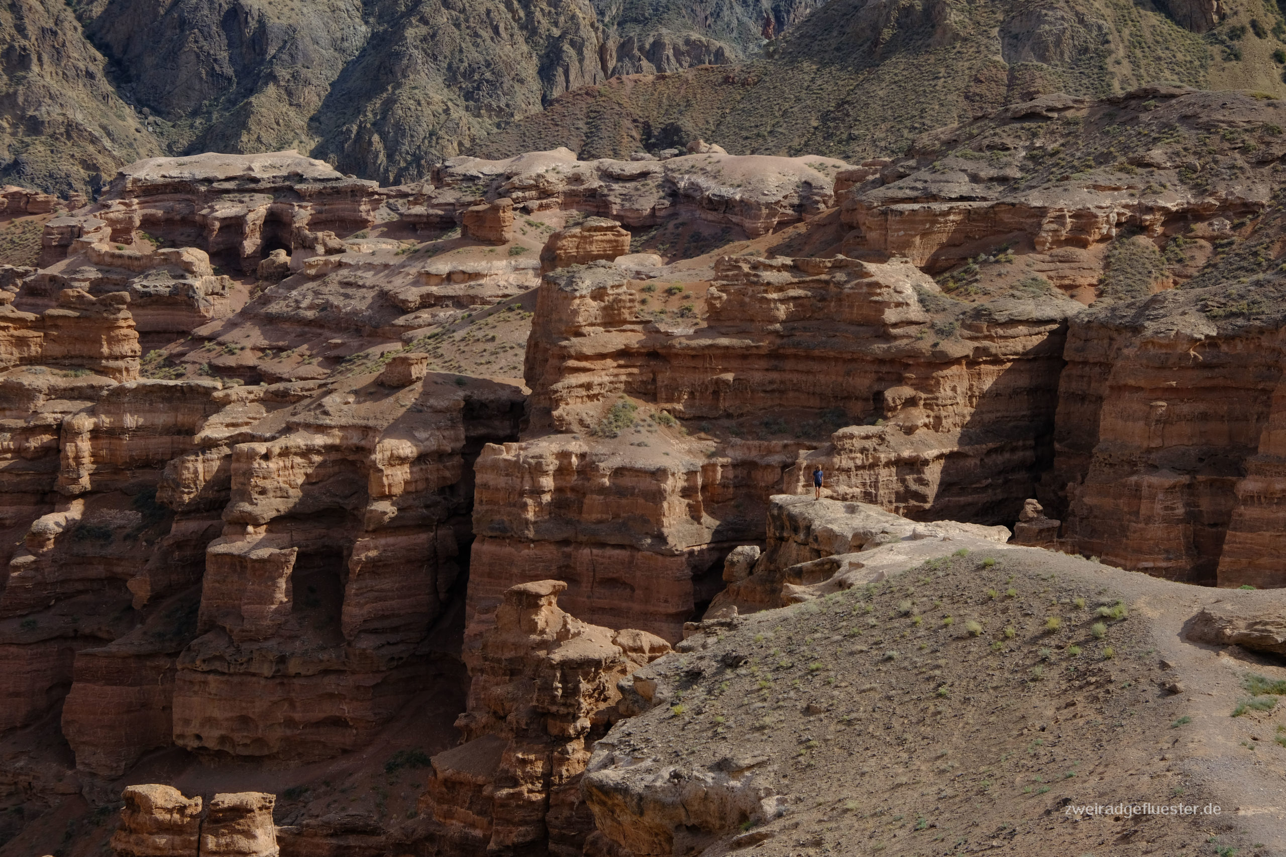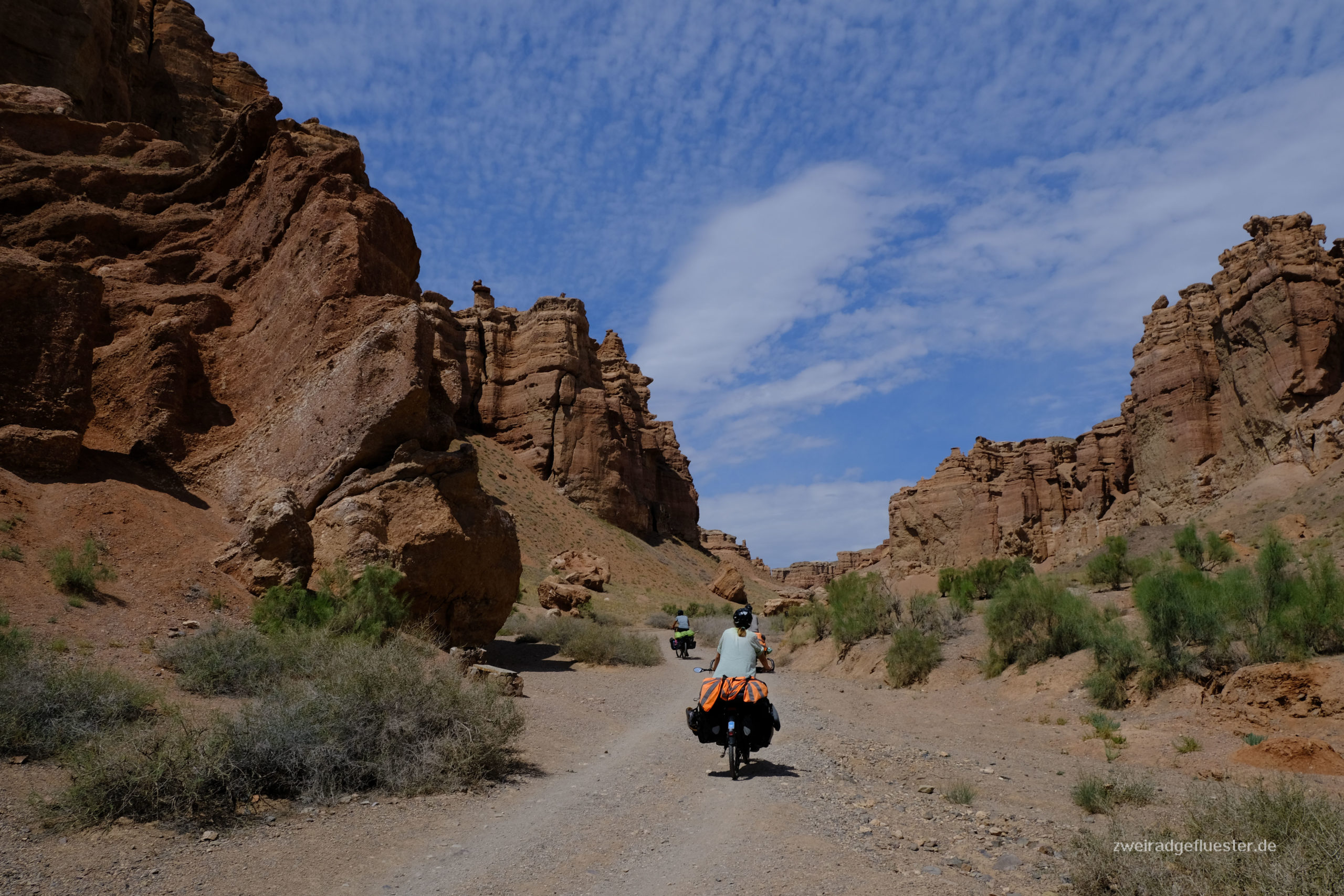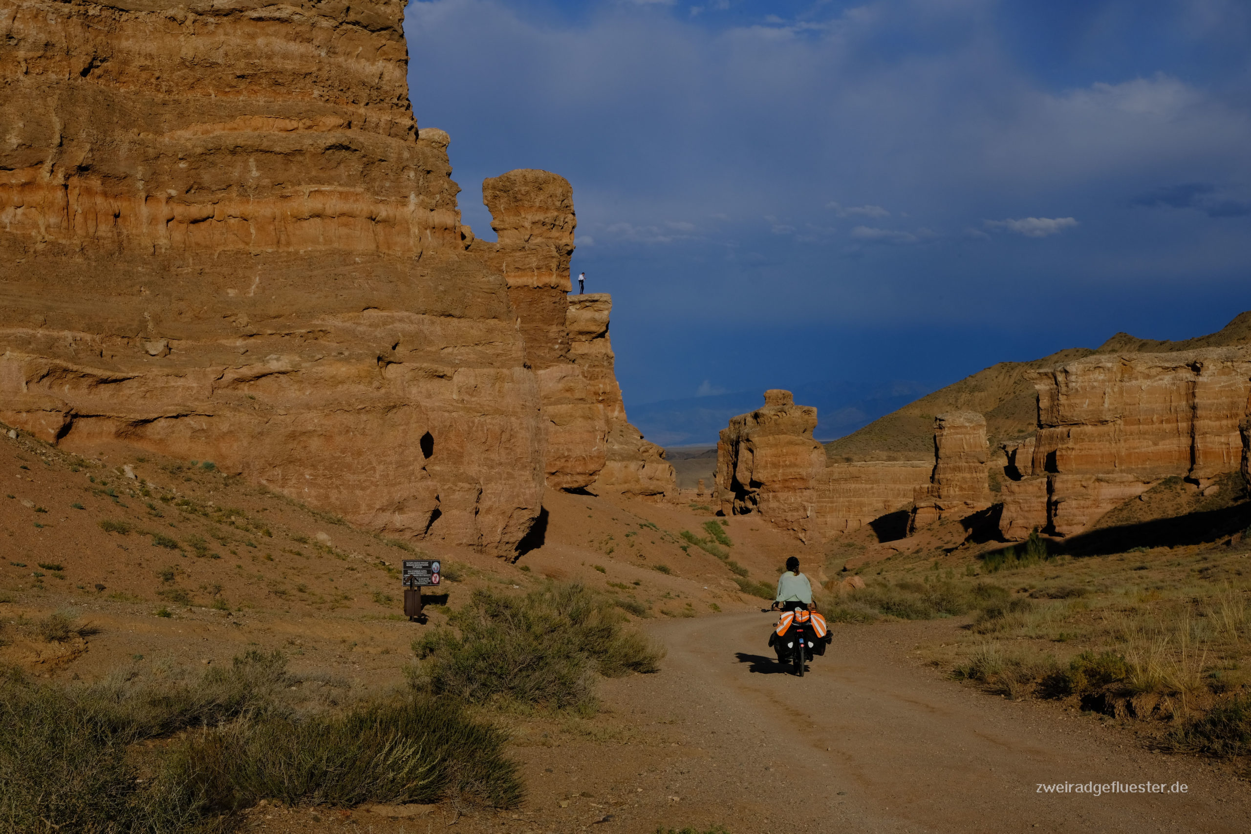 Auch an diesem Tag bläst uns der Wind weiter gen Osten und wir kommen schneller als gedacht im Charyn Canyon an. In diesem Nationalpark hat der Charyn Fluss vor langer Zeit einen wunderschönen, tiefen Canyon ins Gestein gewaschen und wir können nun die bizarren Felsformationen bestaunen. Das Schöne ist, dass man direkt mit dem Fahrrad durch den Canyon radeln kann. Am späten Nachmittag geht es für uns nach einem Sturm steil bergab und das Sonnenuntergangslicht taucht die Felsformationen nach und nach in die unterschiedlichsten Farben und versetzt uns immer wieder ins Staunen.