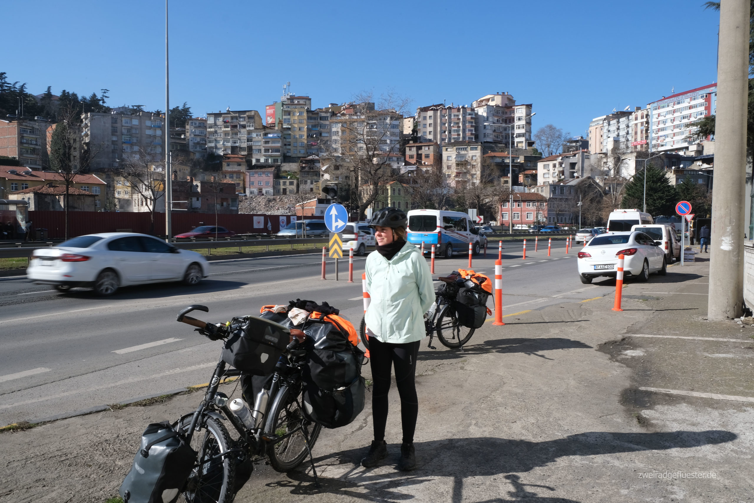 Wir rollen unsere letzten Kilometer in der Türkei. Der Verkehr auf der großen Straße wird ruhiger, jedenfalls was das Fahren angeht. Wir radeln an unendlich vielen parkenden LKW’s vorbei. Auf bestimmt zehn Kilometern Länge hat sich die Schlange angestaut, teilweise stehen die LKW’s sogar in den Tunneln. Der laufende Motor erzeugt dabei nicht unbedingt die beste Luft für Radfahrer:innen.