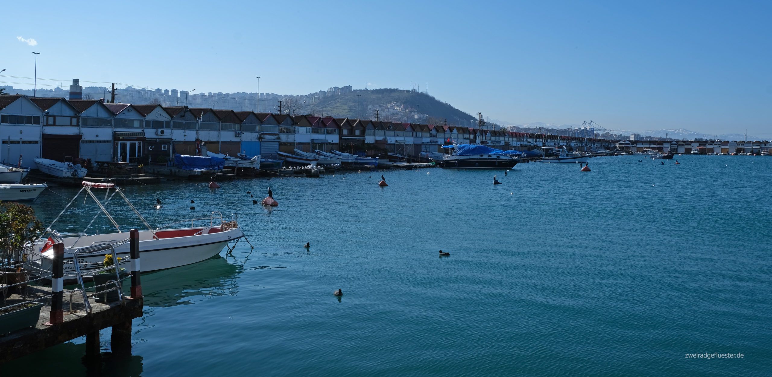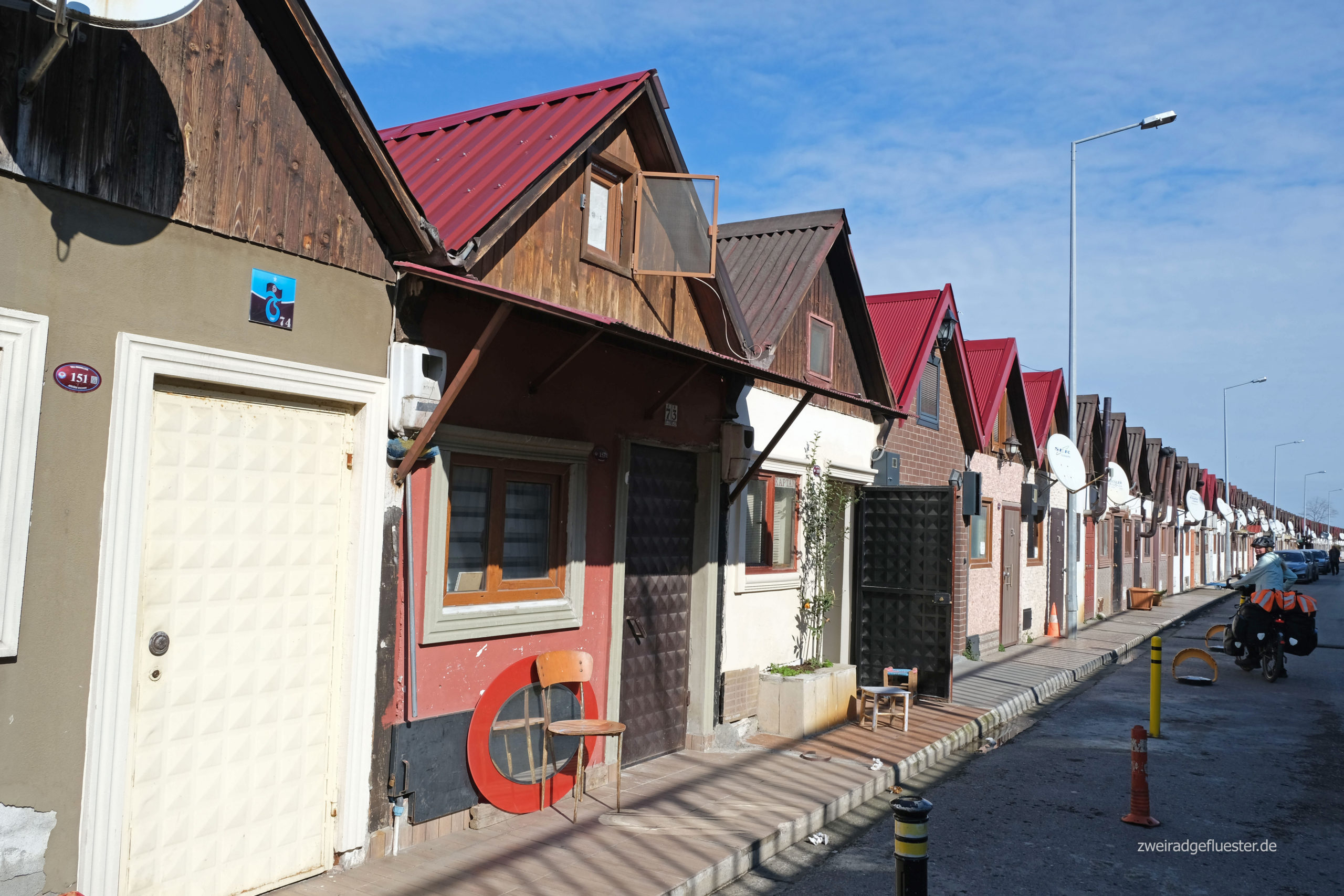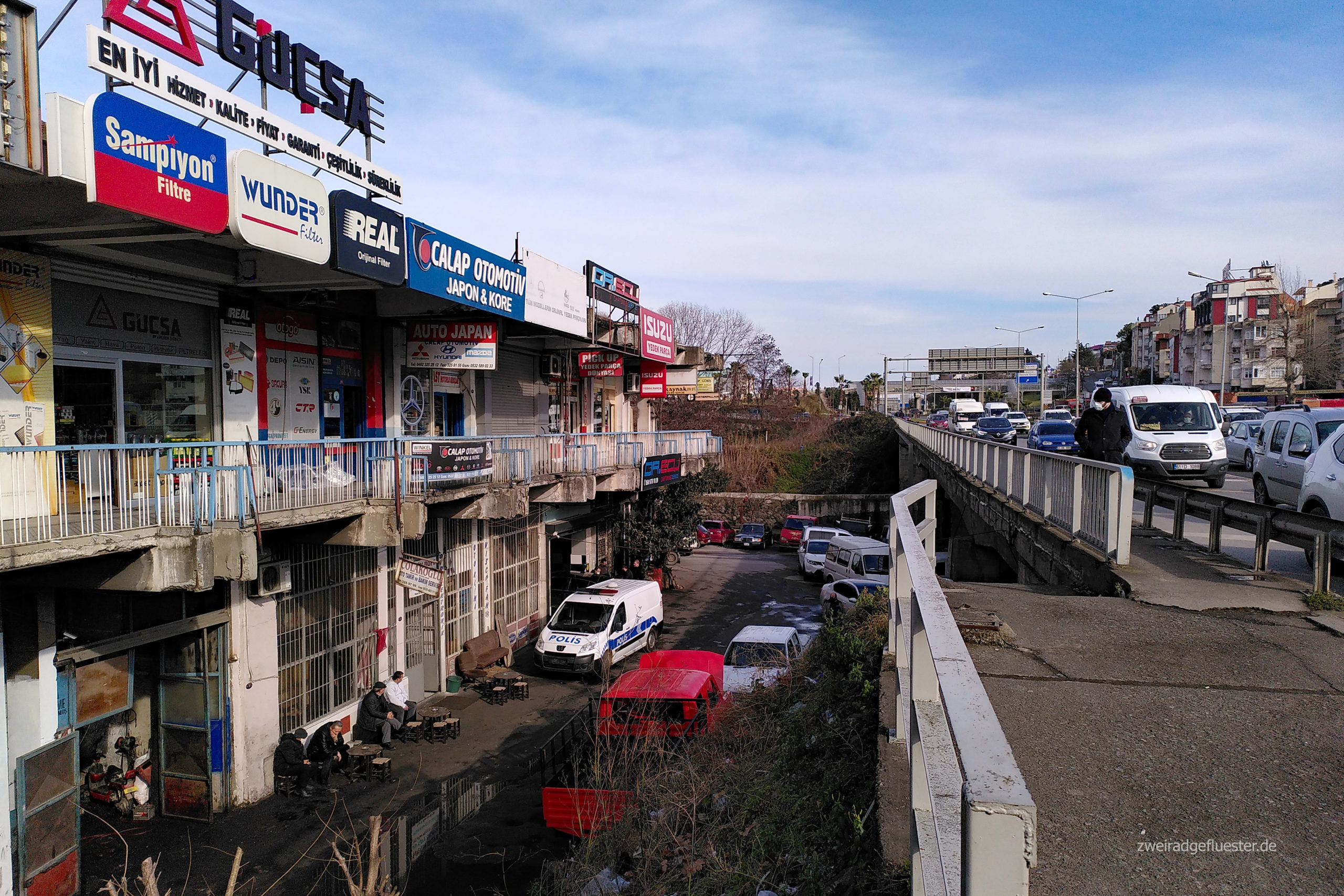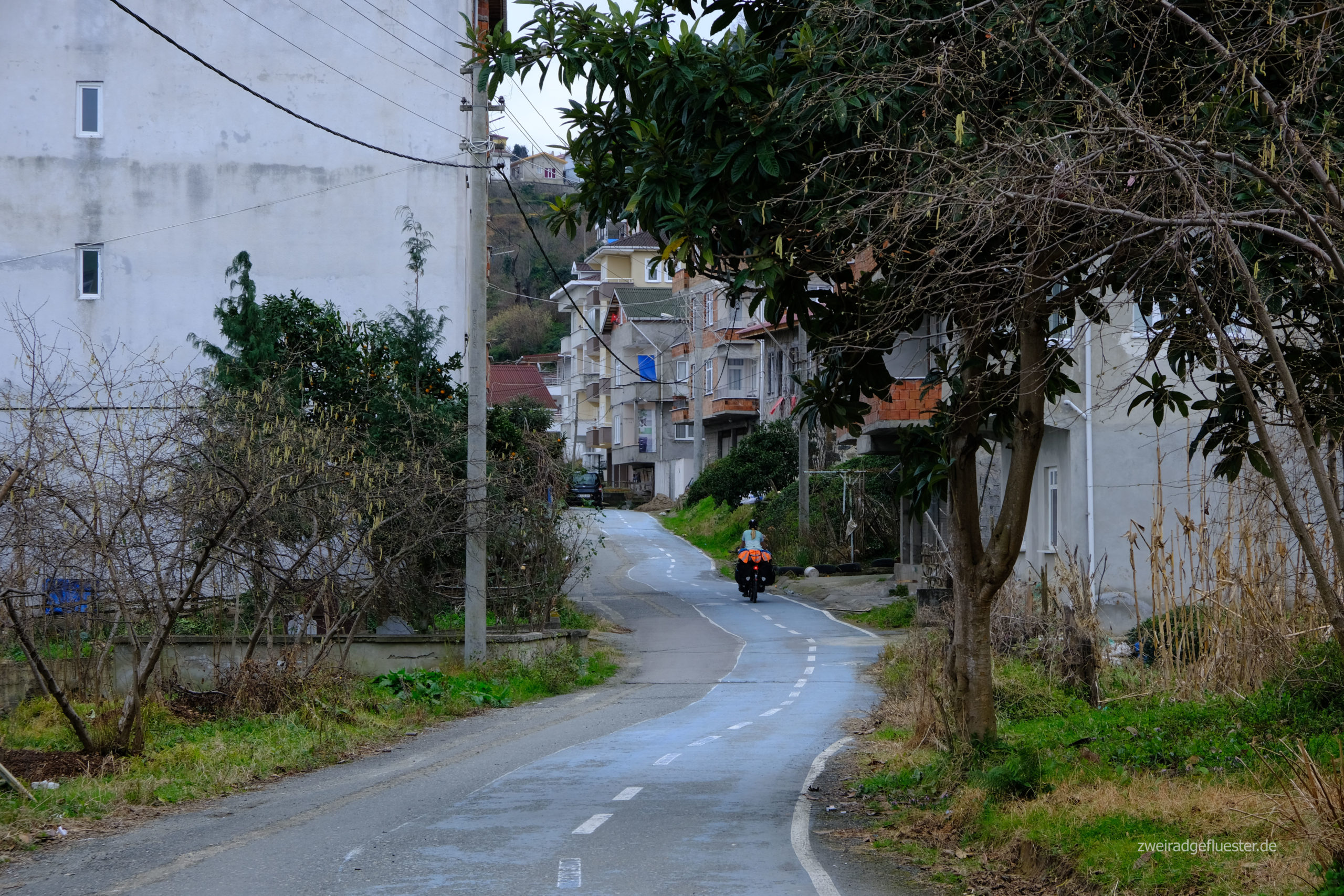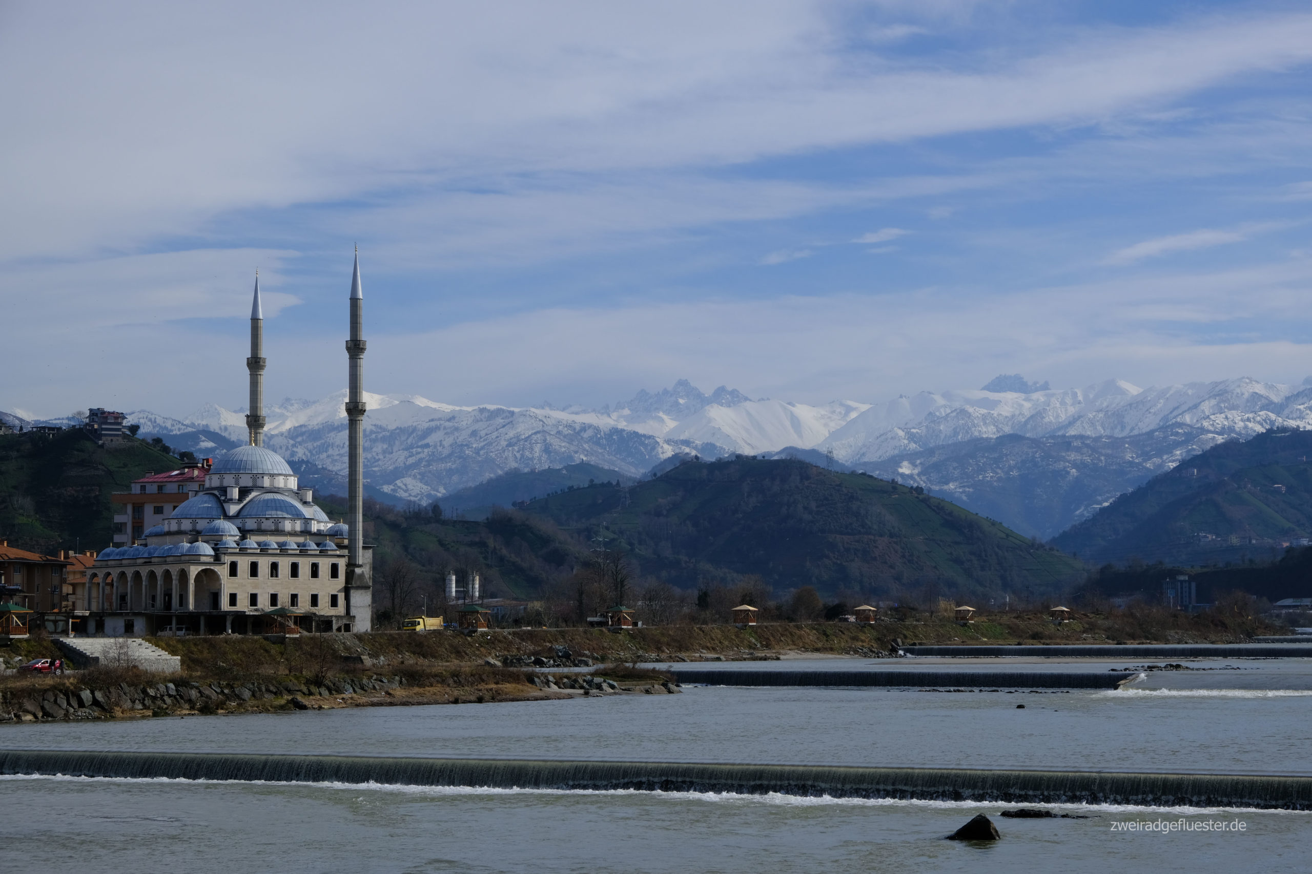 Zum Glück haben wir noch Ersatz dabei und können das Problem schnell lösen. Ein letztes Mal rollen wir die uns nun schon vertraute Strecke nach Trabzon am Meer entlang und schon bald macht sich wieder dieses unbeschreibliche Freiheitsgefühl in uns breit und die Freude wieder auf unseren Drahteseln zu sitzen überkommt uns. Wir schlängeln uns auf den bereits beim Taxifahren ausgekundschafteten, für uns günstigen Wegen möglichst immer nah am Meer entlang durchs Stadtgebiet von Trabzon. Dabei staunen wir immer wieder über das durchs Sonnenlicht besonders in Szene gesetzte, schneeweiße Bergpanorama am Horizont. Irgendwann beradeln wir dann endlich Neuland und streifen zwischen den frisch hochgezogenen Häusern und Hotels in den nachfolgenden Städten, auch viele kleine Fischereisiedlungen, die vor der riesigen Hauptstraße noch geblieben sind. Die frische, klare Winterluft und der Sonnenschein sind einfach herrlich, aber dennoch macht sich auch ziemlich schnell die Erschöpfung in unseren Körpern breit. Wir sind ziemlich im Eimer und wohl nichts mehr gewöhnt nach unserer Pause. Wir beschließen uns ein Ziel für heute zu setzen, suchen uns eine günstige Bleibe und mit der Aussicht auf ein warmes Bett und etwas Essen im Bauch radelt es sich gleich wieder leichter.