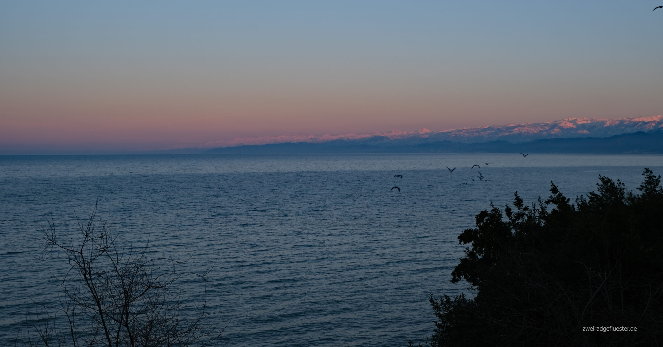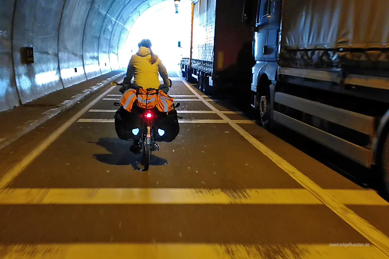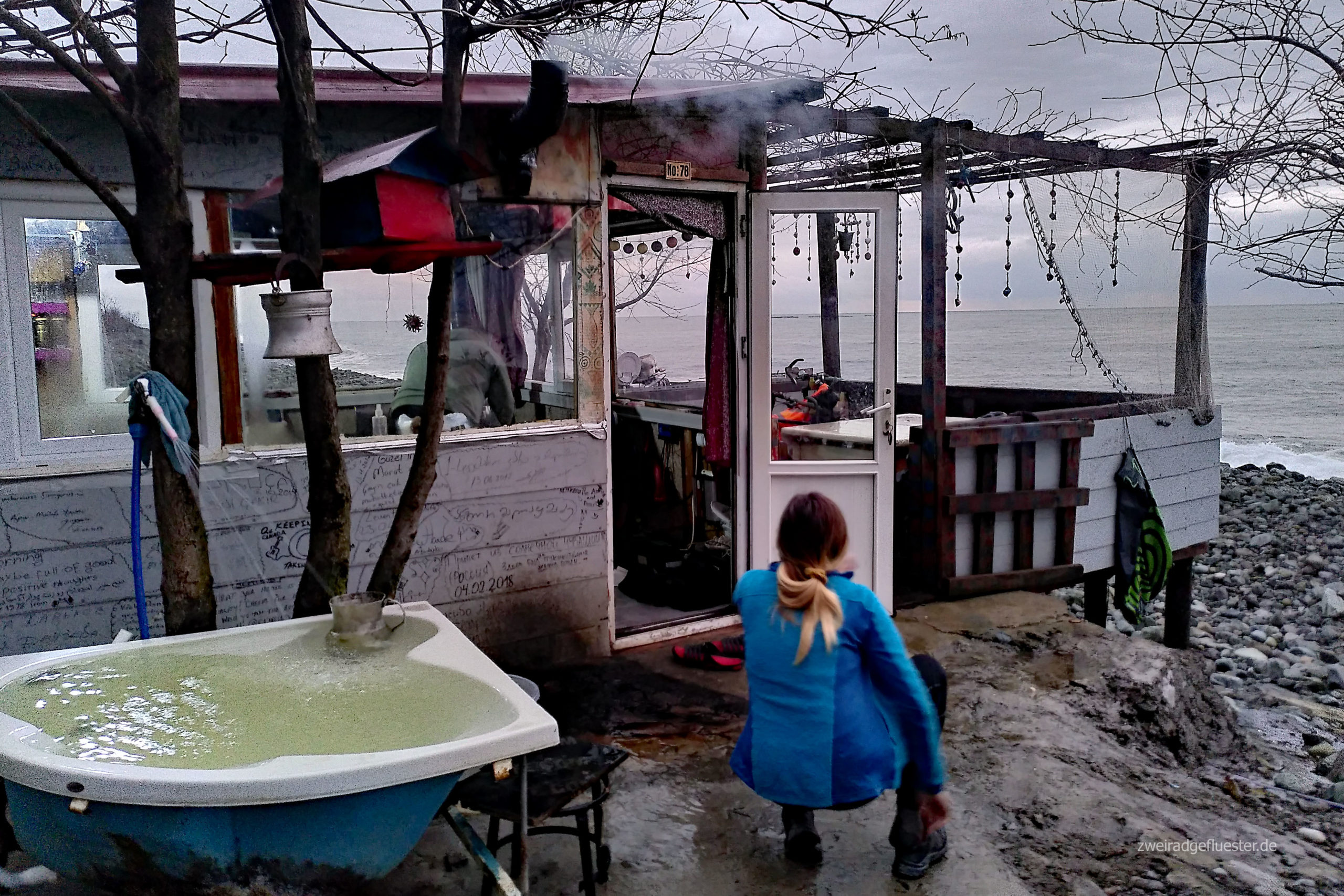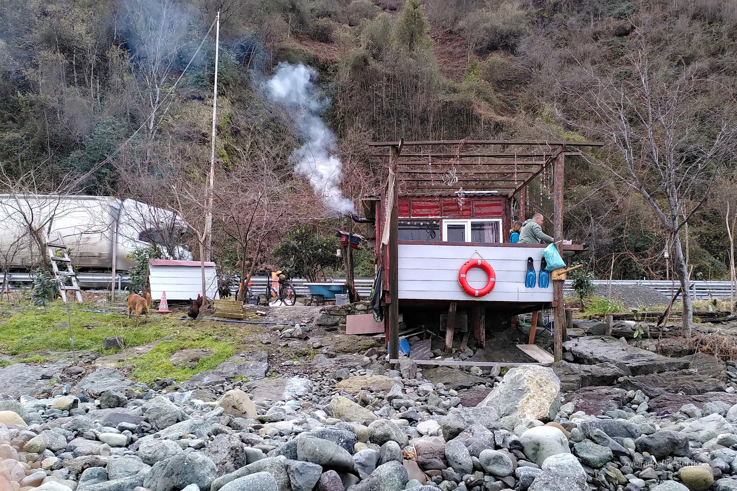 Am nächsten Tag gehts im Regen, aber bei noch immer milden Temperaturen, weiter. Eilig haben wir es bei diesem Anblick nicht. Heute werden wir endlich mal wieder über warmshowers unterkommen, aber vorher wartet noch eine Tunnelumfahrung auf uns. Danach gehts auf der Gegenspur im Baustellenverkehr weiter, bis wir Murat vor seinem kleinen Häuschen am Meer hinter der Leitblanke schon stehen sehen.
