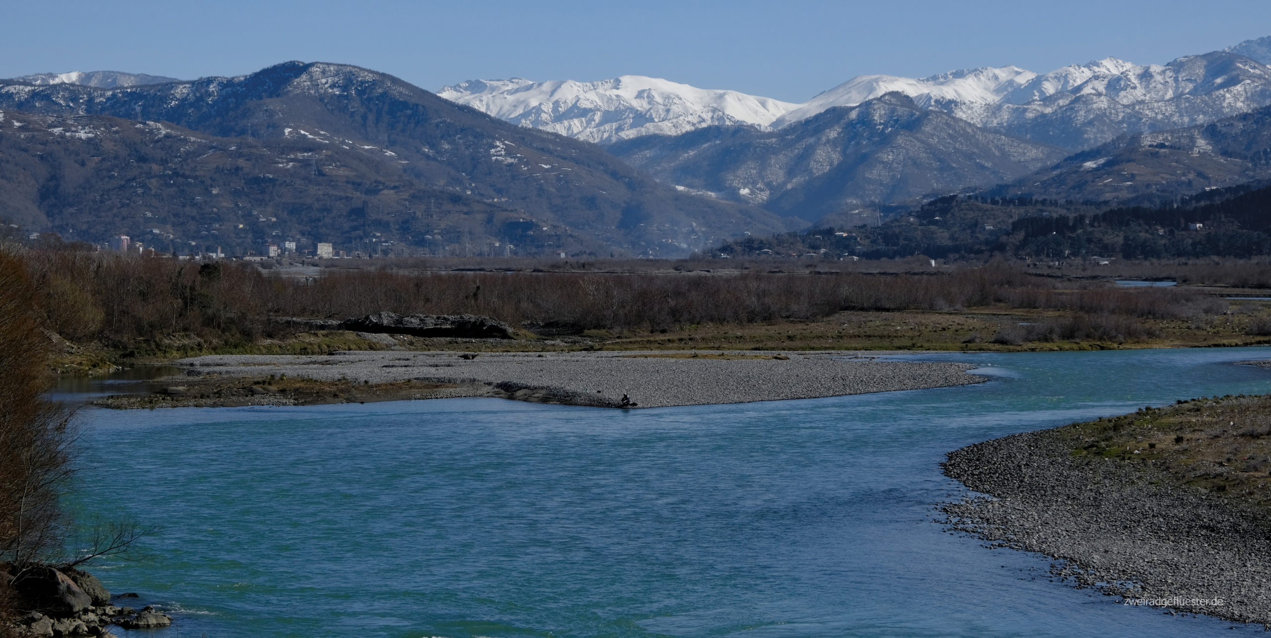 Schon wenige Meter hinter der Grenze werden wir aus unseren türkischen Tagesträumen gerissen und „Wine! Wine! Georgian Wine!“ ertönt es vom Straßenrand. Wir erblicken Kirchen statt Moscheen und Kreuze statt Mondsicheln. Wir schnuppern die ersten Eindrücke von Georgien auf und das heißt wohl vor allem auch schönster Natur zu begegnen. Der Chorokhi schlängelt sich durch die Berge und mündet in einer Sumpflandschaft im Schwarzen Meer. Im Hintergrund sieht man die massiven Berge, deren Gipfel schneebedeckt sind. Die Sonne scheint und es riecht nach Frühling. Doch vielleicht ist es auch dieses trügerische Frühlingsgefühl, was unsere Vorfreude auf Georgien dämpft, denn es ist Februar und damit steht noch ein langer, kalter Winter vor der Tür!
