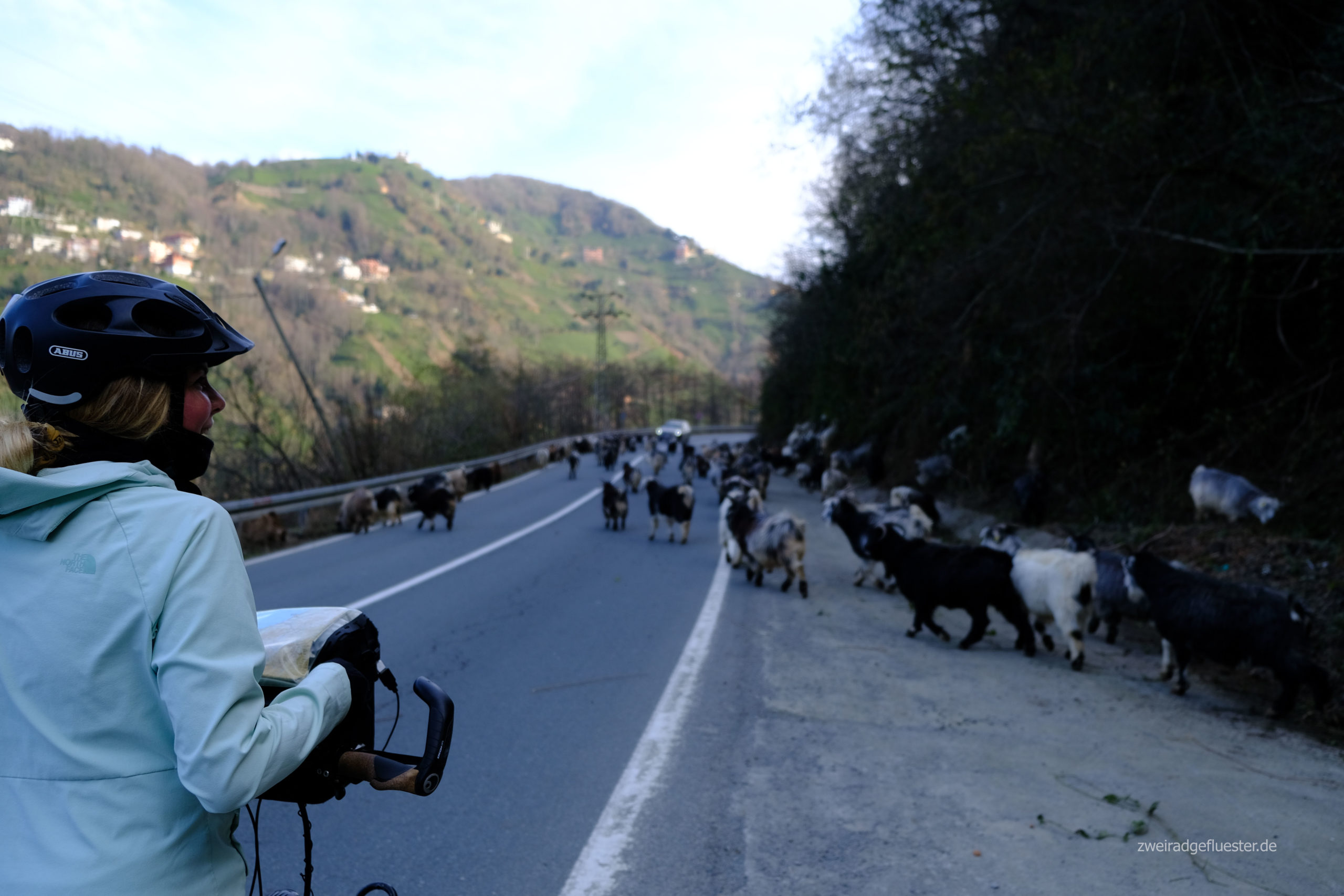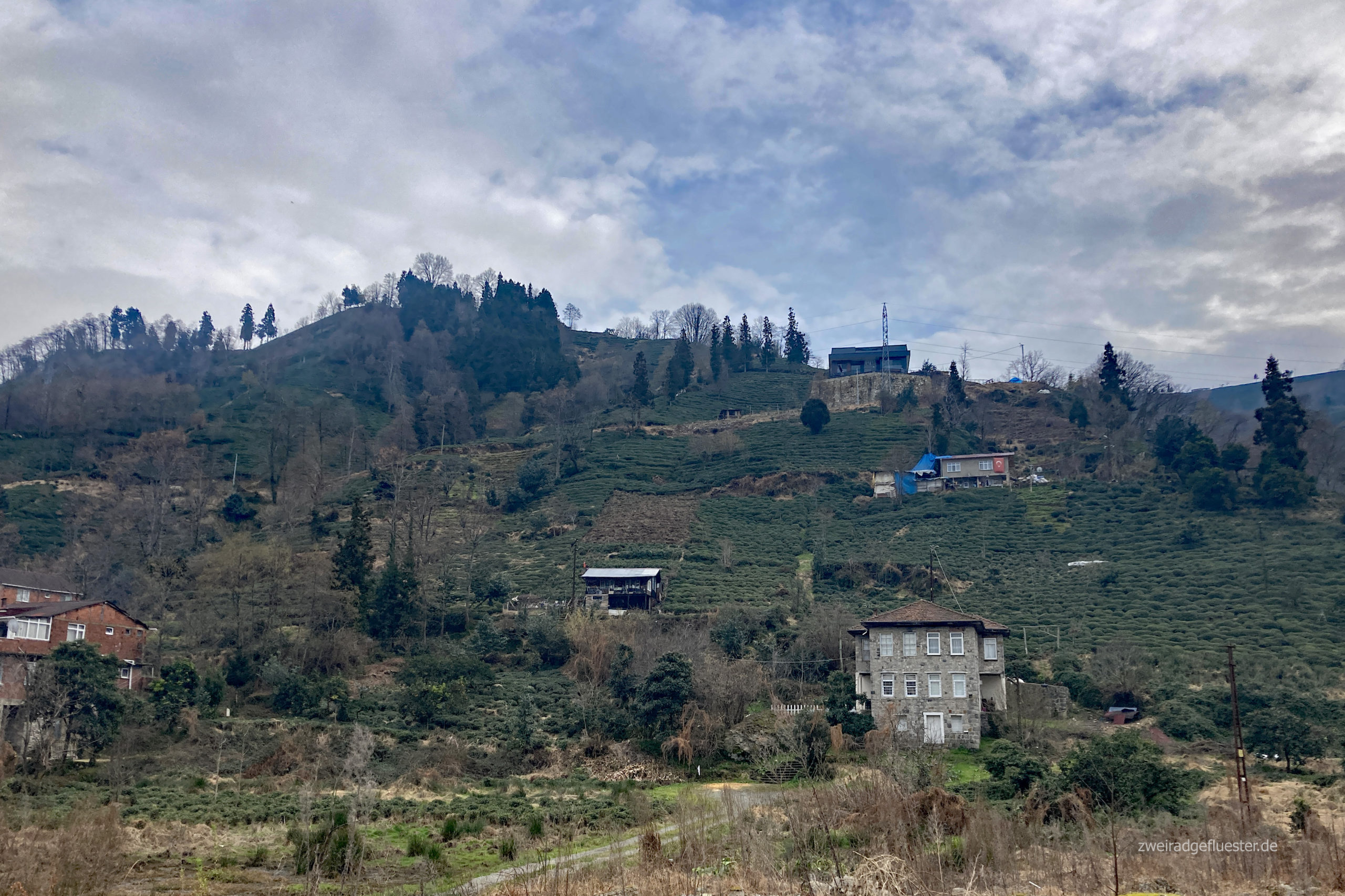 Der Weg führt uns immer weiter an der Küste entlang und es gelingt uns auf der alten Küstenstraße sogar ziemlich gut, dem großen Asphaltmonster zu entkommen. Auch wenn wir ab und an mal eine abenteuerliche Tunnelumgehung bewältigen müssen. Bei milden 17 Grad kommt bei uns direkt Frühlingsstimmung auf und wir können sogar hin und wieder im T-Shirt radeln. Überraschenderweise beginnt plötzlich eine alte Radstraße durch gemütliche Dörfer. Hier erblicken wir zum ersten Mal die Teepflanzen, die hier in einem saftigen Grün auf den steilen Hängen nahezu überall wachsen. Die Region um Rize ist das Hauptanbaugebiet für den Schwarzen Tee in der Türkei. Aus diesem Grund fahren wir hier auch sehr oft an Cayfabriken vorbei. In Rize sieht man uns die Erschöpfung vom Radeln in einem Supermarkt wohl an und der Verkäufer bringt uns nach unserem Einkauf erstmal einen Cay vor die Tür. Wenig später kommt dann auch noch die Kassiererin mit einer Tasse voller Lokum raus. Genau diese Energizer haben wir gebraucht und können nun beflügelt weiterradeln.