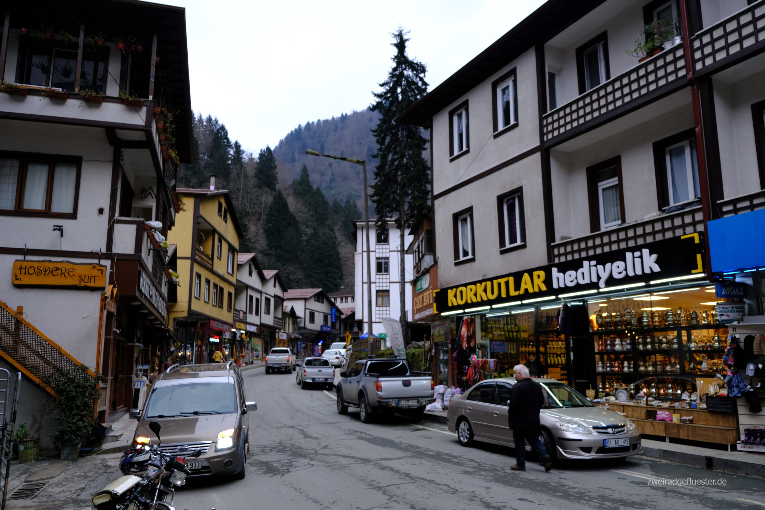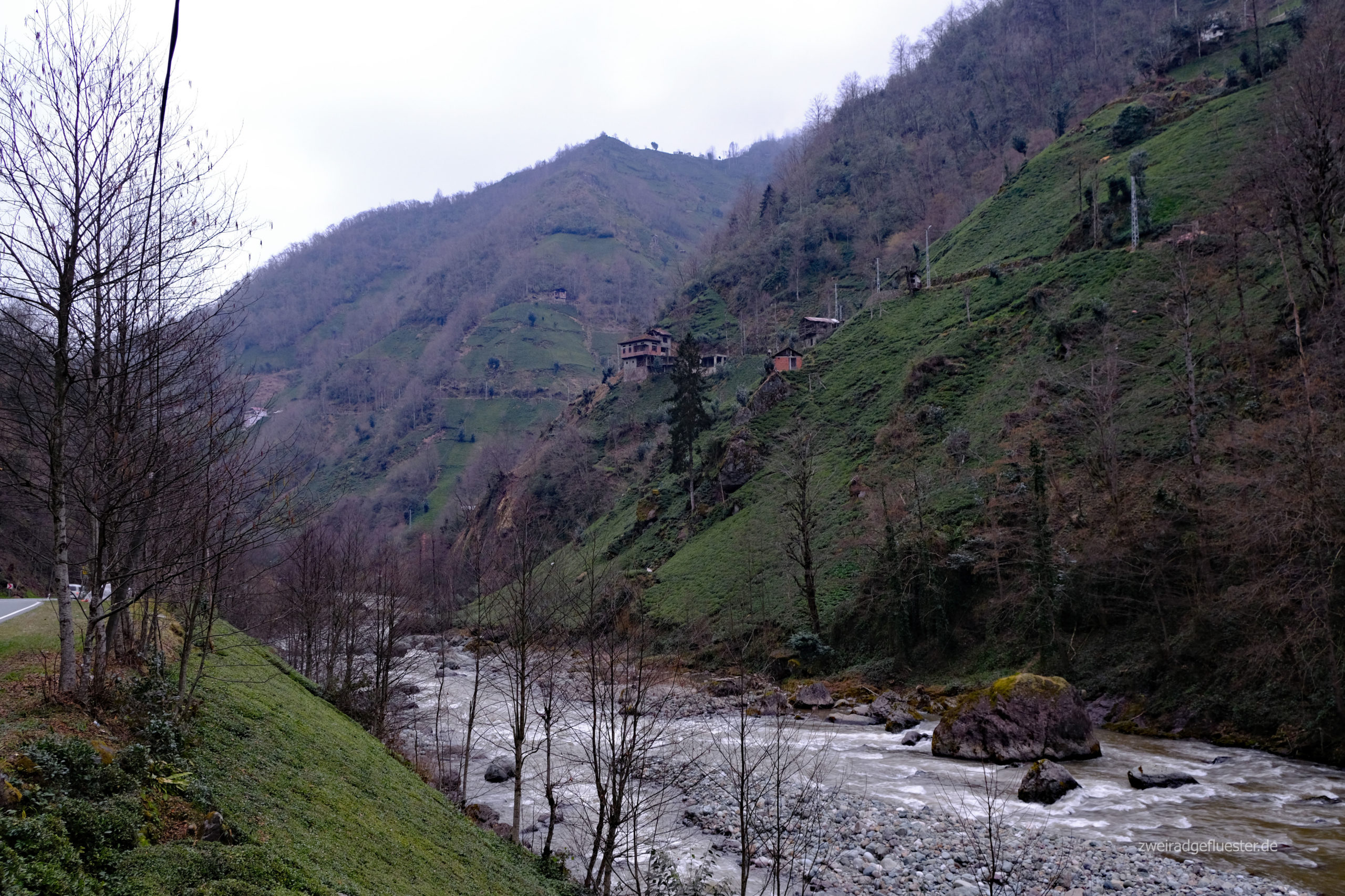 Zwar gelingt uns immer mal wieder ein Ausweichen auf Seitenstreifen, Seitenstraßen und co., aber dennoch ist die Geräuschkulisse der stark befahrenen Hauptstraße immer vorhanden, obwohl links von uns das Meer liegt und rechts von uns die steilen, grünen Hänge gen Himmel ragen. Es könnte so schön sein. Aus diesem Grund beschließen wir, dass wir uns eines der Täler noch einmal genauer anschauen wollen, um der eigentlich schönen Natur der Region wieder etwas näher zu kommen. Wir biegen also in Ardeşen ins Tal des Fırtına Deresi ein und werden direkt mit einem herrlichen Blick auf die Berge empfangen.