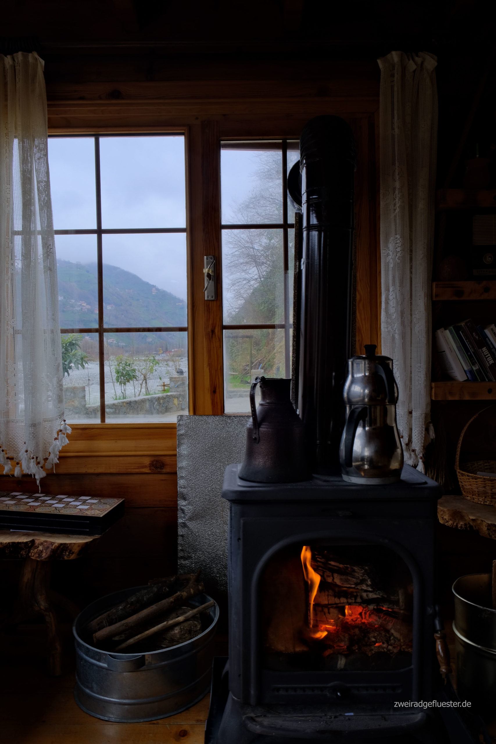 Wir landen letztendlich im Dere Evi, einem kleinen, gemütlichen Holzhäuschen von Turan, direkt am plätschernden Gebirgsflüsschen. Nach der Begrüßung trinken wir einen kahve zusammen und immer wieder stellt er beim Anblick unserer bepackten Esel fest, dass wir normal yok, also nicht normal sind. Ohne Gepäck machen wir uns auf den Weg ins Tal und es ist einfach traumhaft. Endlich überwiegen wieder die Naturgeräusche in unseren Ohren. Überall plätschert es, Wasserfälle laufen von den Gipfeln über die gesamten Berge hinunter, es ragen die Teebüsche aus der Erde und alles erstrahlt dadurch auch im Winter in einem saftigen Grün. Bei unserer Ankunft kurz vor der Dunkelheit lodert bereits das Feuer im Ofen. Turan fragt, ob wir mit ihm essen wollen und so kochen wir Nudeln und er grillt draußen Brote mit sucuk. Nach dem Essen sitzen wir noch eine Weile gemeinsam am Feuer, trinken çay und telefonieren mit seinem Kumpel aus Deutschland. Durch das Plätschern des Flusses und die prasselnden Regentropfen auf dem Dach schlummern wir nachts tief und fest.