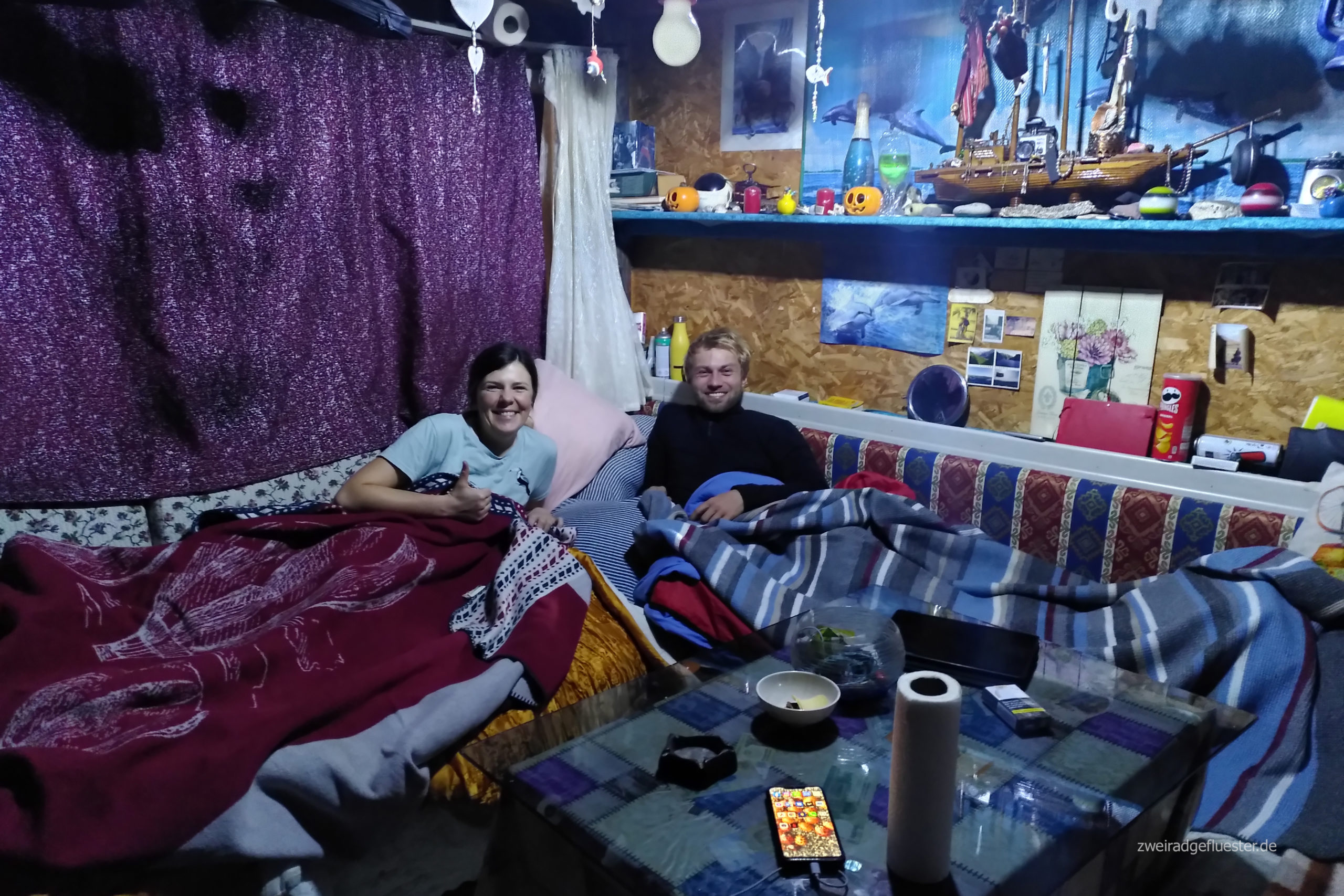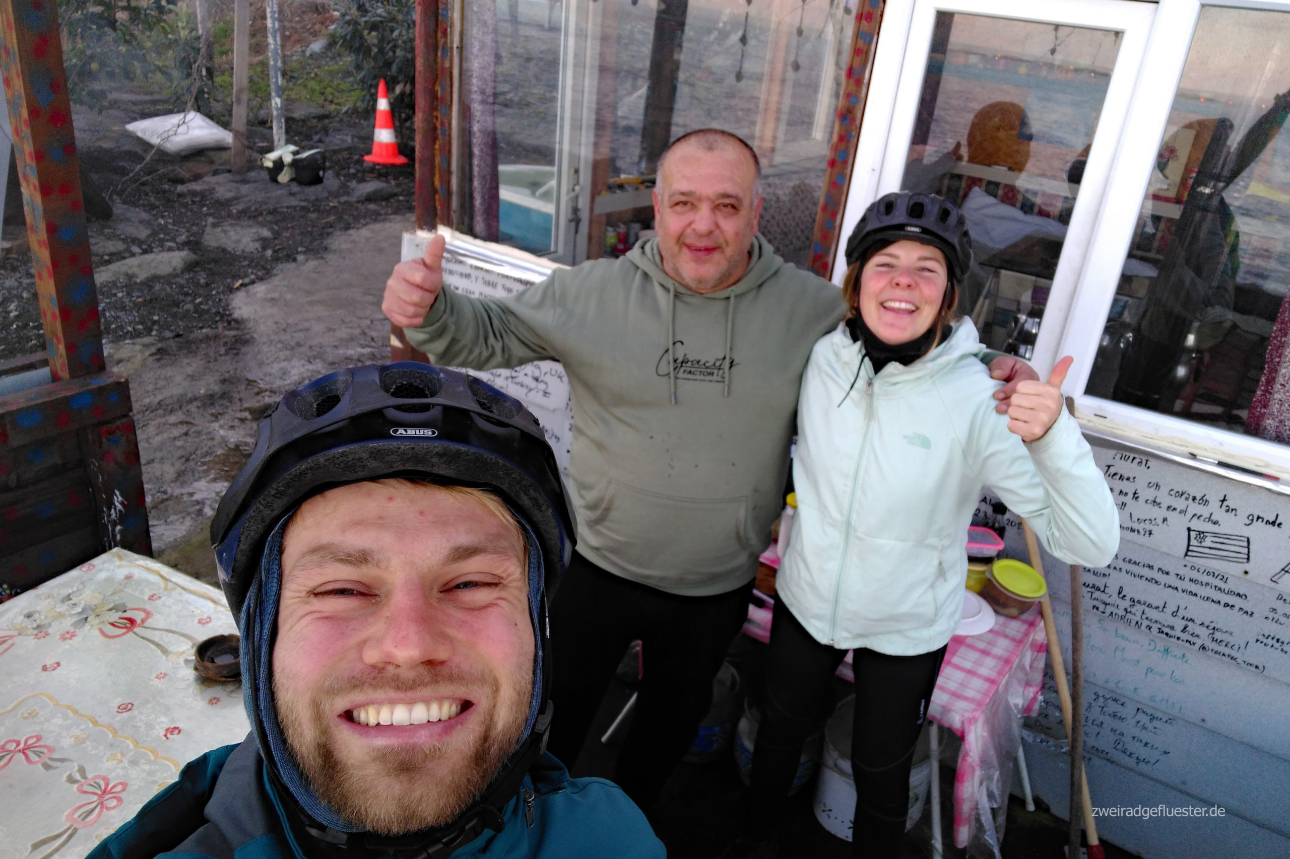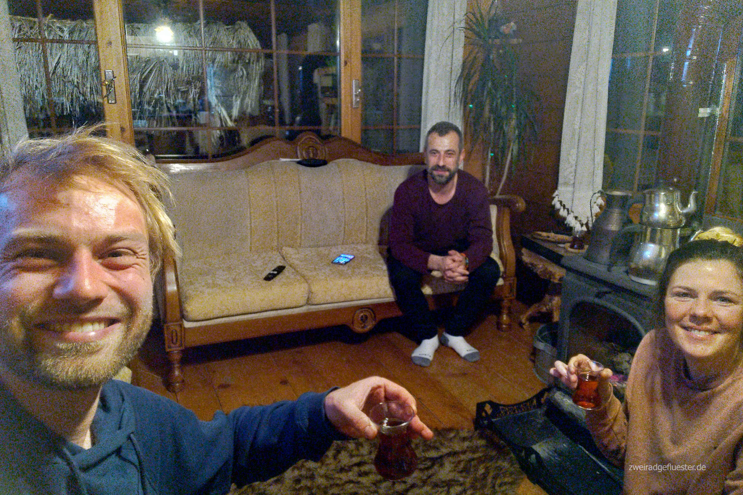 Herzlich werden wir begrüßt und dann hieven wir unsere Räder über die Leitblanke und Murat zeigt uns sein kleines Paradies, was er sich mit der Unterstützung von ein paar Freunden, wahrscheinlich so halblegal, innerhalb von ein paar Tagen aufgebaut hat. In der kuscheligen Einzimmerwohnung lodert der Ofen und wir trinken erst einmal einen heißen çay zusammen.