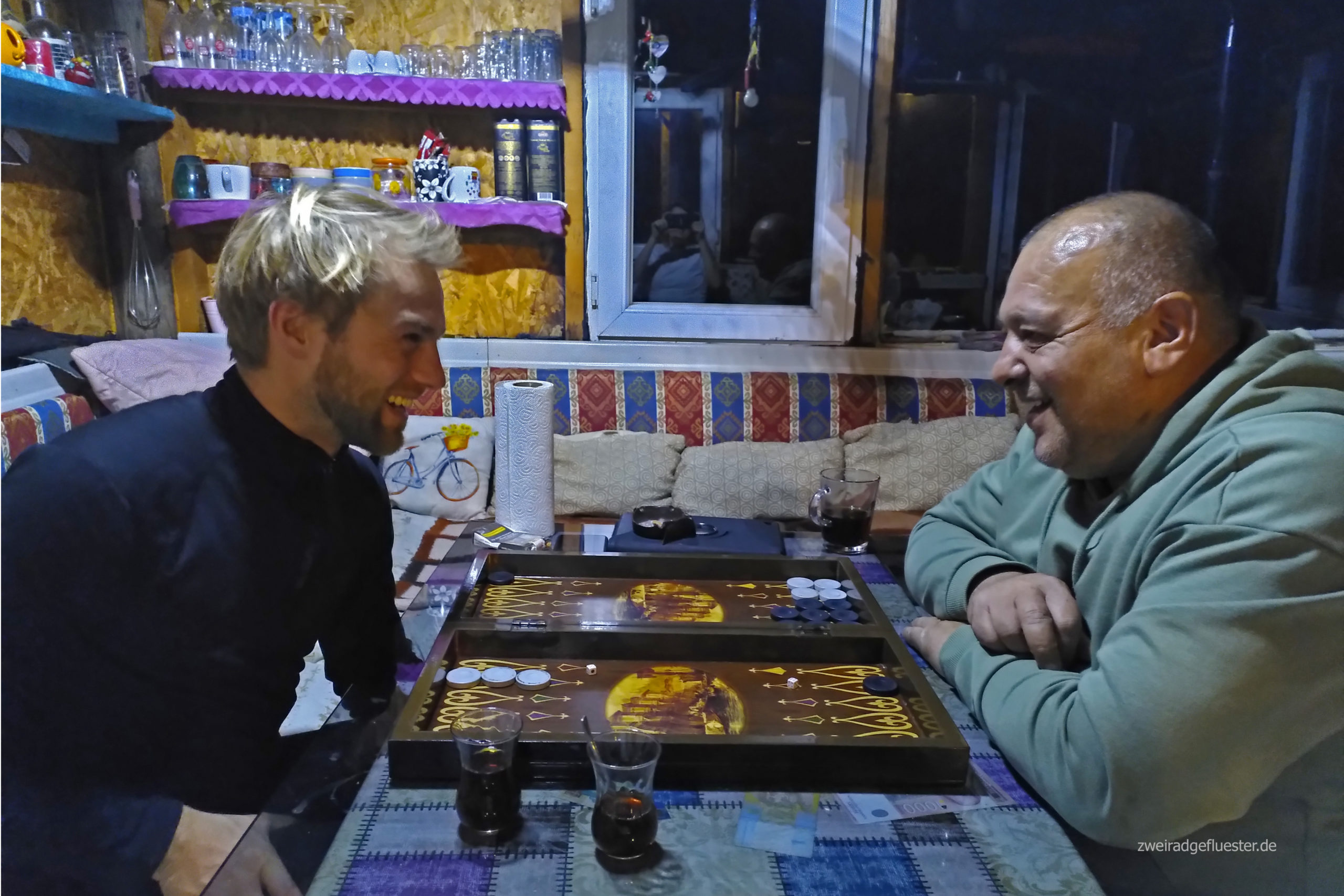 Die Sonne verschwindet in der brausenden See und wir gehen zum Abendprogramm über. In einer kleinen Ecke entdecken wir ein tavla-Spiel und berichten Murat stolz, dass wir auch schon ab und an mal gespielt haben. Im Handumdrehen war das Spiel aufgebaut, es gab immer mehr çay und Murat rauchte eine nach der anderen, um dem Ambiente eines Teehauses auch in nichts nachzustehen. Die kleinen Würfel werden halb schnipsend aus der Hand in das Spielfeld geworfen und falls es bei einem Spielzug eine zu lange Denkpause gibt, übernimmt Murat ihn gleich für uns mit. Nach einigen Runden verrücken wir den Tisch, holen Decken unter dem Sofa hervor und in kürzester Zeit haben wir drei kleine Schlafnischen in der gemütlichen Einzimmerwohnung gezaubert. Es wird noch ein letztes Mal Holz aufgelegt, um dann bei Meeresrauschen auf der einen und vorbei rasenden LKWs auf der anderen Seite in den Schlaf zu finden.