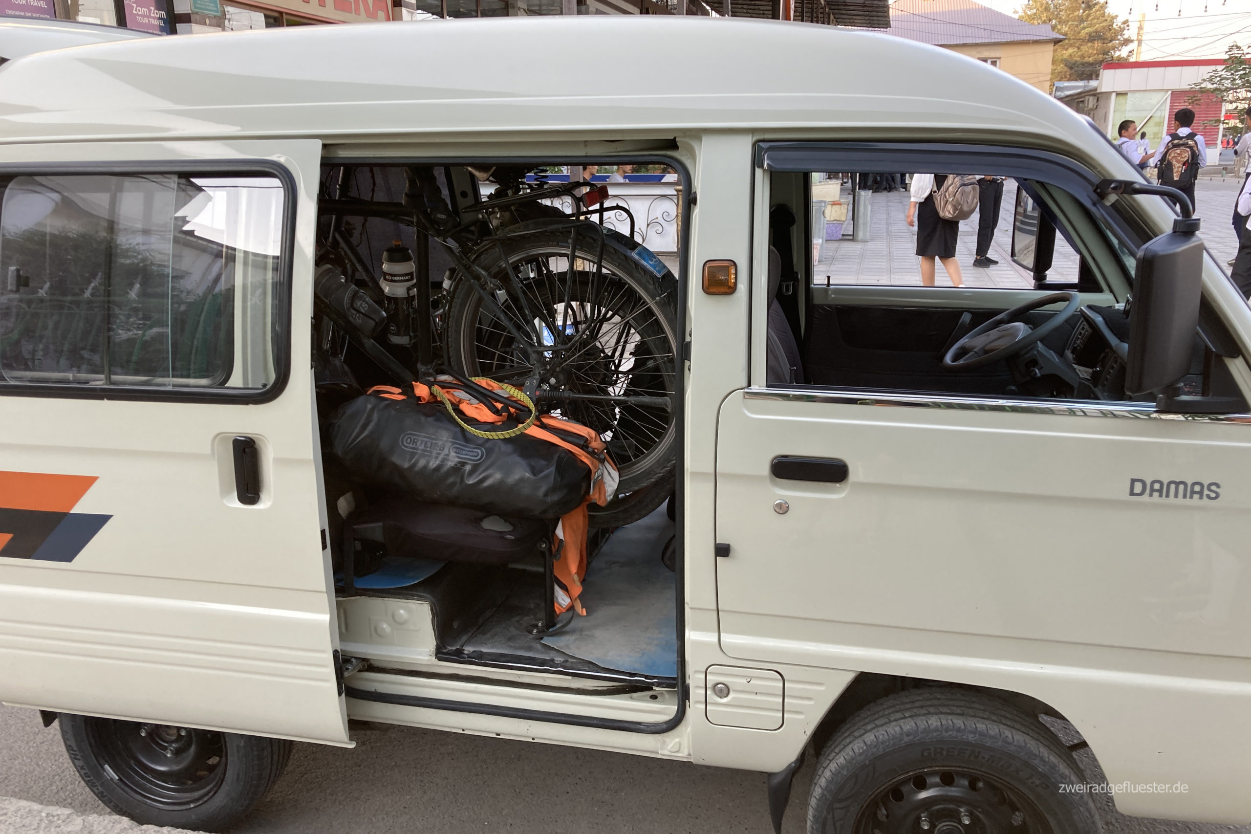 Da wir mal wieder etwas planlos unterwegs sind, hatten wir bei unserer Abfahrt in Osh nicht so ganz auf dem Schirm, dass der große Bazaar im Fergangatal, den wir unbedingt besuchen wollen, nur sonntags und donnerstags stattfindet. Wir haben es aber zum Glück noch rechtzeitig bemerkt und so testen wir nach einem Tag auf dem Rad gleich mal, ob die Büsschen auch fahrradtauglich sind.