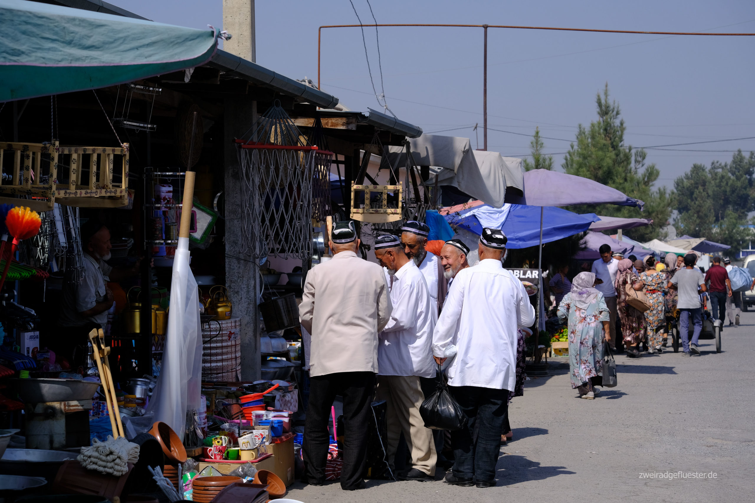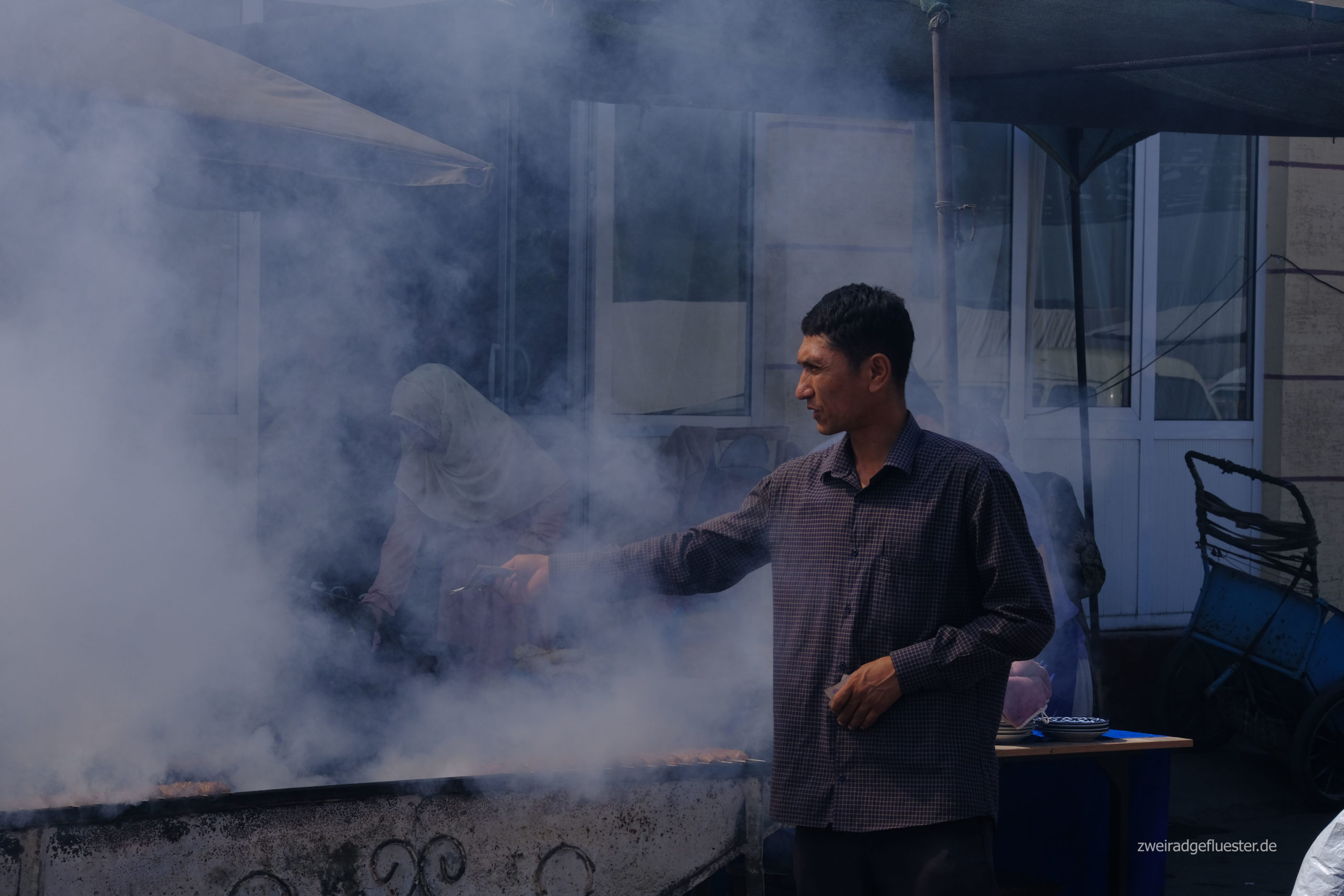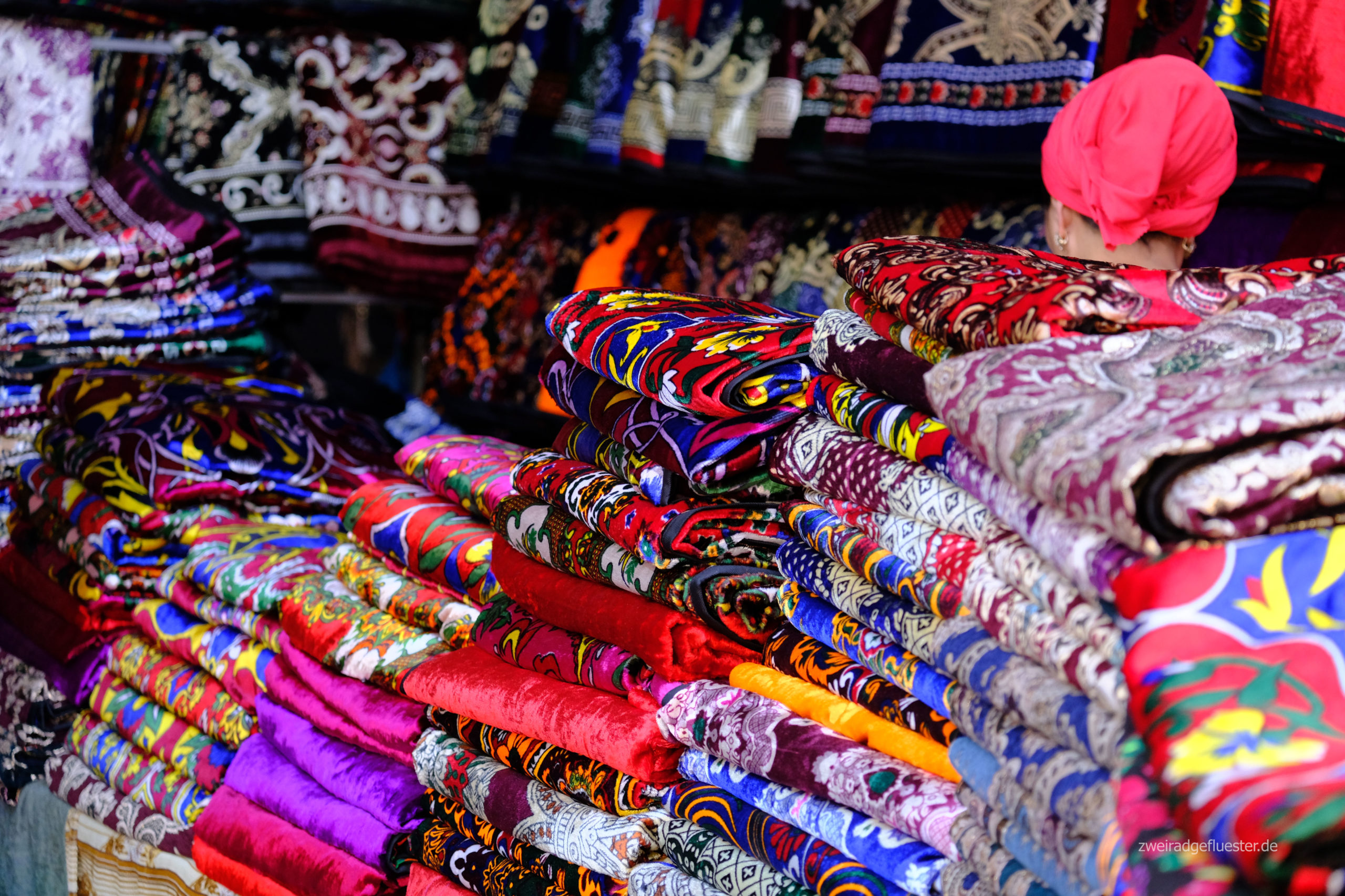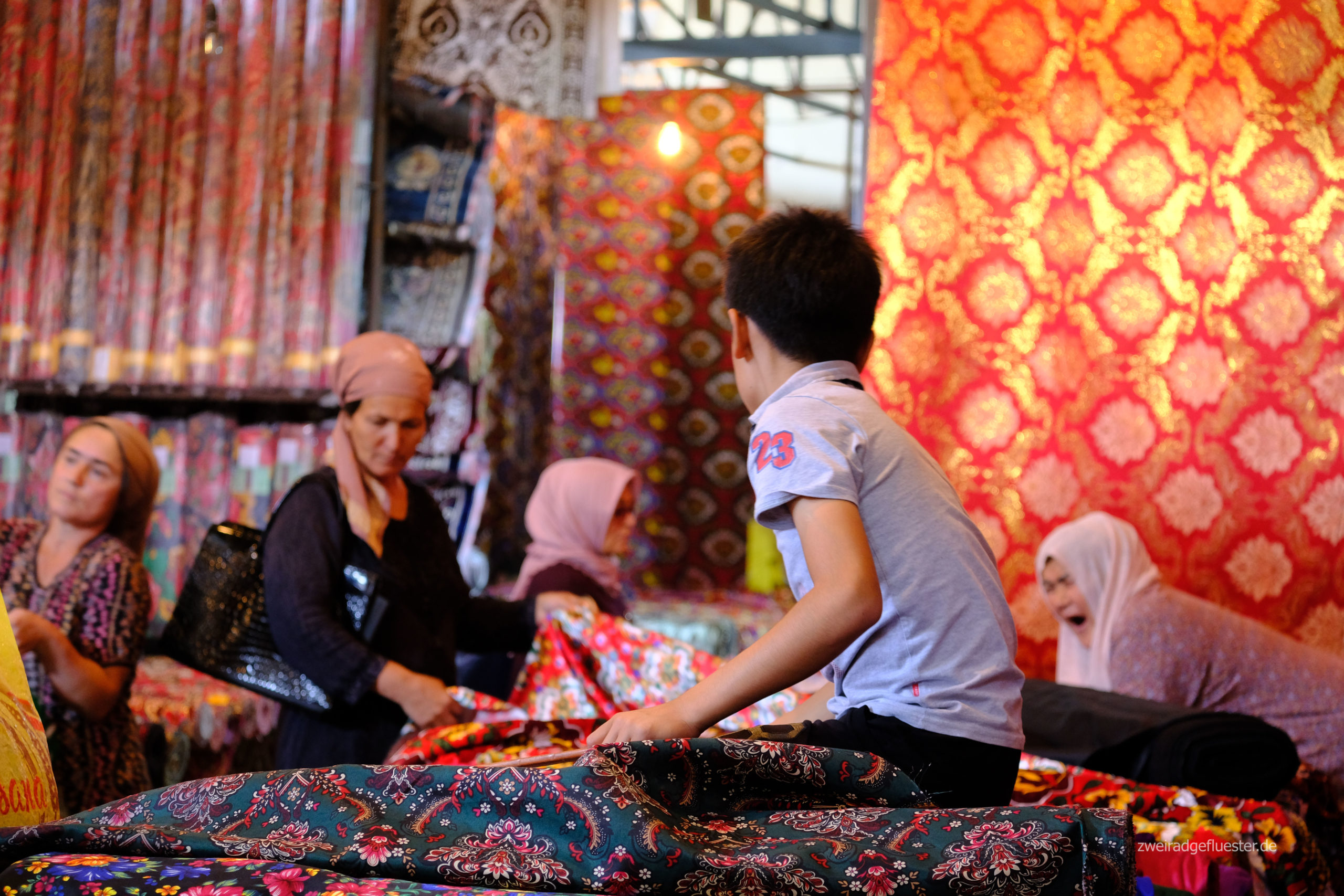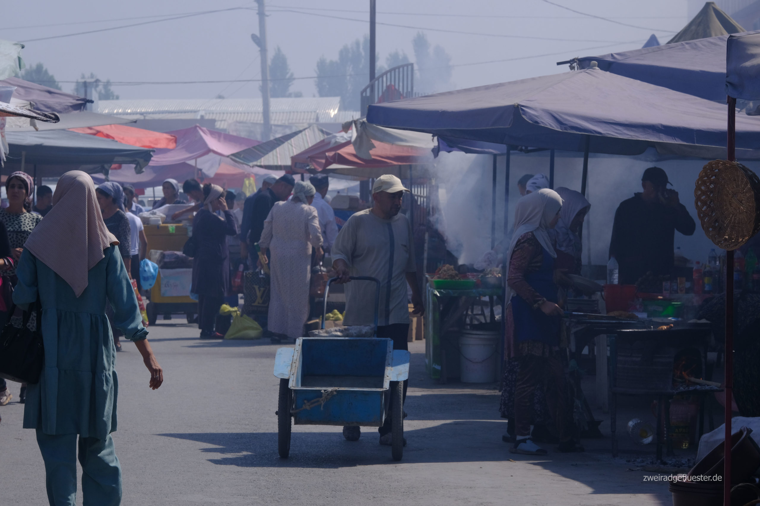 Am Abend erreichen wir so dann doch noch Margilon und können am Sonntag gemeinsam mit Guéno und Antoine den berühmten Kum Tepa Bazar besuchen. Es ist eine wahre Freude durch die mal bunten, mal dampfenden, wuseligen Gassen zu schlendern. Es gibt mal wieder alles was das Herz begehrt. Von bunten Seidenstoffen über Fahrradersatzteile bis hin zu leckerstem Obst und Gemüse. Überall sollen wir probieren und es wird wieder so herzlich gelacht und fleißig gewunken. Wir fühlen uns sehr wohl hier.