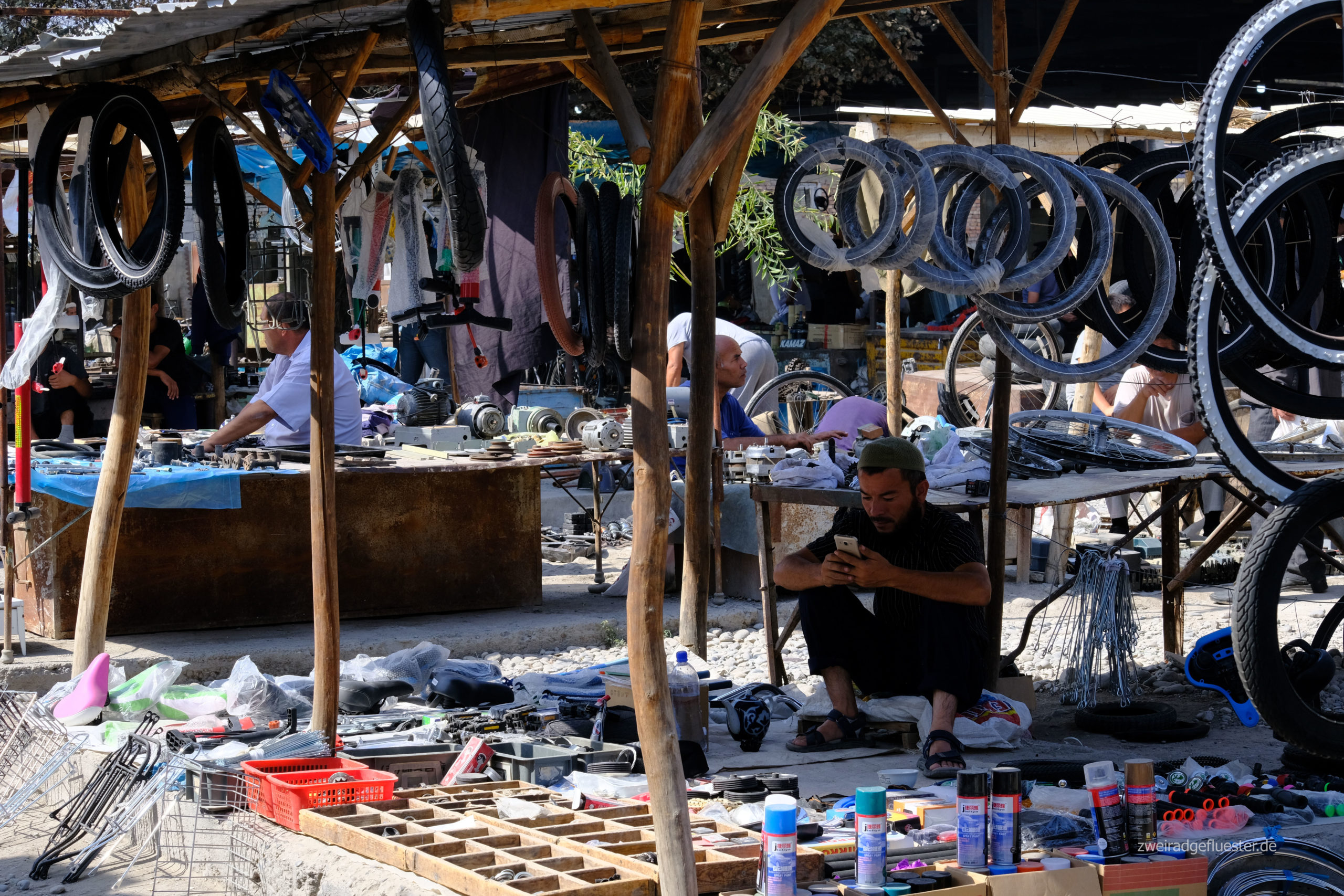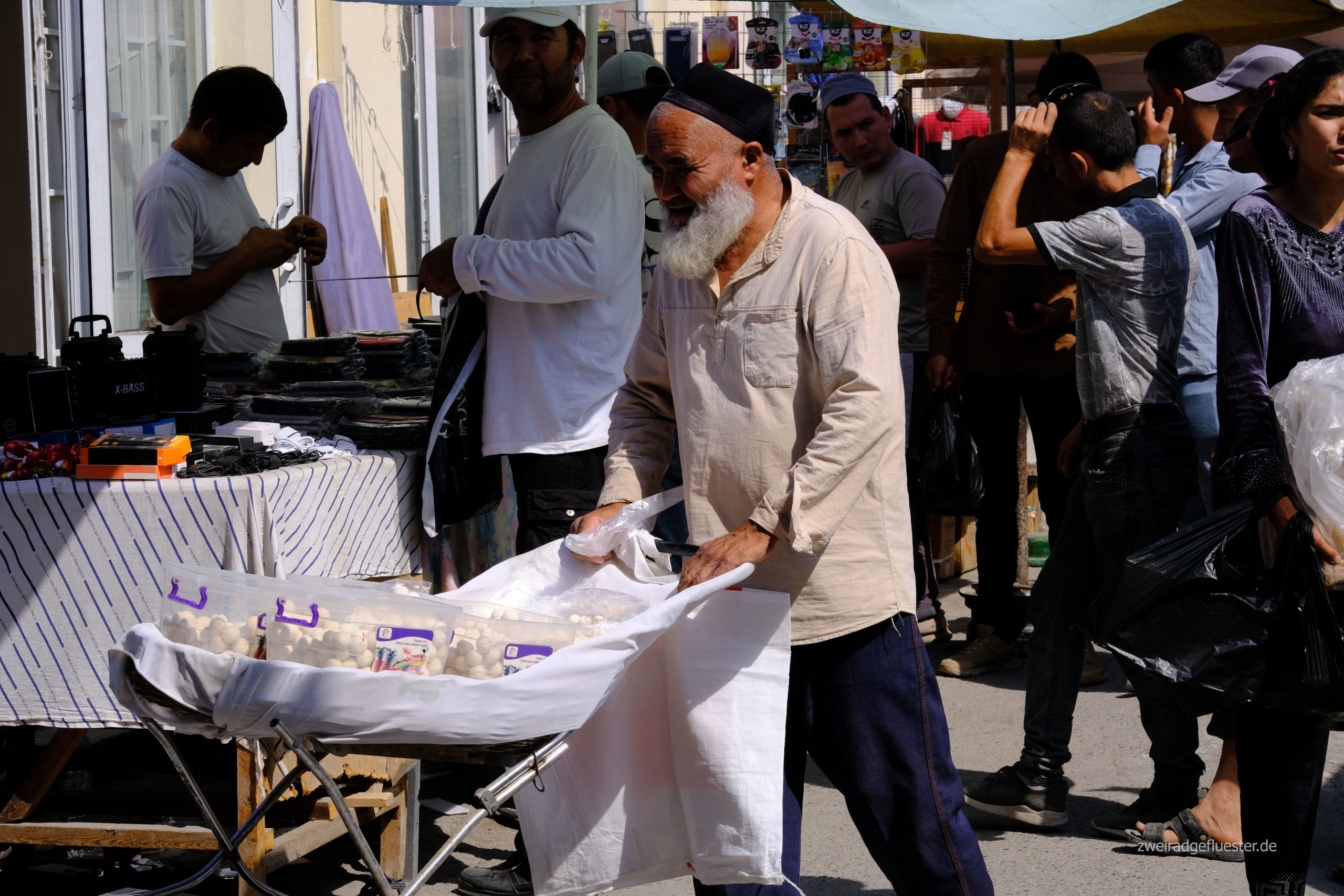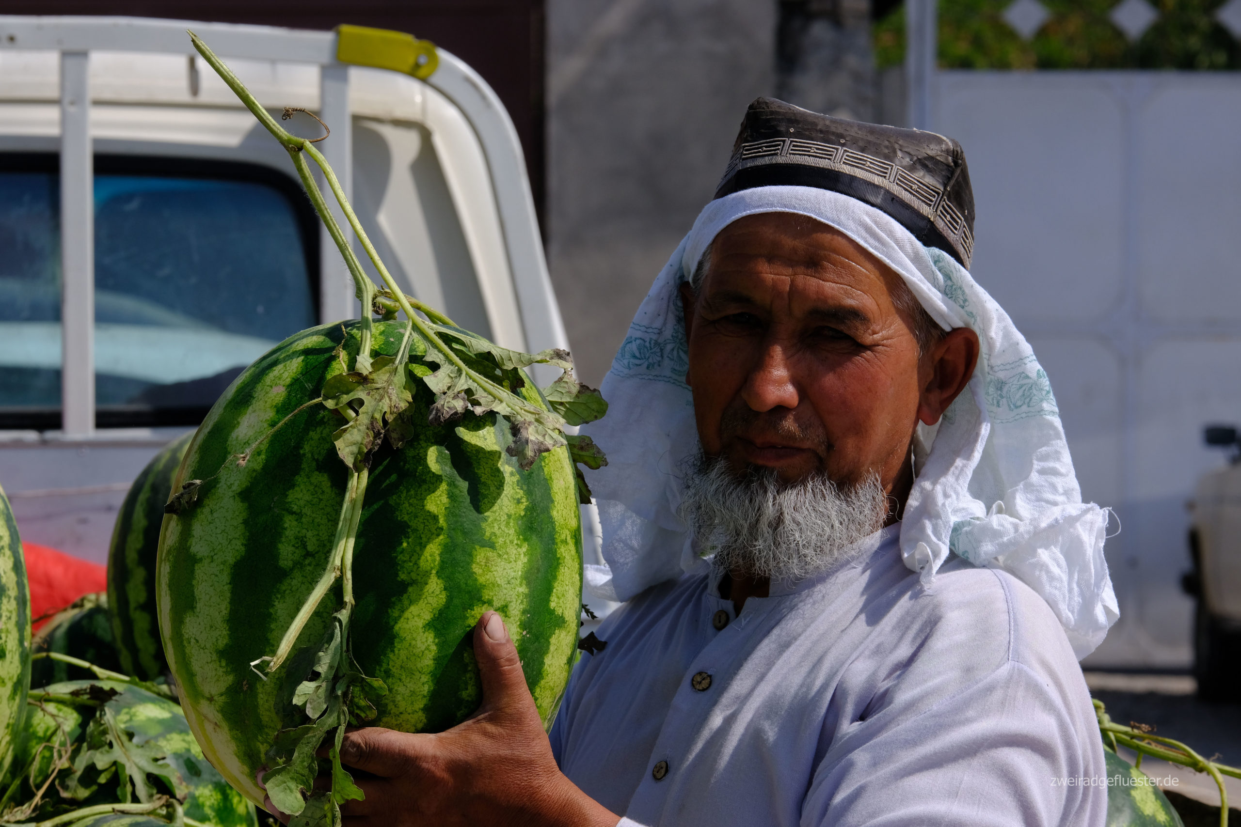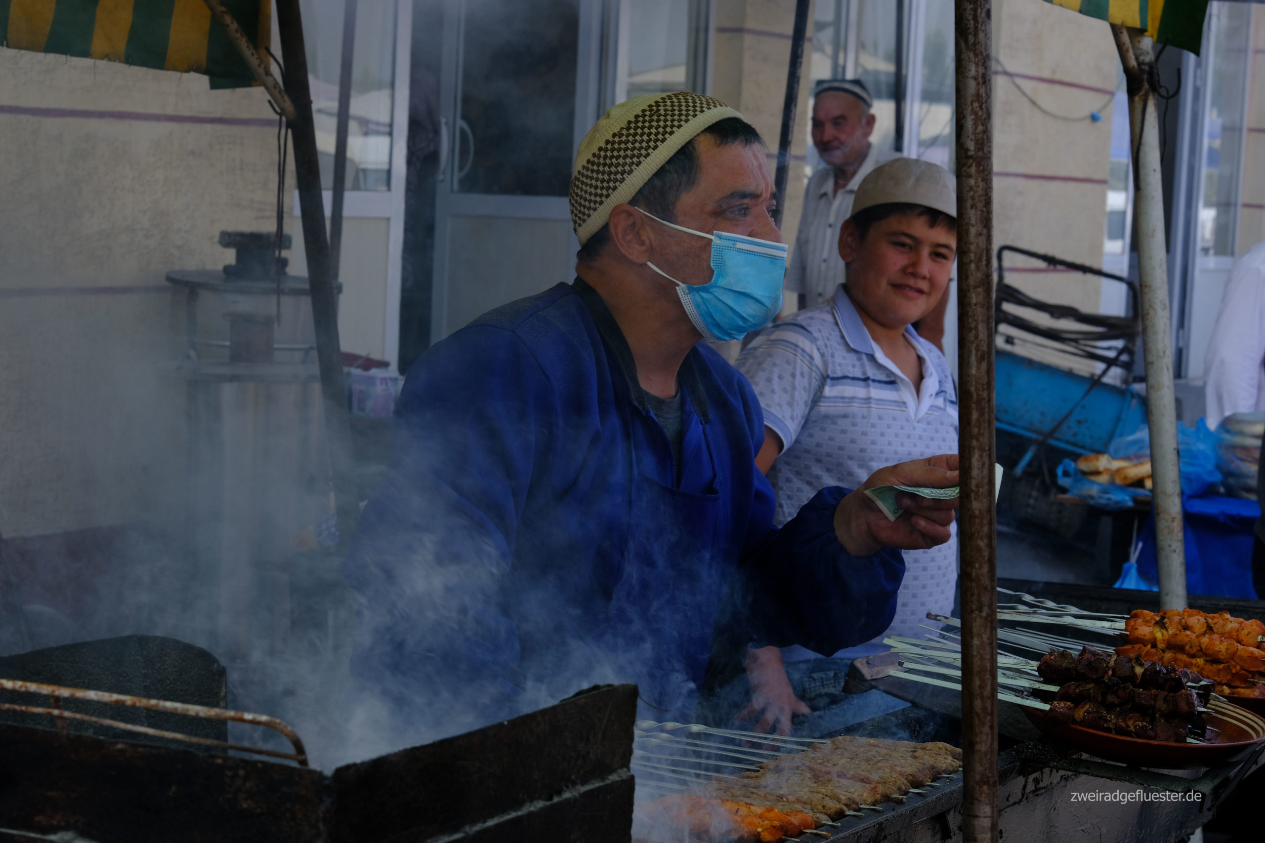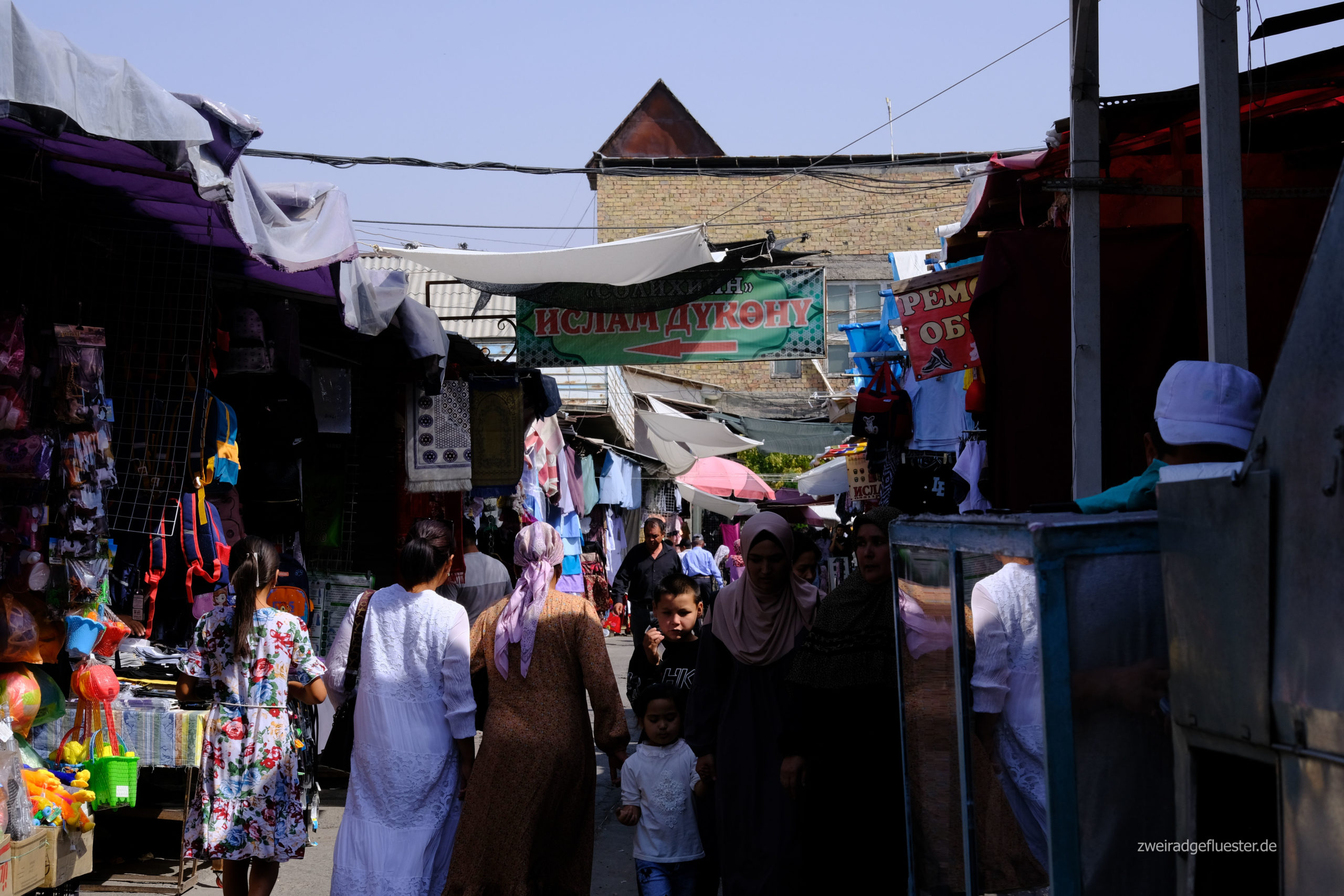 Am Abend erreichen wir so dann doch noch Margilon und können am Sonntag gemeinsam mit Guéno und Antoine den berühmten Kum Tepa Bazar besuchen. Es ist eine wahre Freude durch die mal bunten, mal dampfenden, wuseligen Gassen zu schlendern. Es gibt mal wieder alles was das Herz begehrt. Von bunten Seidenstoffen über Fahrradersatzteile bis hin zu leckerstem Obst und Gemüse. Überall sollen wir probieren und es wird wieder so herzlich gelacht und fleißig gewunken. Wir fühlen uns sehr wohl hier.